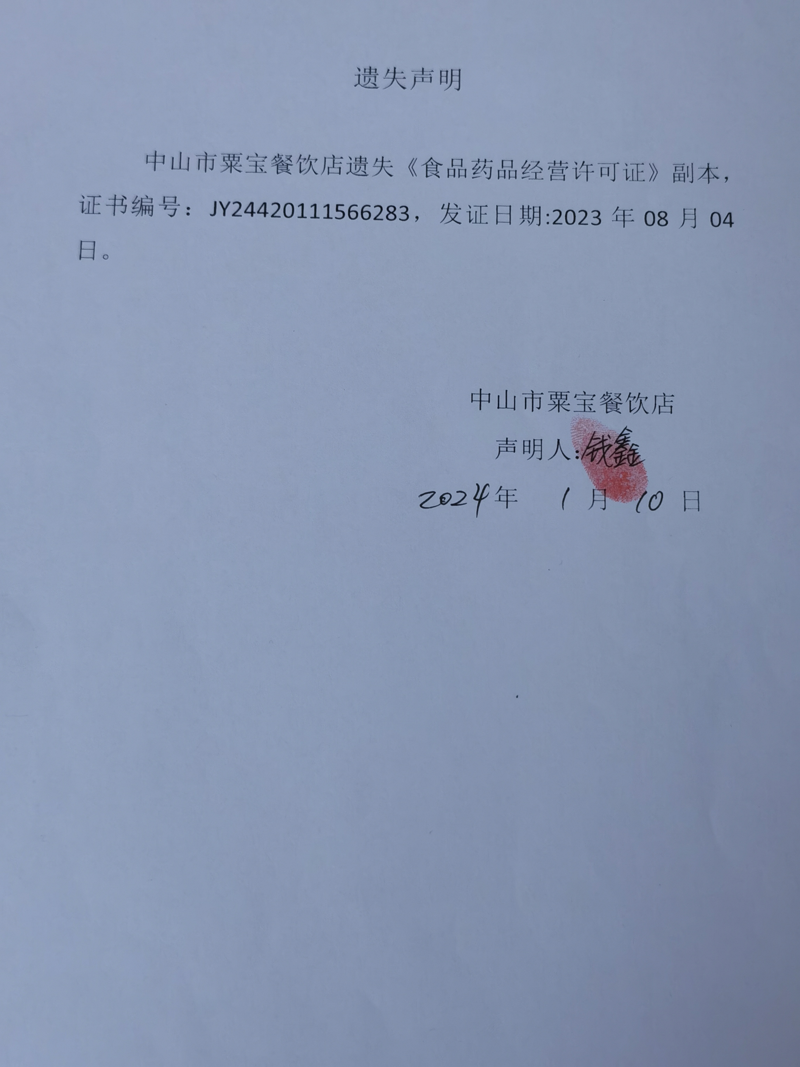 食品药品经营许可证遗失声明(中山市粟宝餐饮店)