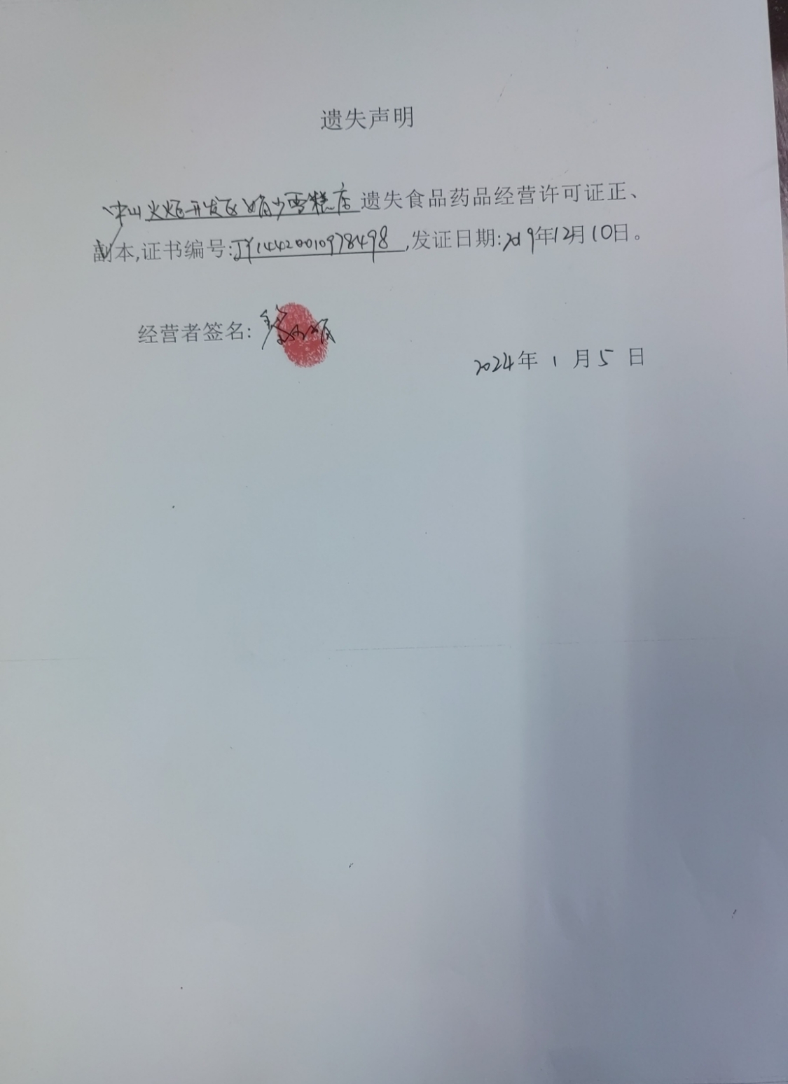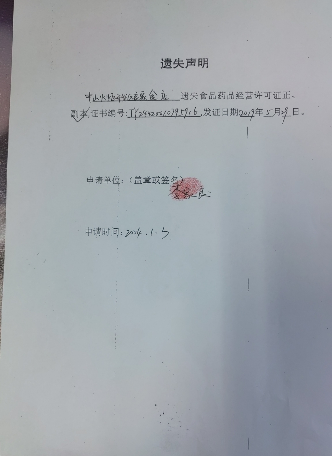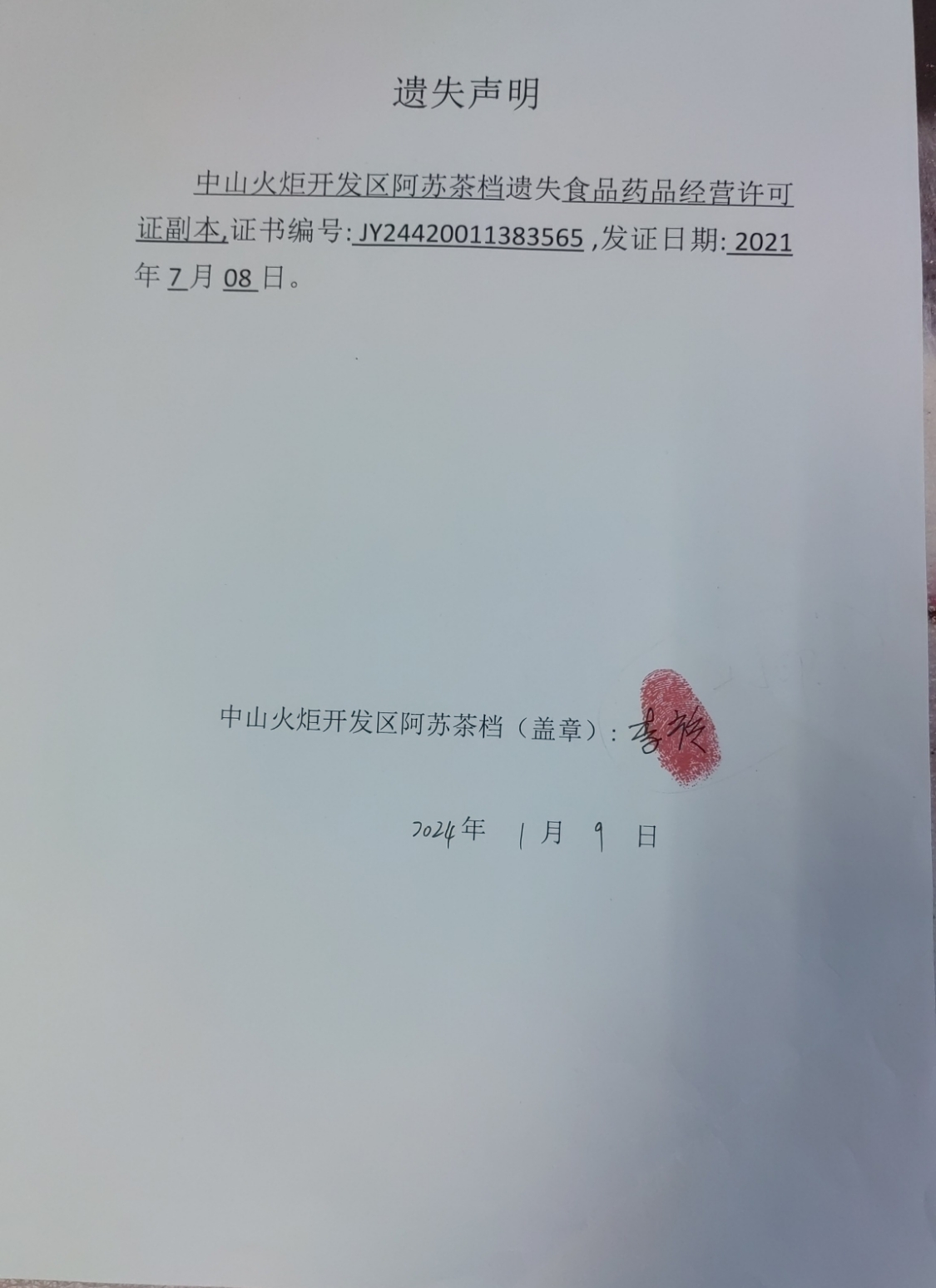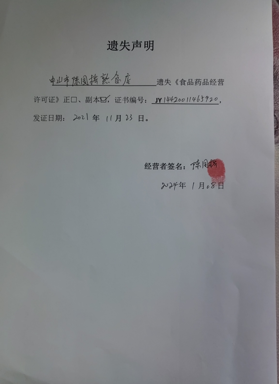 食品药品经营许可证遗失声明(中山市陈国桥熟食店、中山火炬开发区阿苏茶档、中山火炬开发区良家食店、中山火炬开发区娟少雪糕店)
