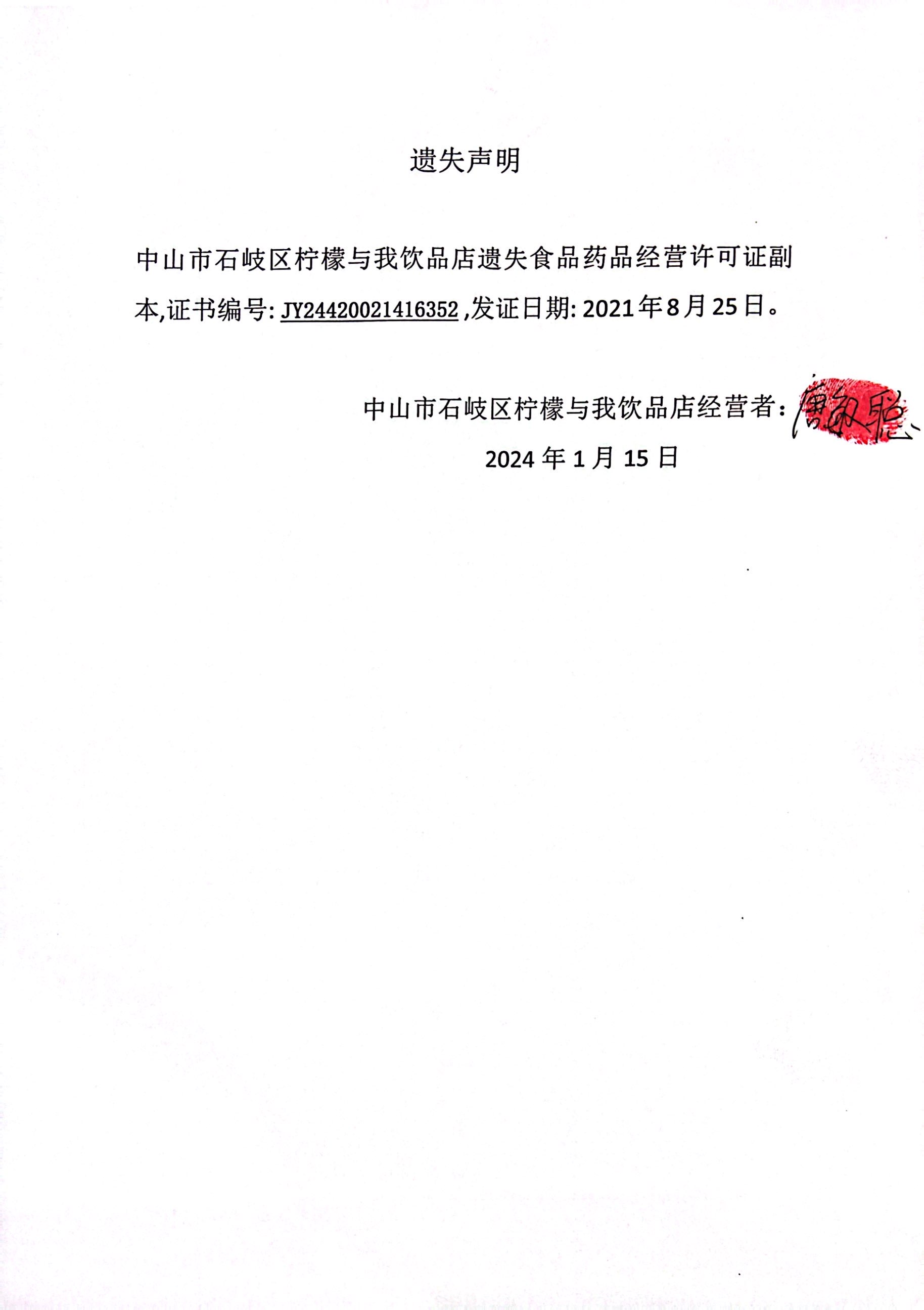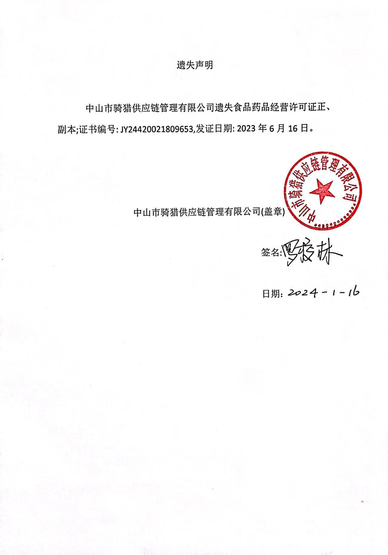 食品药品经营许可证遗失声明(中山市骑猎供应链管理有限公司、中山市石岐区柠檬与我饮品店)