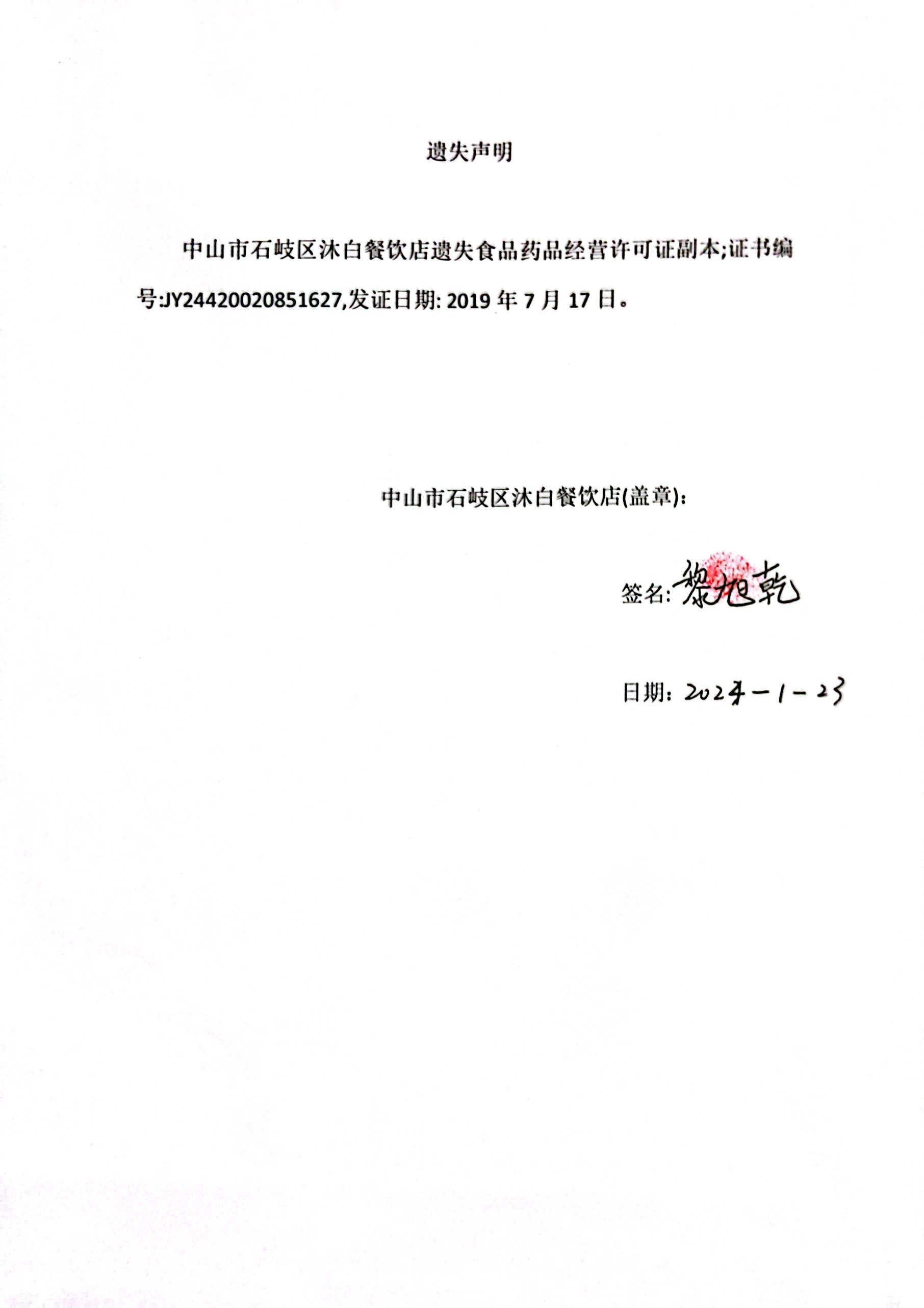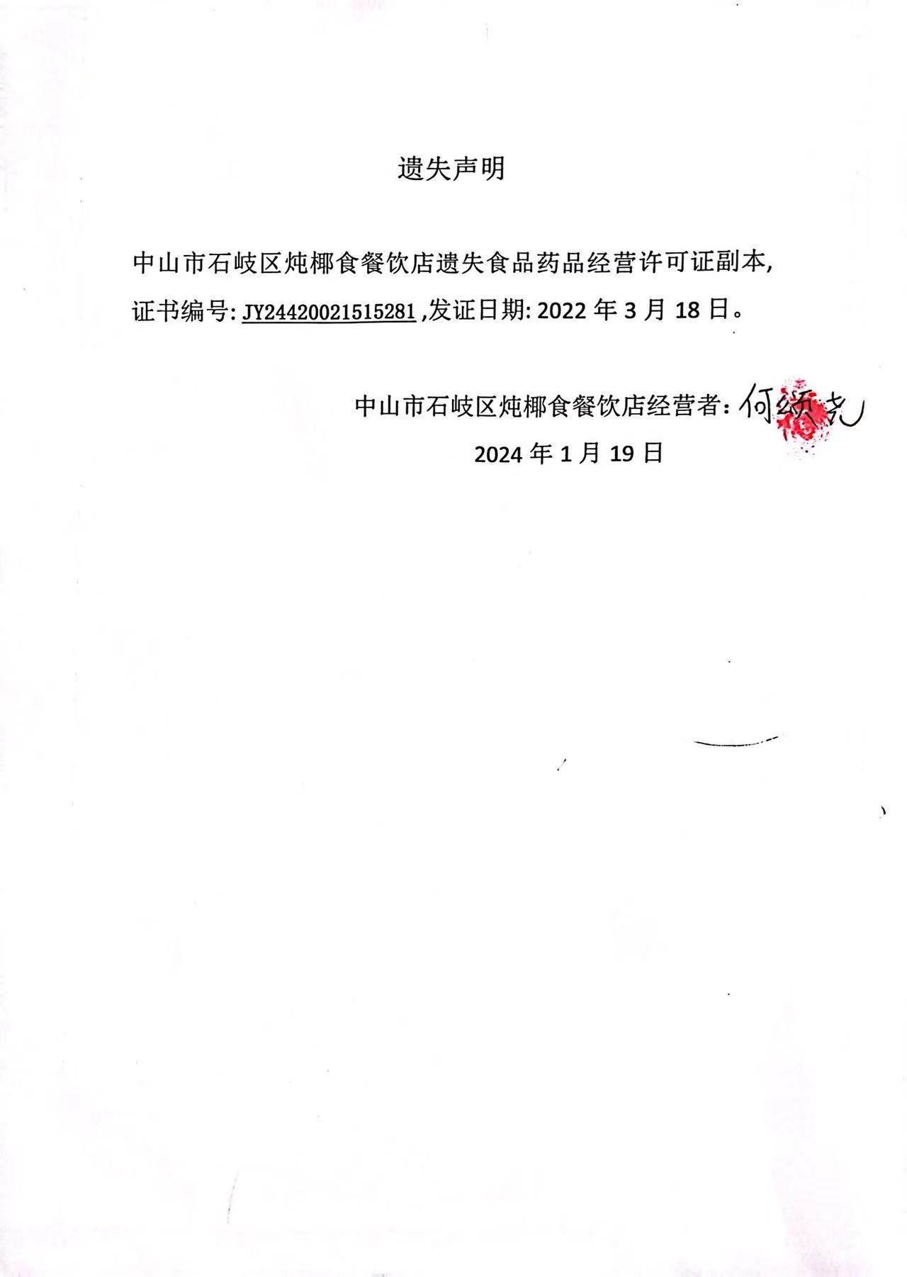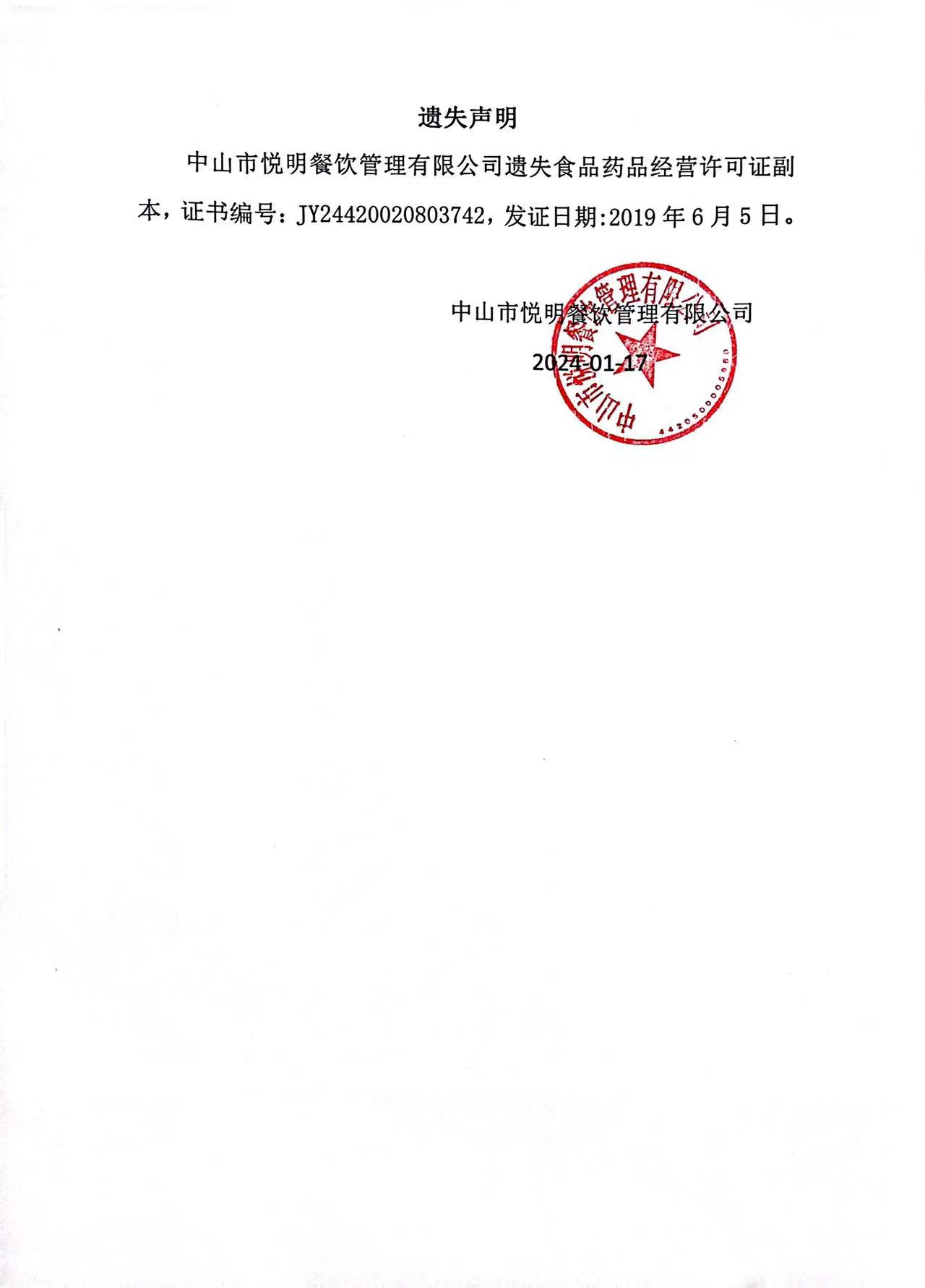 食品药品经营许可证遗失声明(中山市悦明餐饮管理有限公司、中山市石岐区炖椰食餐饮店、中山市石岐区沐白餐饮店)