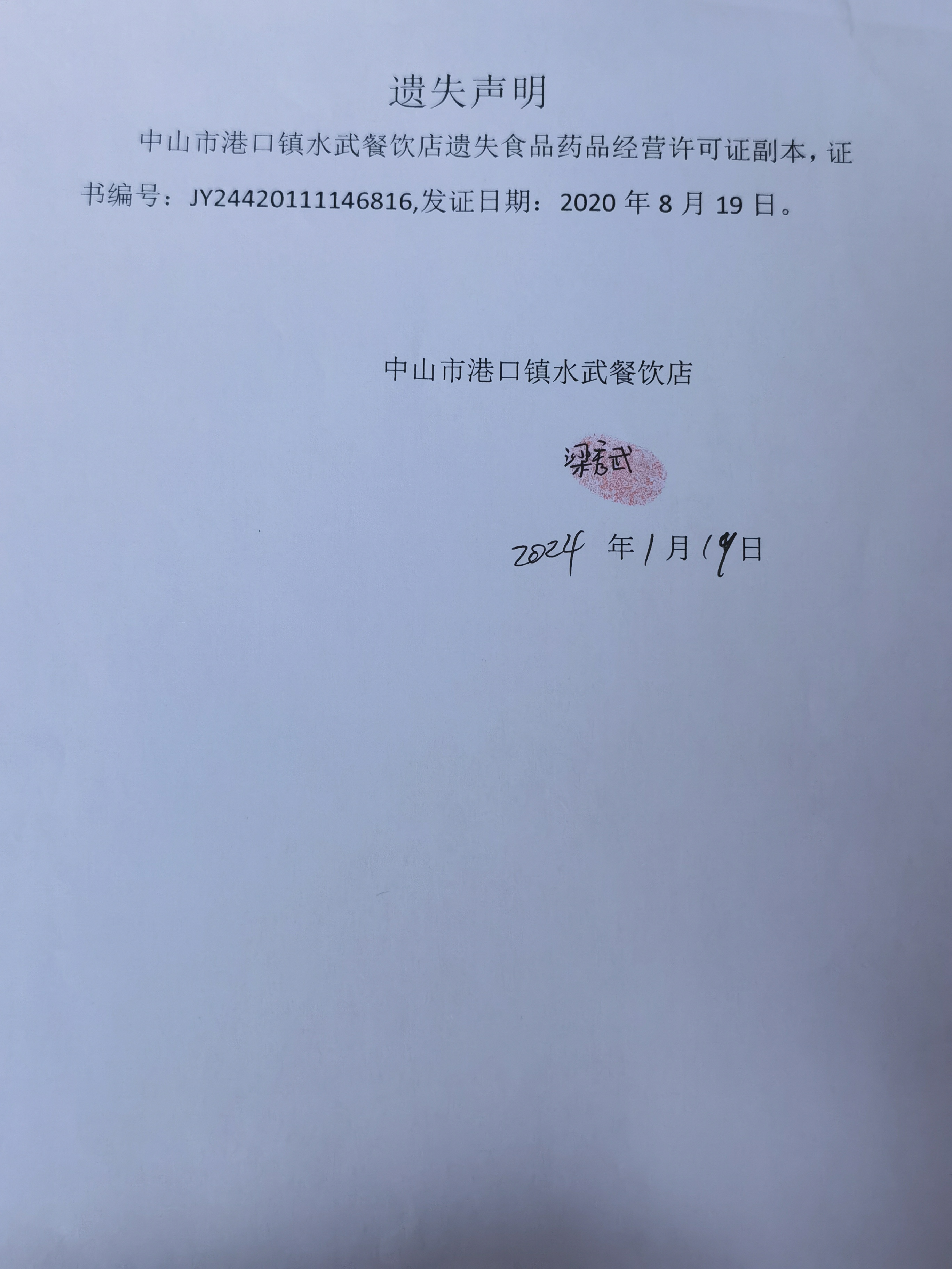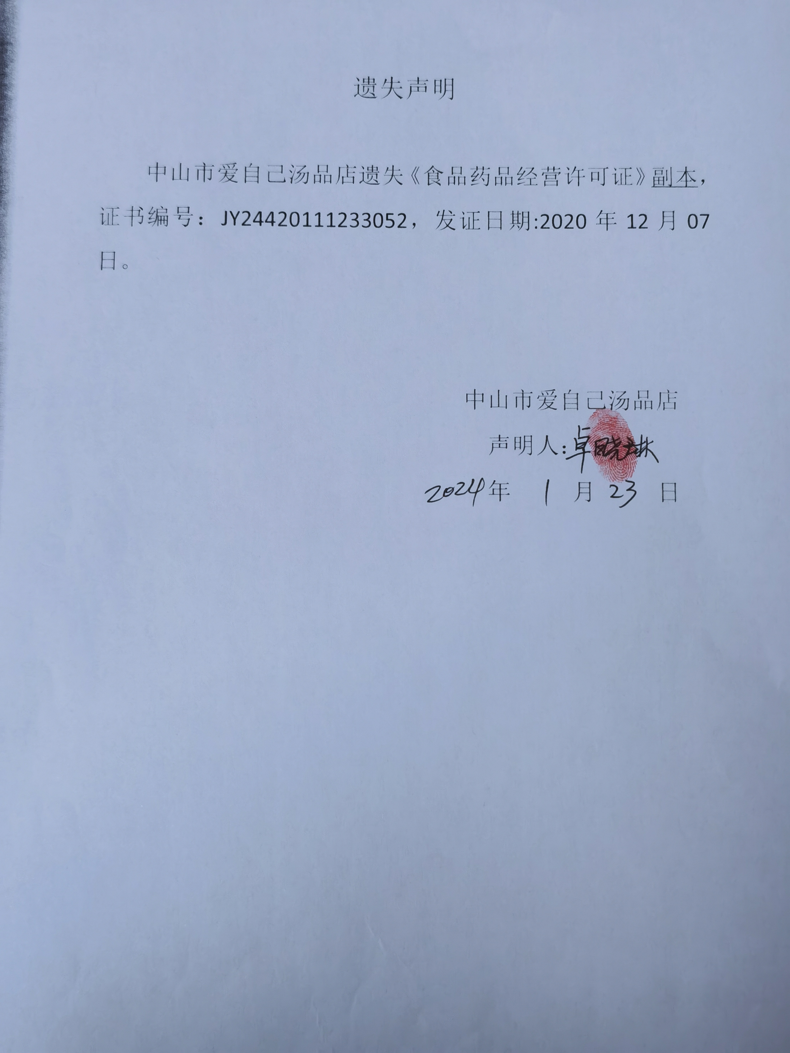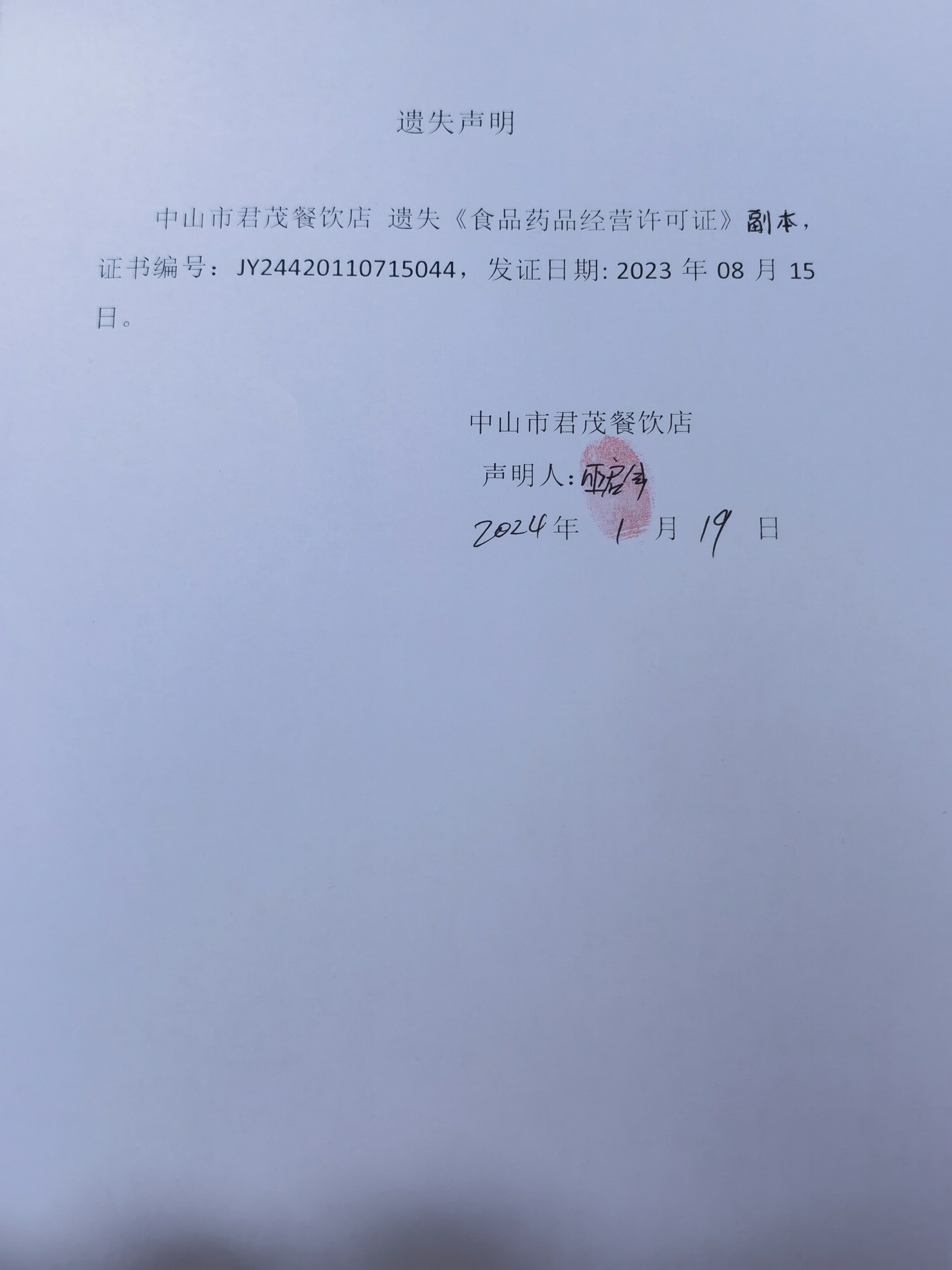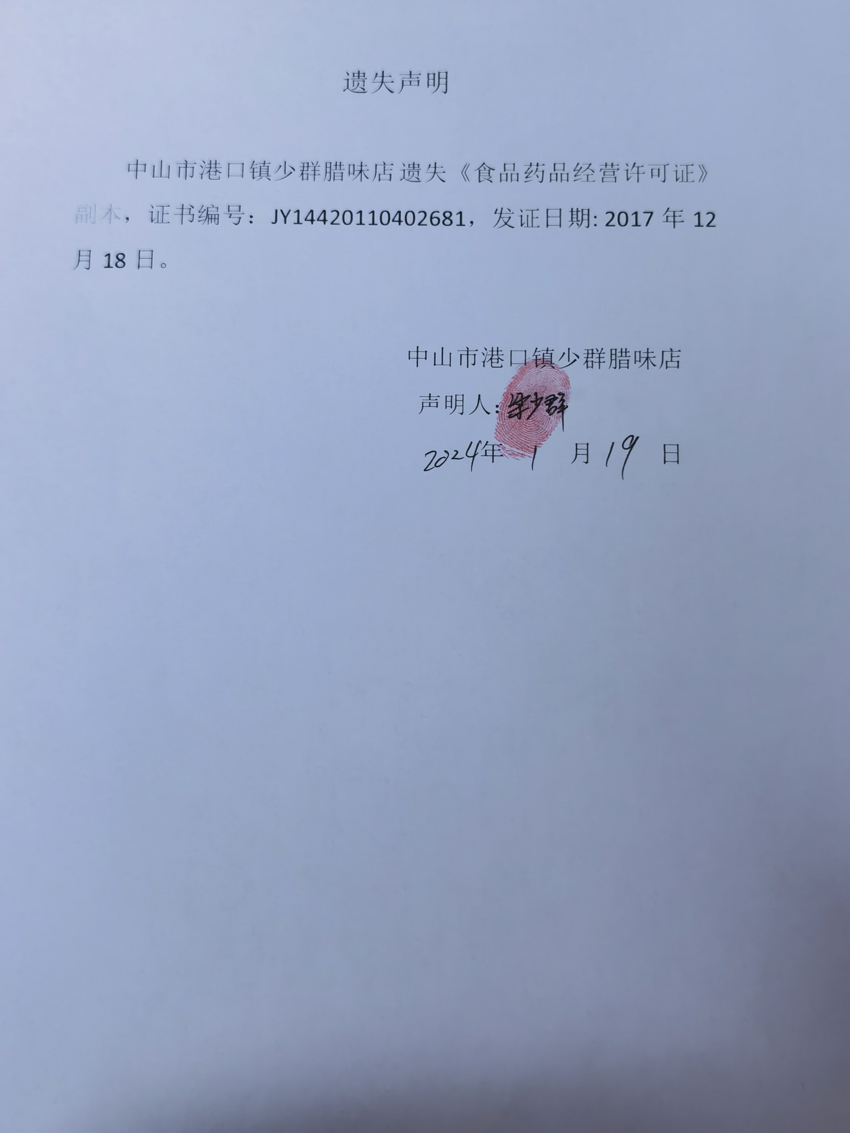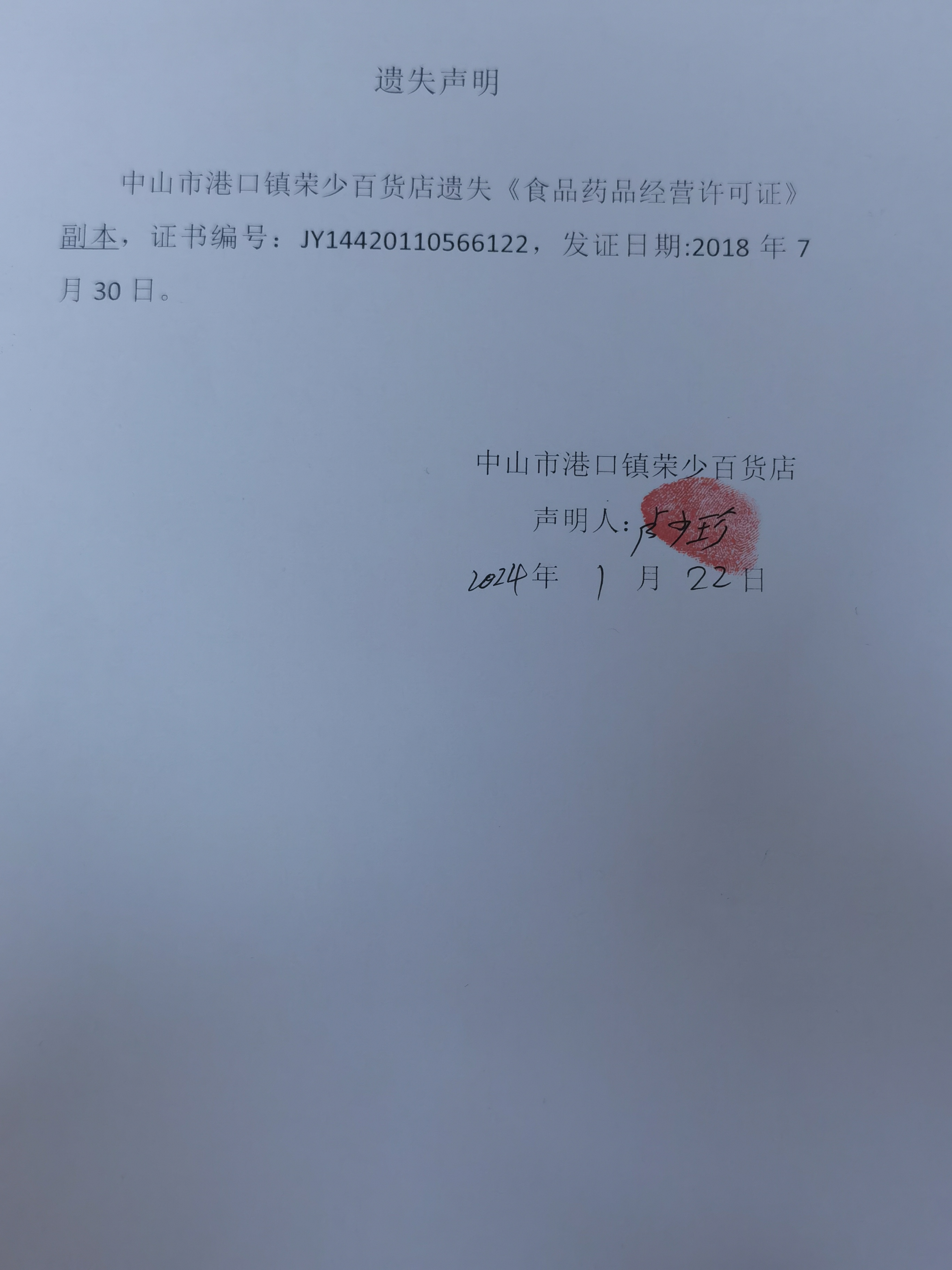 食品药品经营许可证遗失声明(中山市港口镇荣少百货店、中山市爱自己汤品店、中山市港口镇创众火锅店、中山市港口镇水武餐饮店、中山市港口镇少群腊味店、中山市君茂餐饮店)