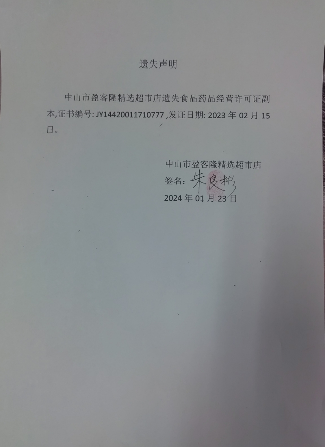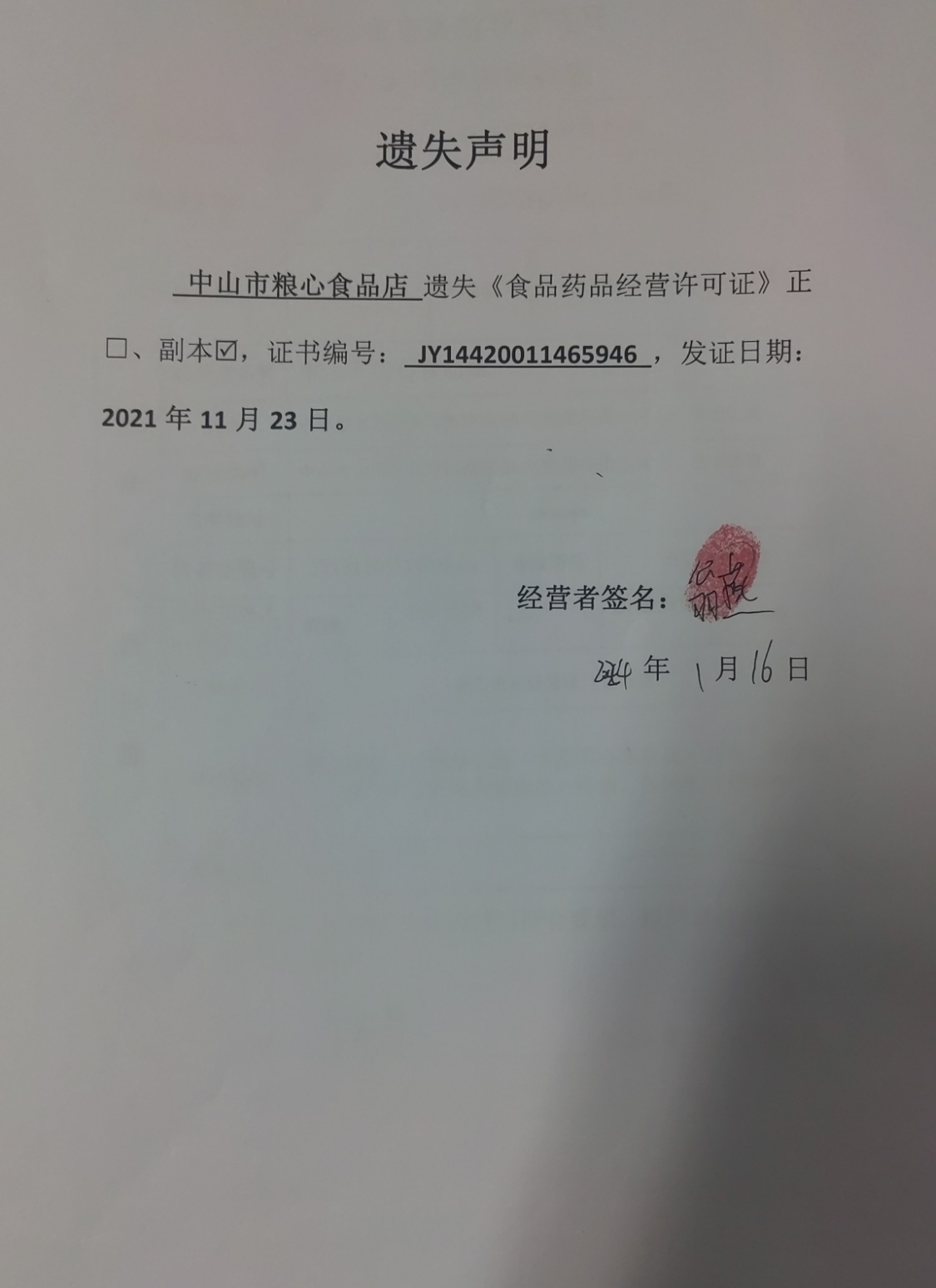 食品药品经营许可证遗失声明(中山市粮心食品店、中山市盈客隆精选超市店食品店)