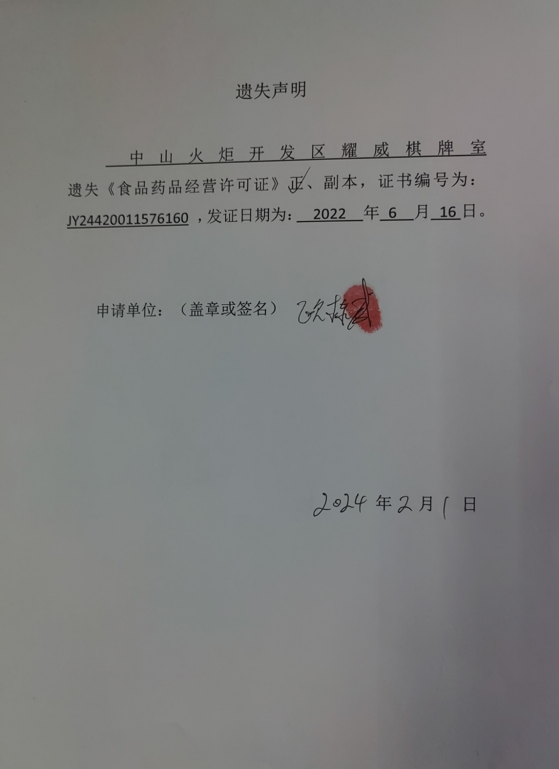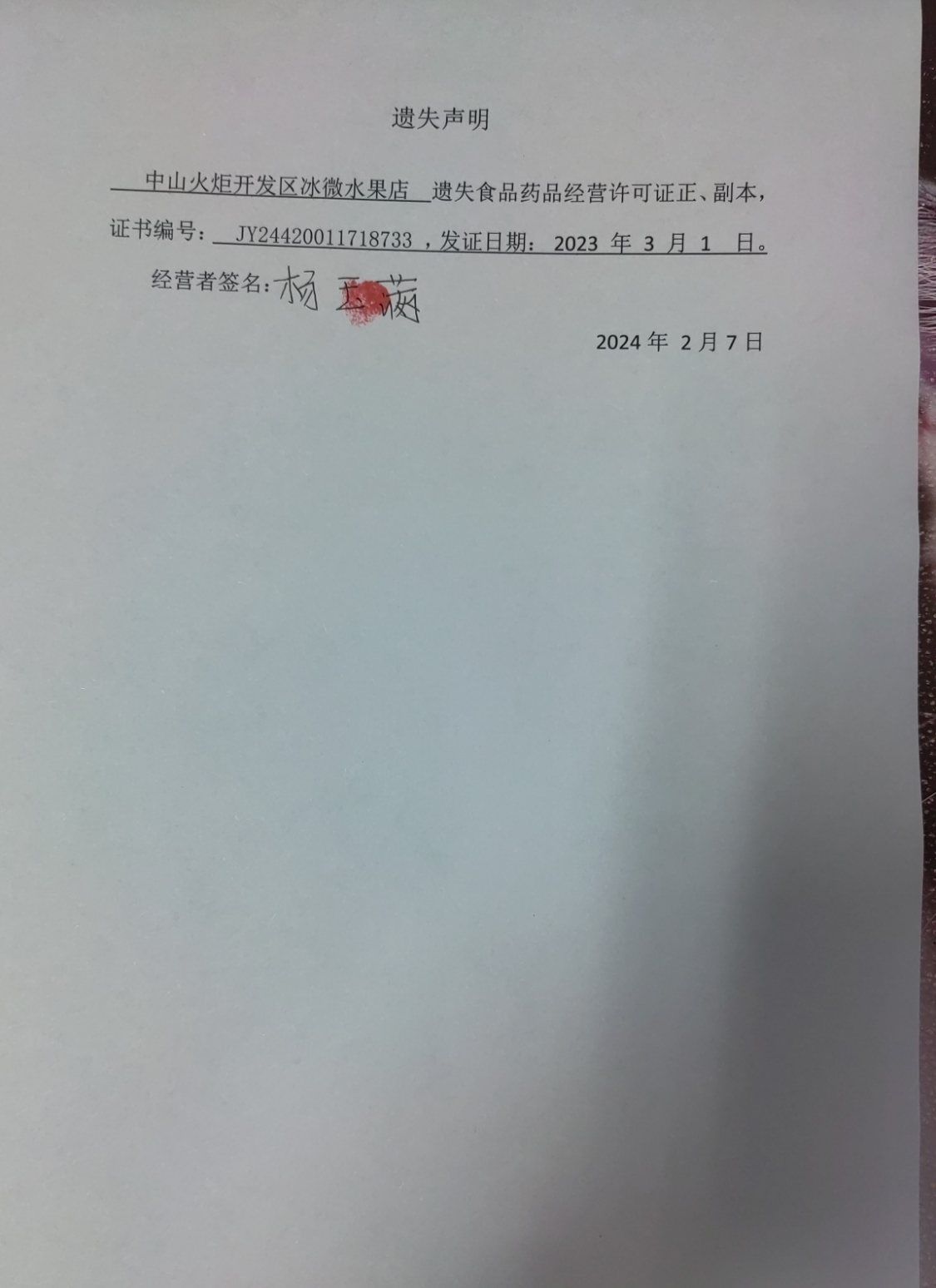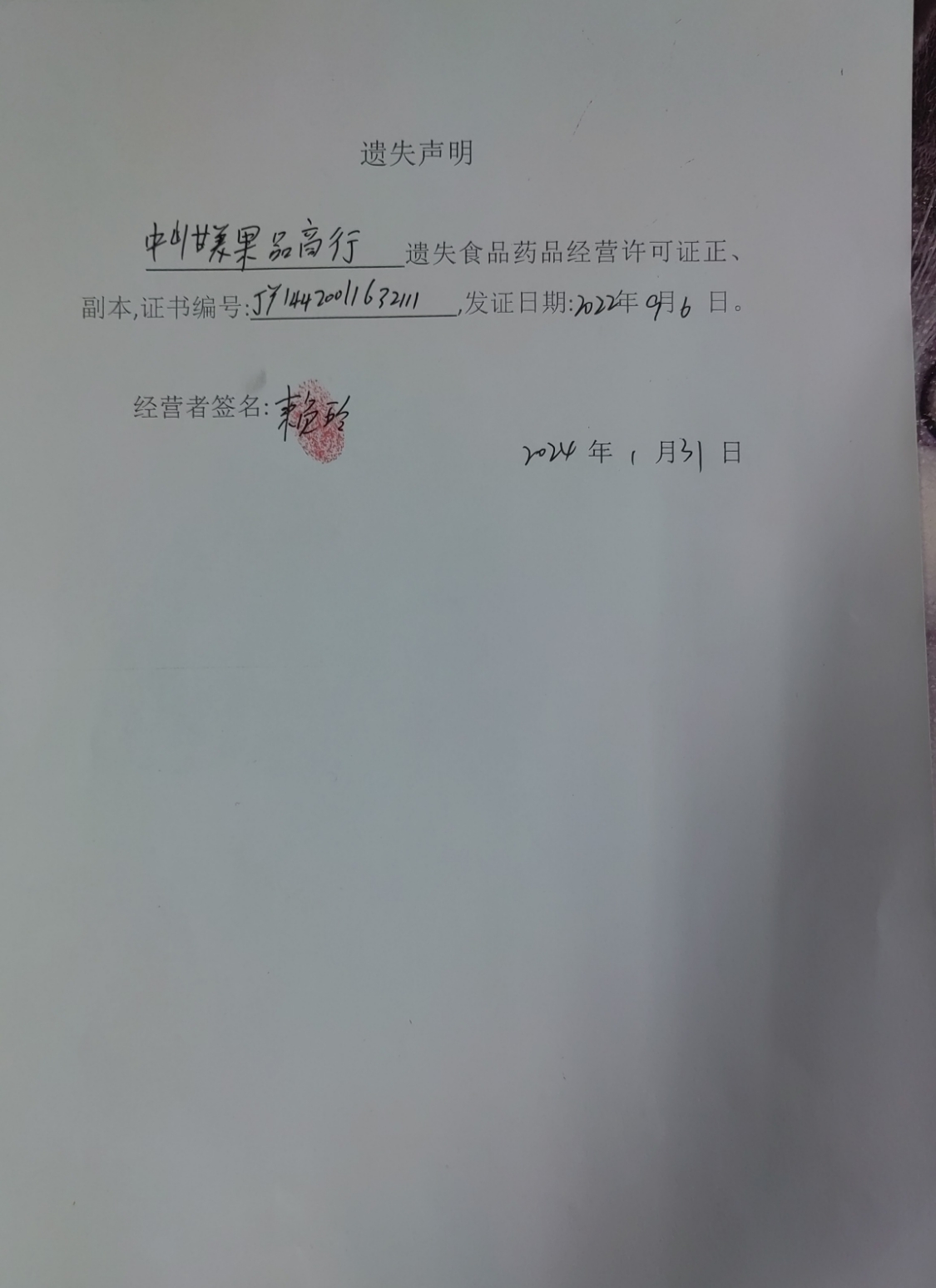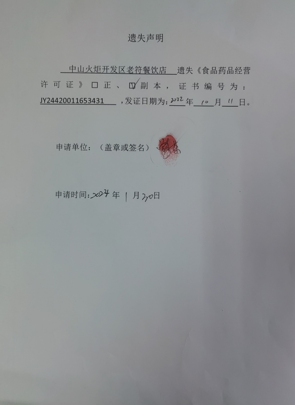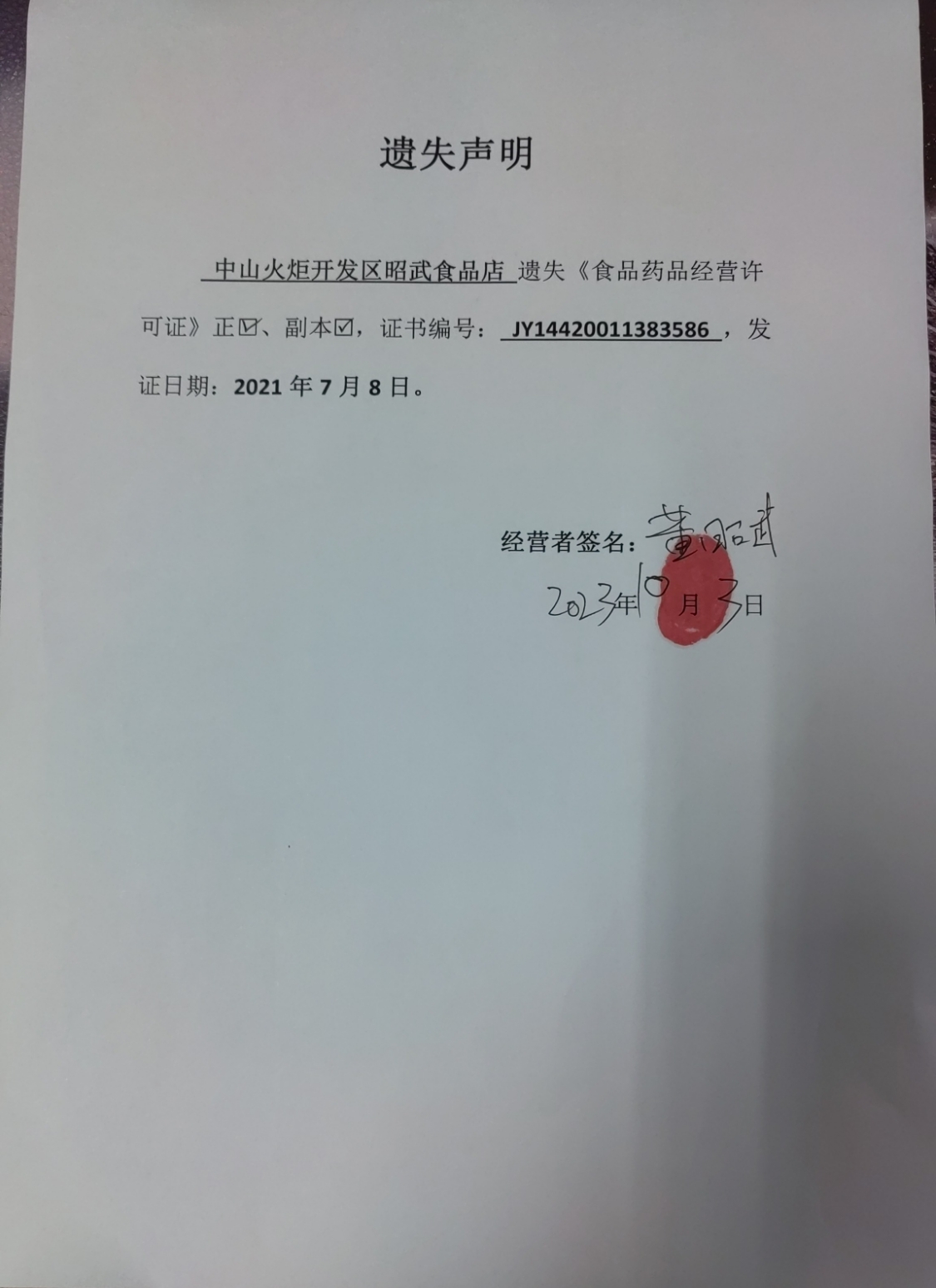 食品药品经营许可证遗失声明(中山火炬开发区老符餐饮店、中山甘美果品商行、中山火炬开发区冰微水果店、中山火炬开发区昭武食品店、中山火炬开发区耀威棋牌室)