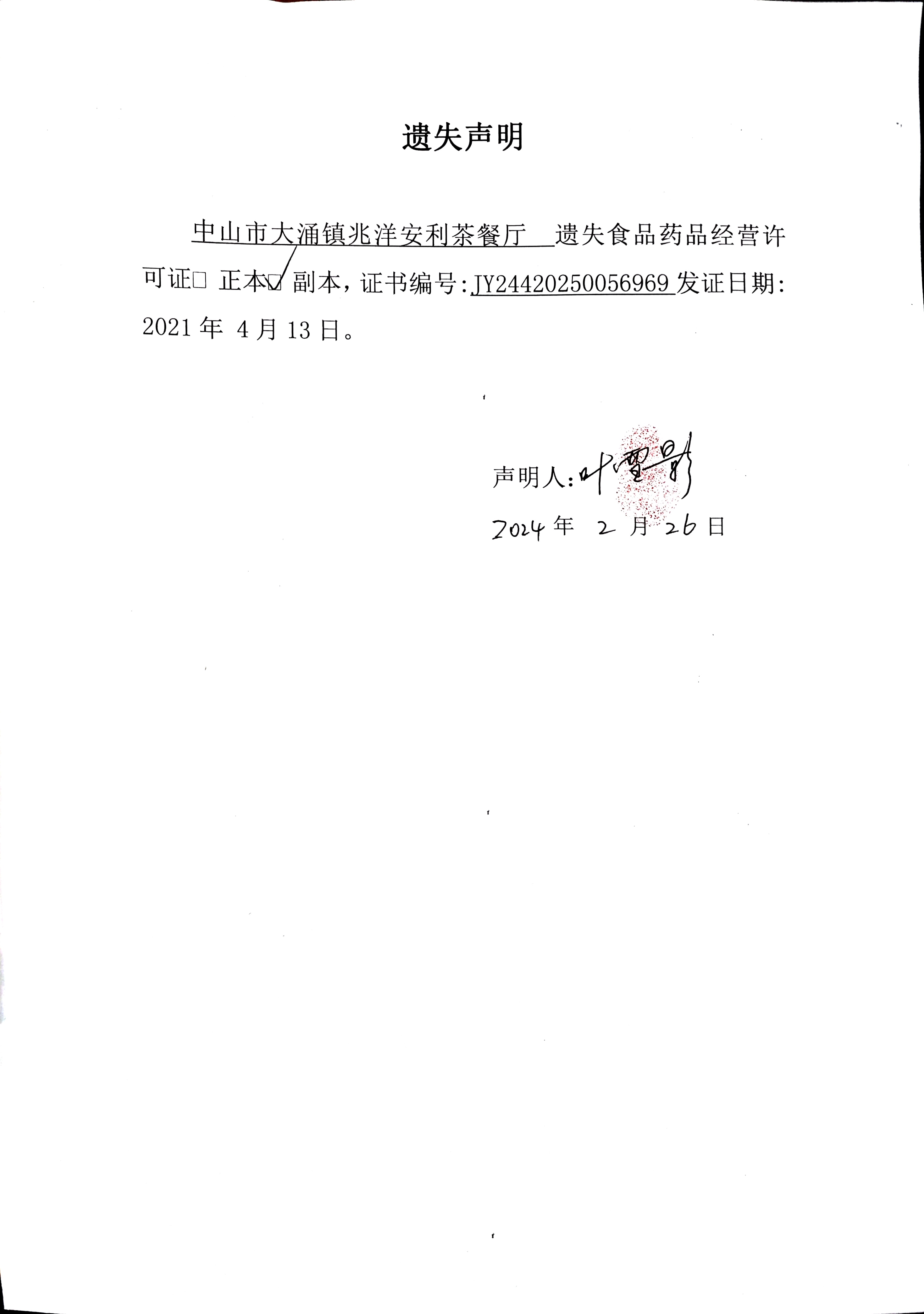 食品药品经营许可证遗失声明(中山市大涌镇兆洋安利茶餐厅)