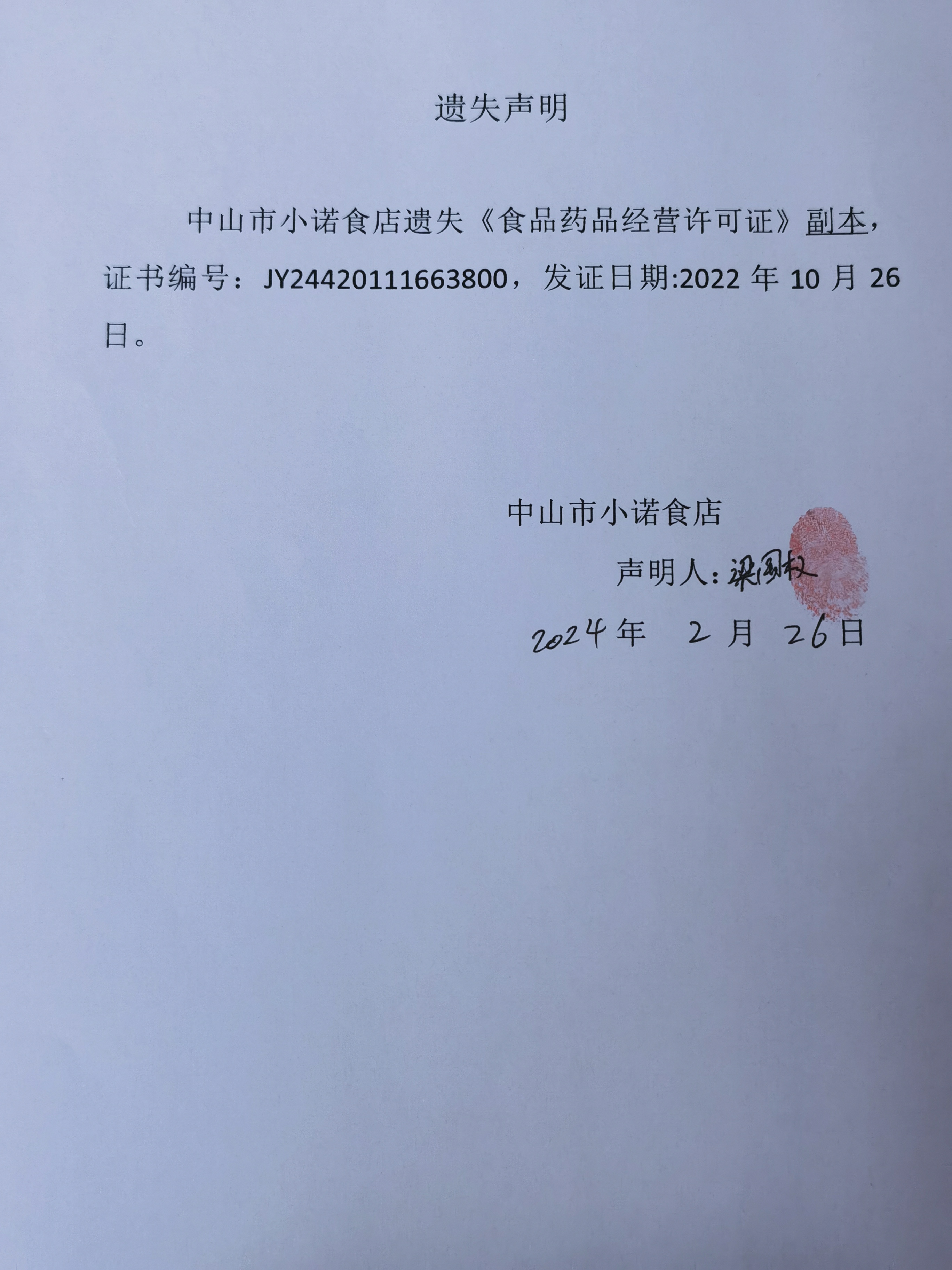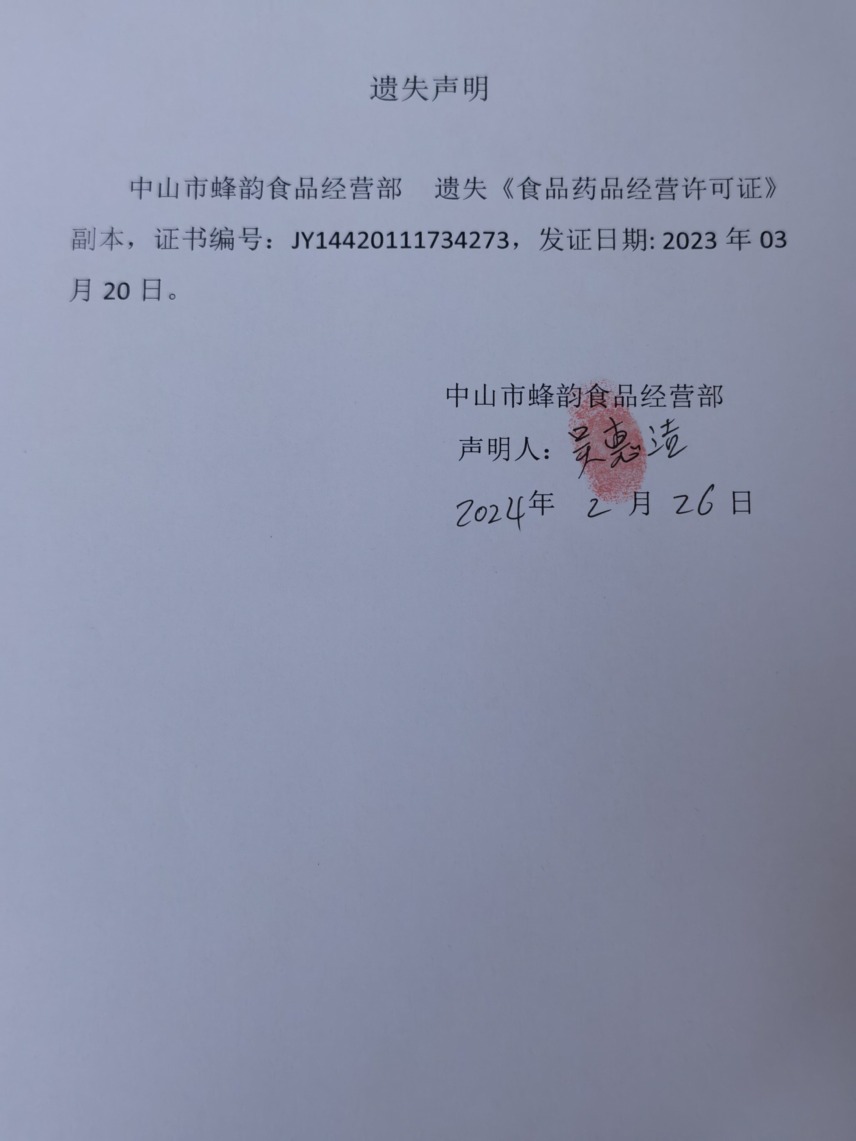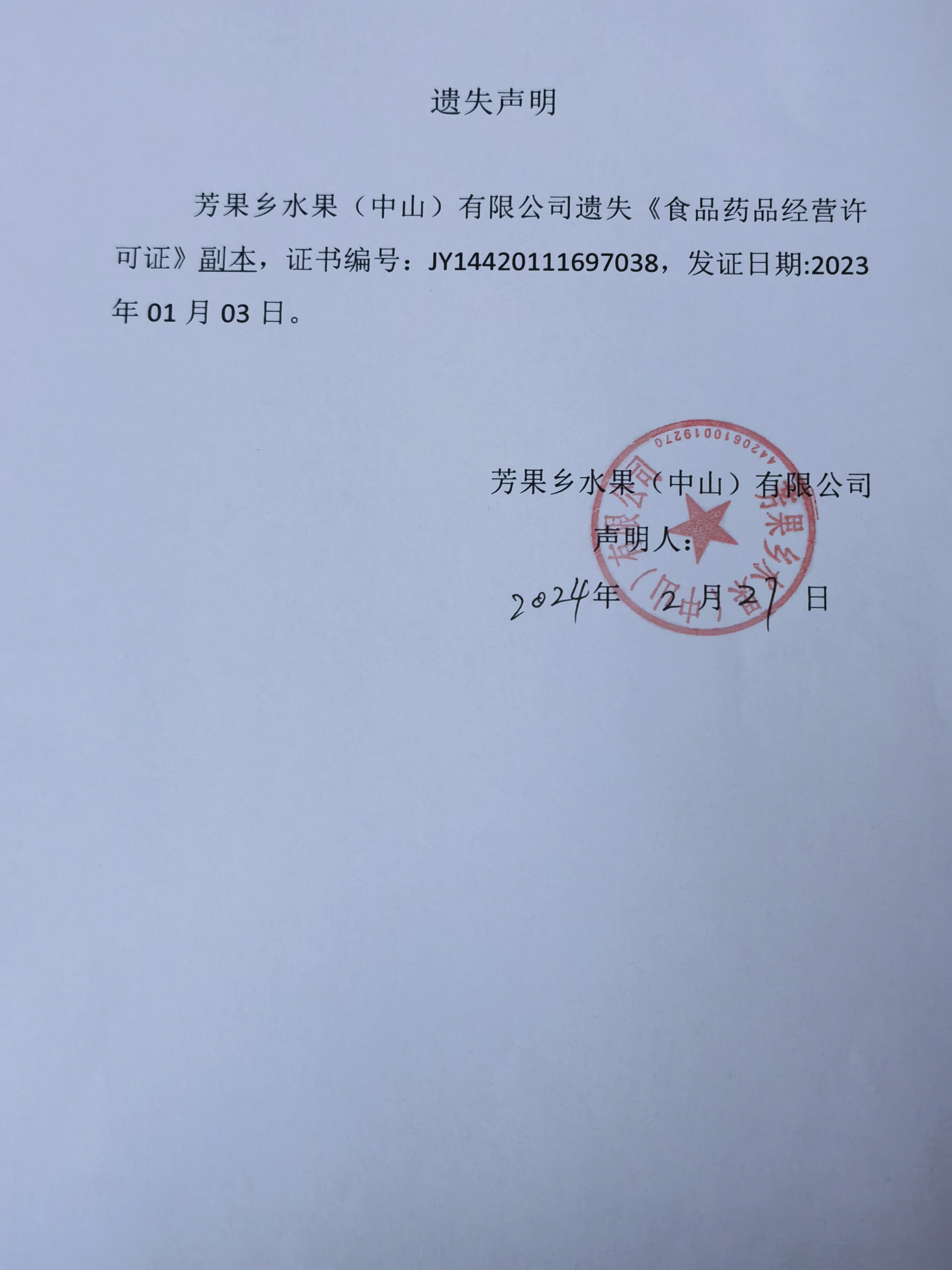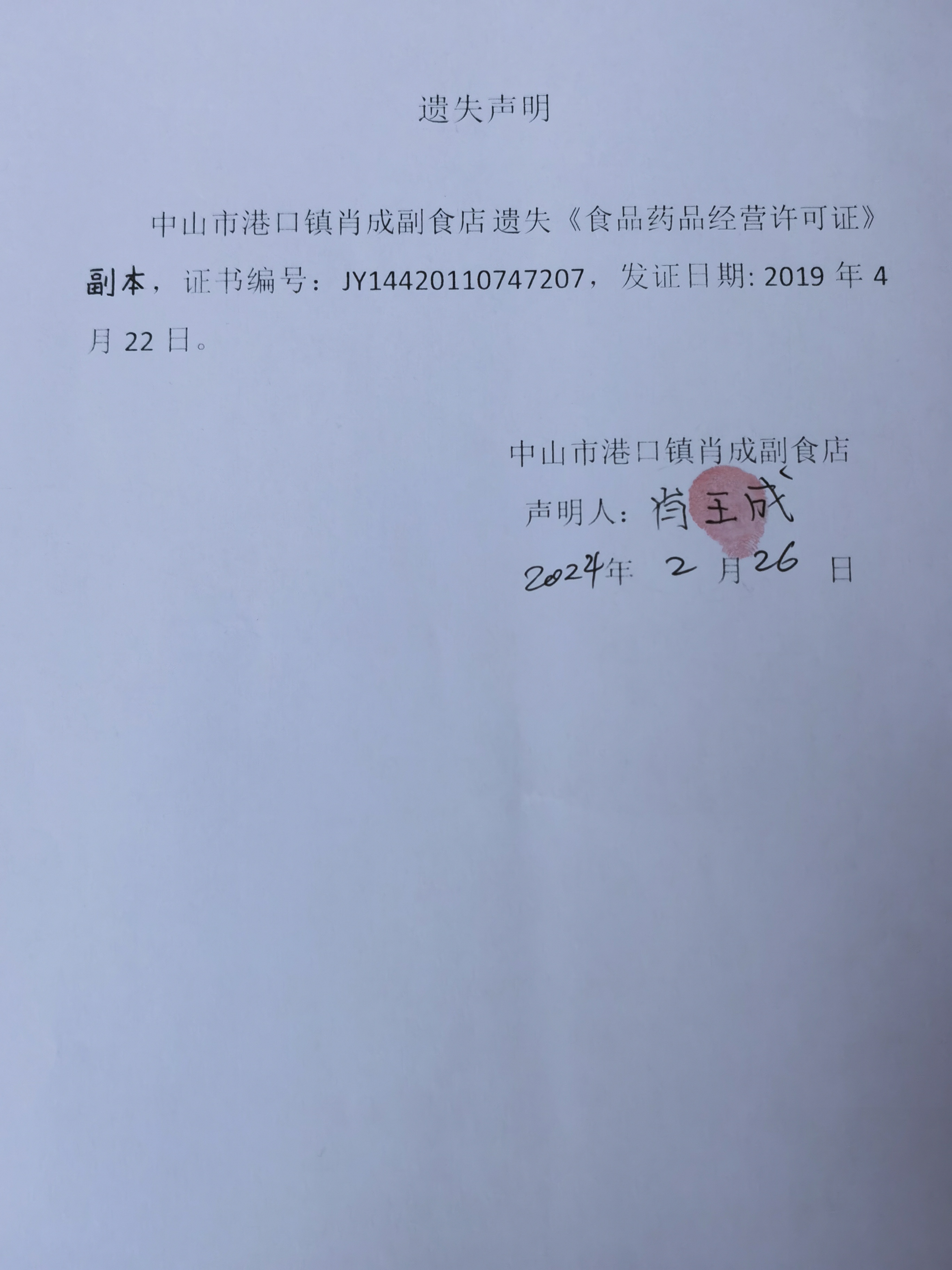 食品药品经营许可证遗失声明【中山市港口镇肖成副食店、中山市小诺食店、芳果乡水果(中山)有限公司、中山市蜂韵食品经营部】