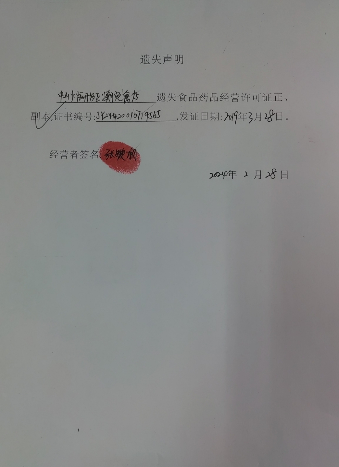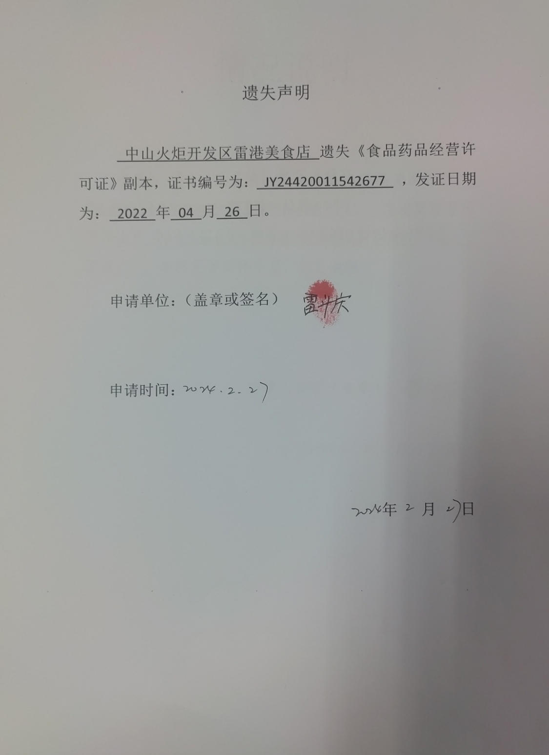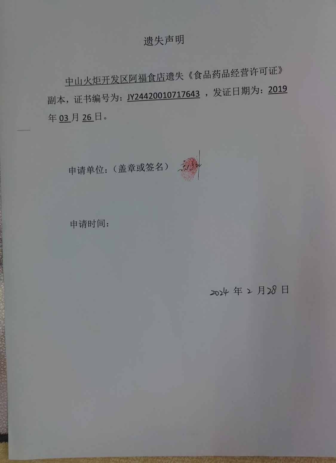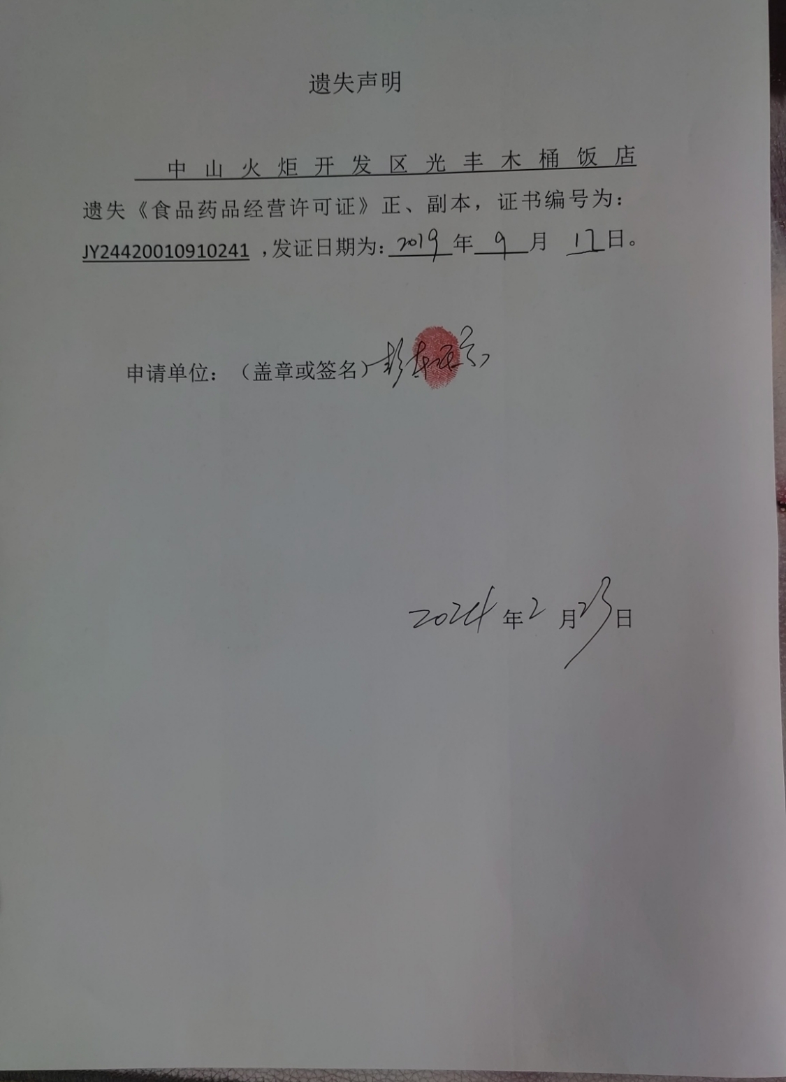 食品药品经营许可证遗失声明(中山火炬开发区光丰木桶饭店、中山火炬开发区阿福食店、中山火炬开发区雷港美食店、中山火炬开发区潮宛食店)
