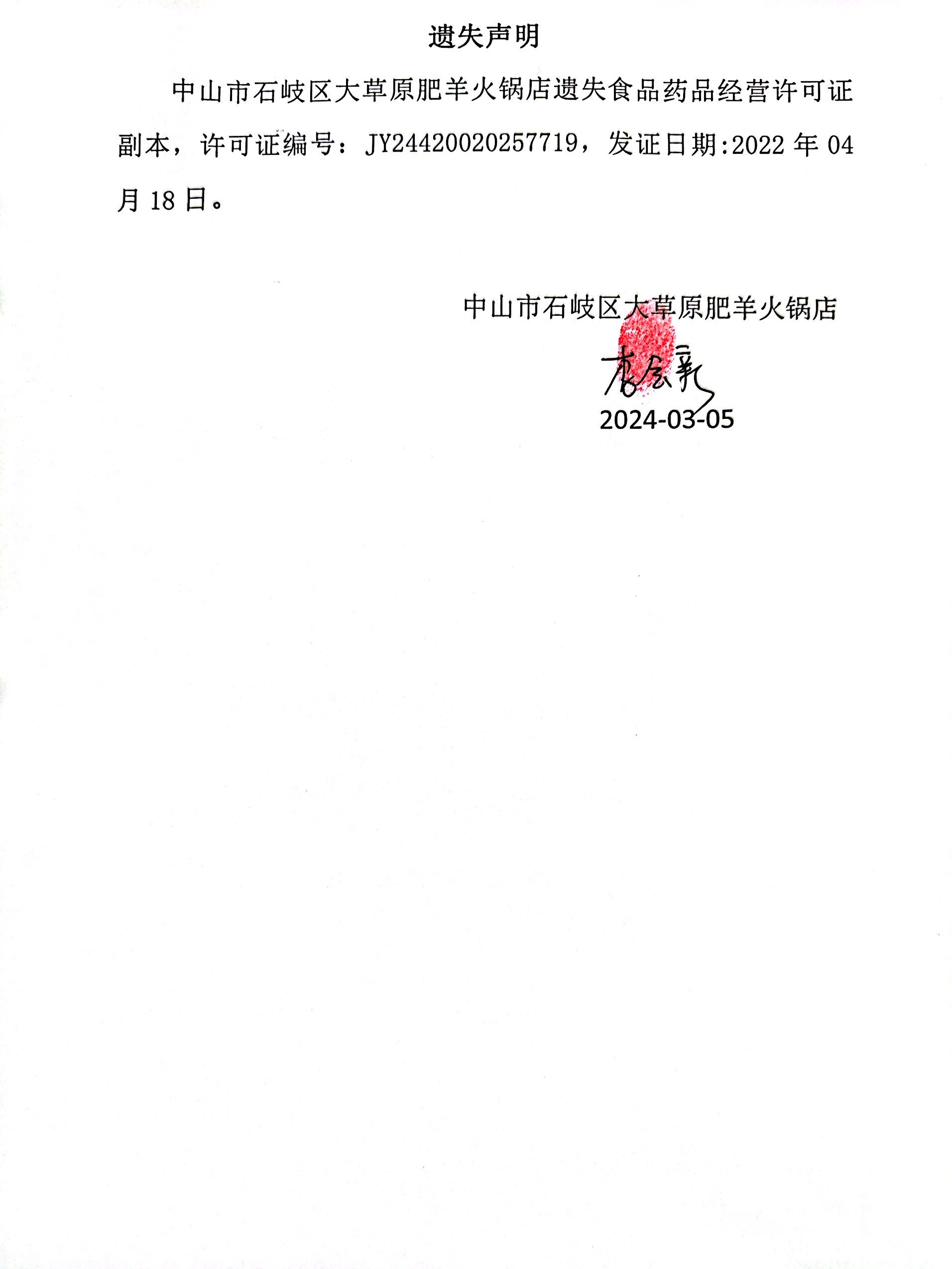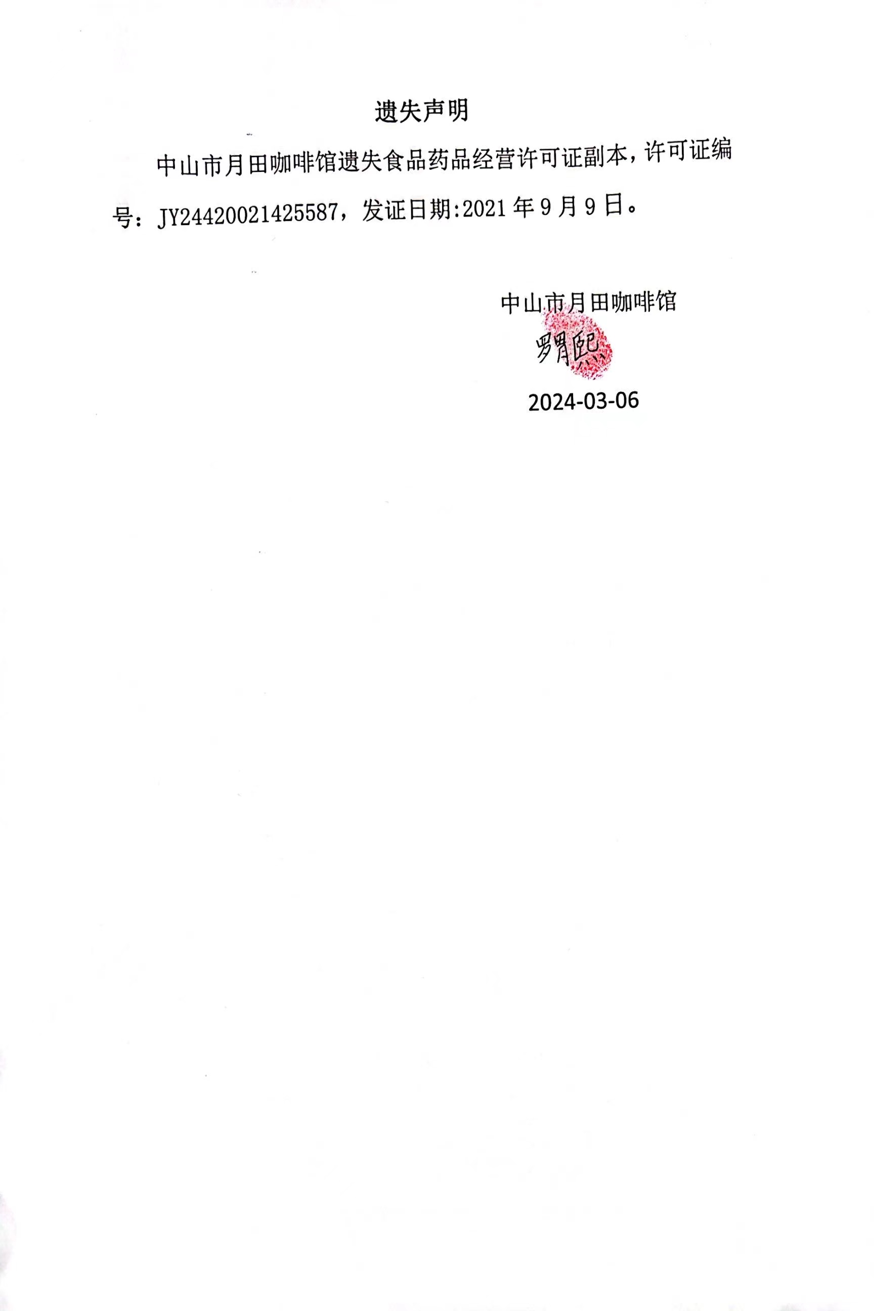 食品药品经营许可证遗失声明(中山市月田咖啡馆、中山欧包遇见茶餐饮管理有限公司、中山市石岐区大草原肥羊火锅店)