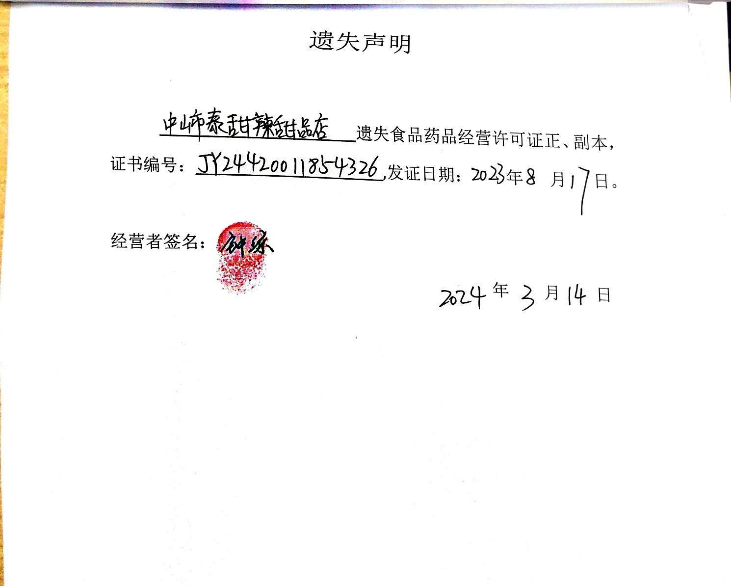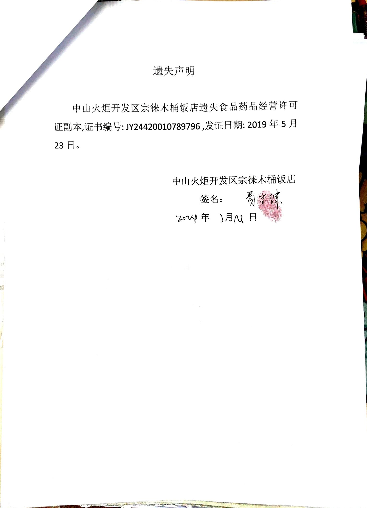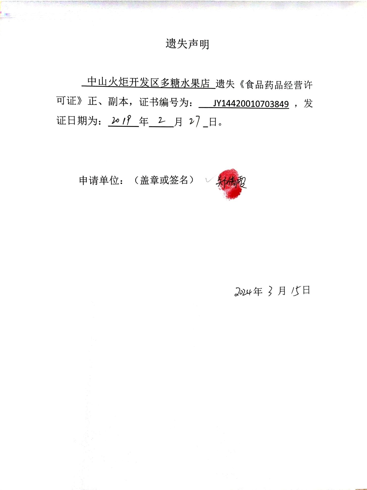 食品药品经营许可证遗失声明(中山火炬开发区多糖水果店、中山火炬开发区林语餐饮店、中山火炬开发区逸秀糕点店、中山火炬开发区宗徕木桶饭店、中山市兰亭序餐吧、中山市泰甜辣甜品店)