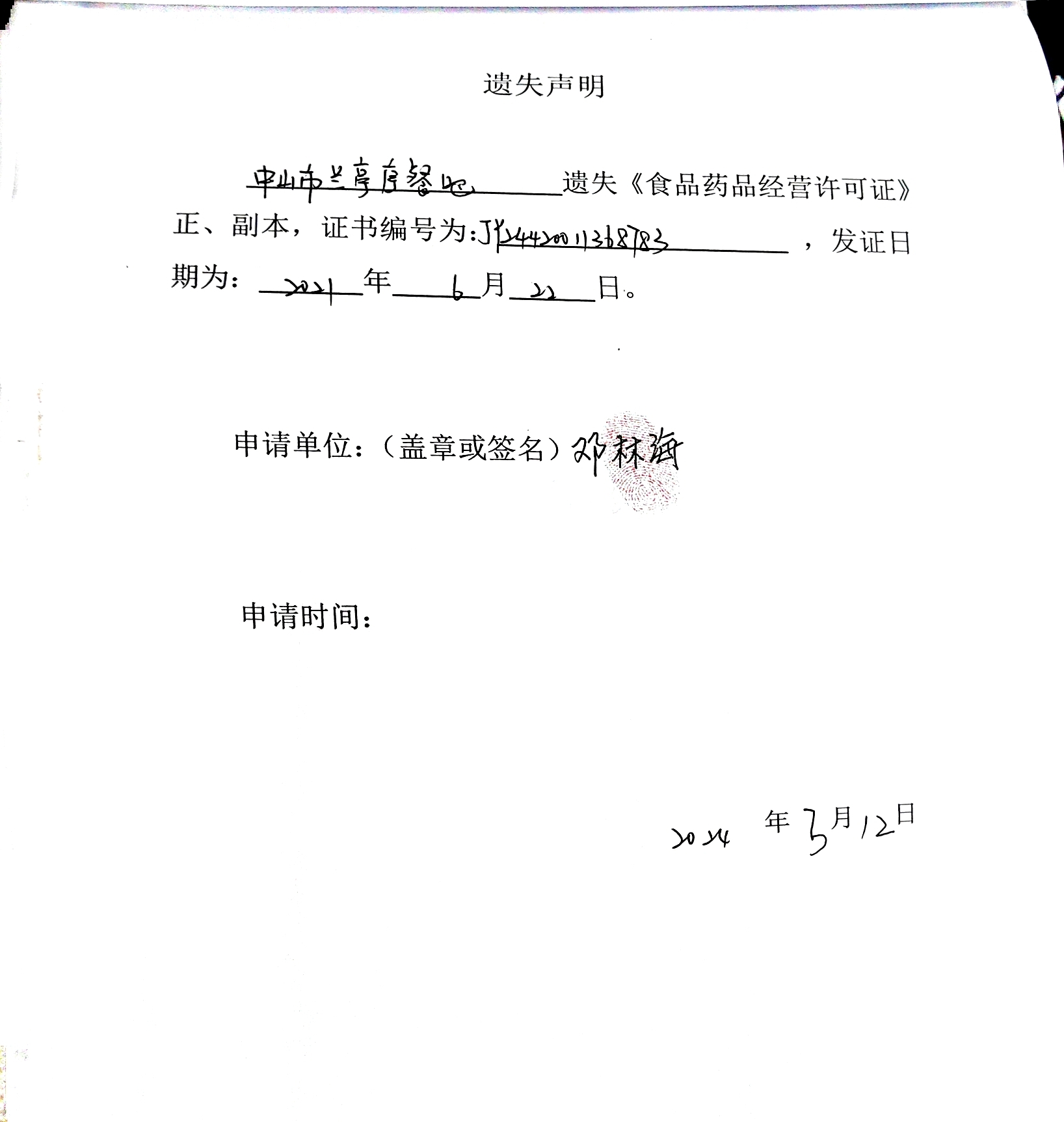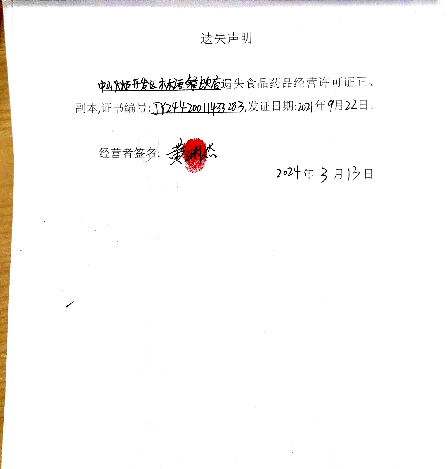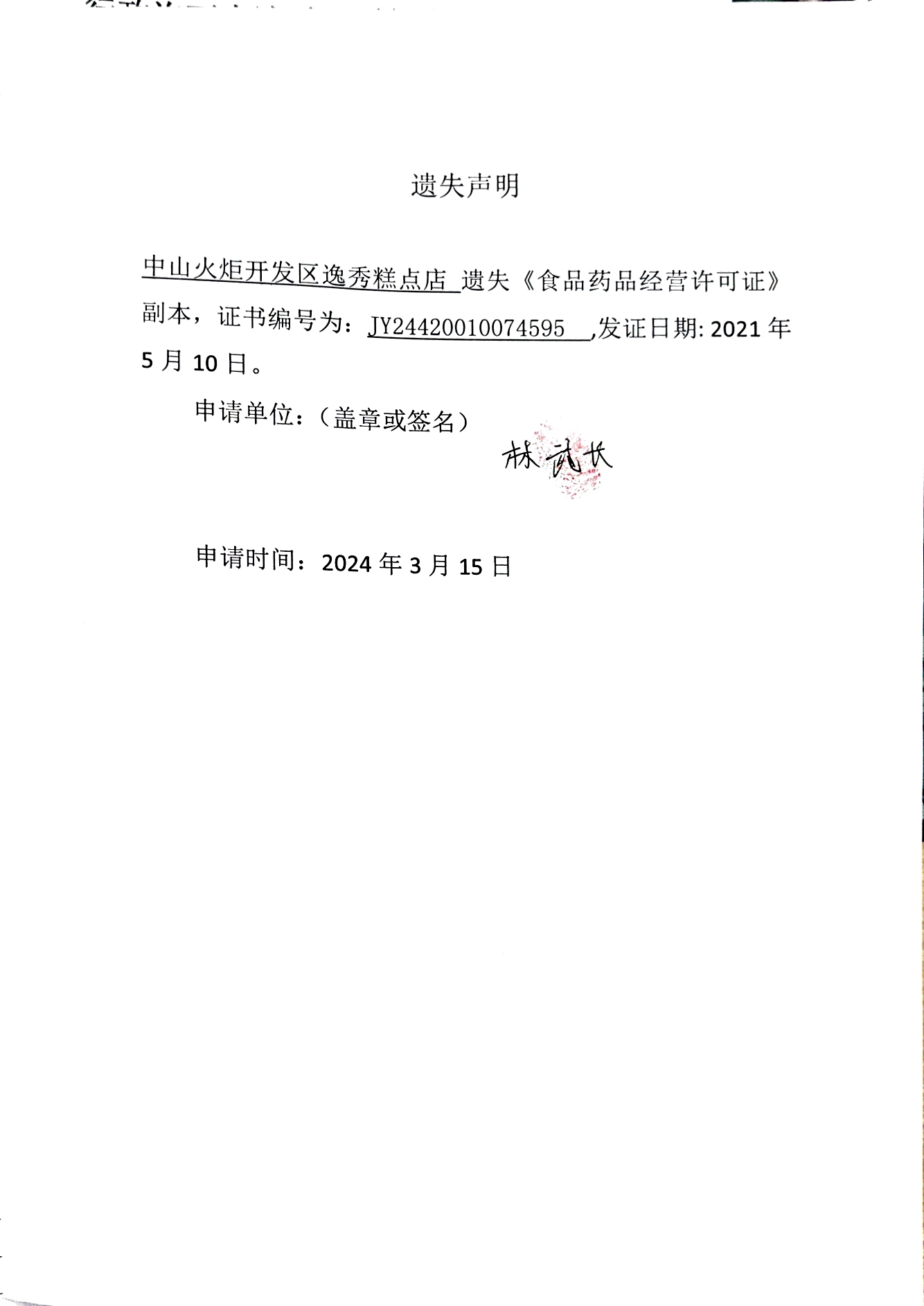 食品药品经营许可证遗失声明(中山火炬开发区多糖水果店、中山火炬开发区林语餐饮店、中山火炬开发区逸秀糕点店、中山火炬开发区宗徕木桶饭店、中山市兰亭序餐吧、中山市泰甜辣甜品店)