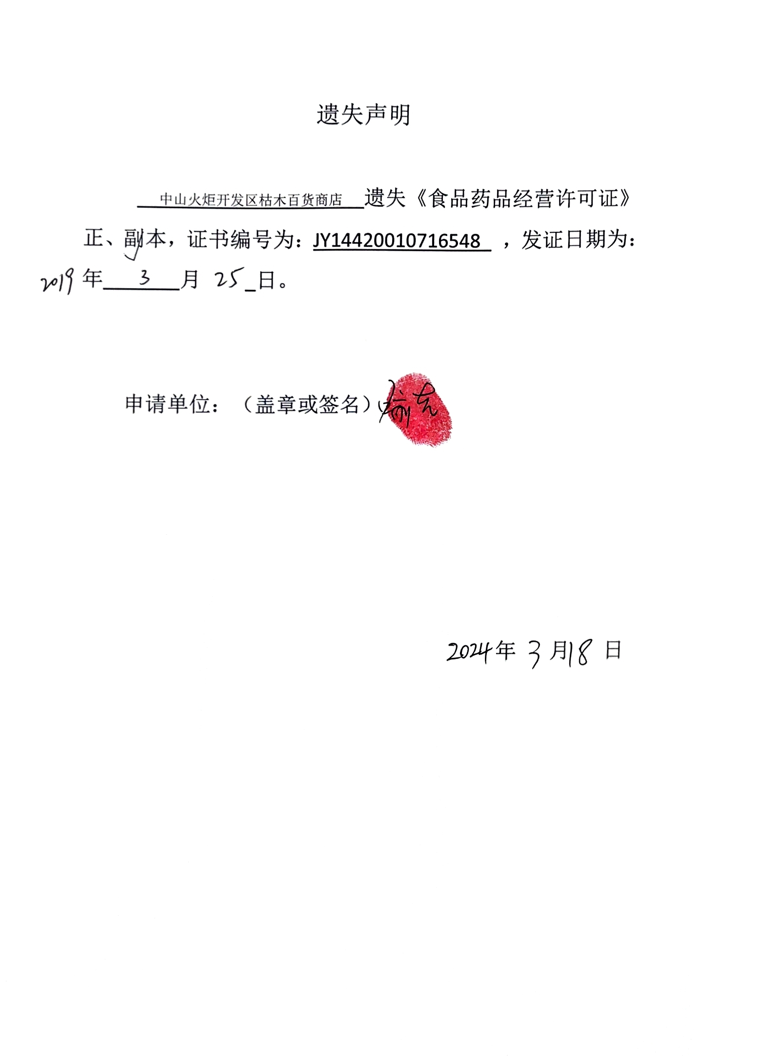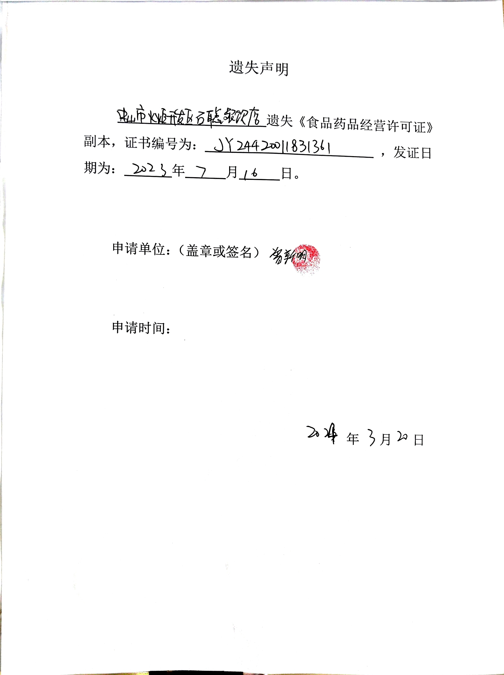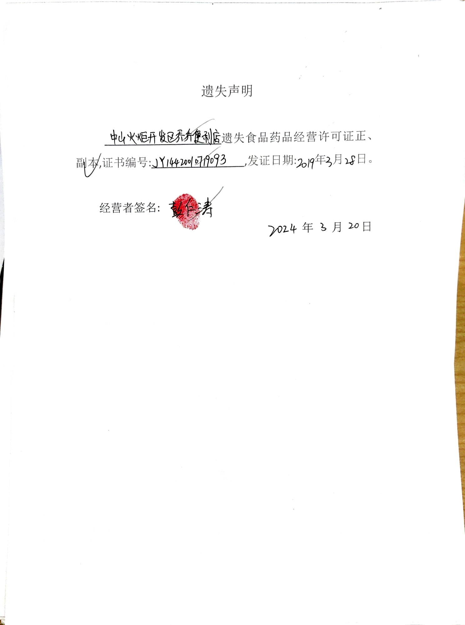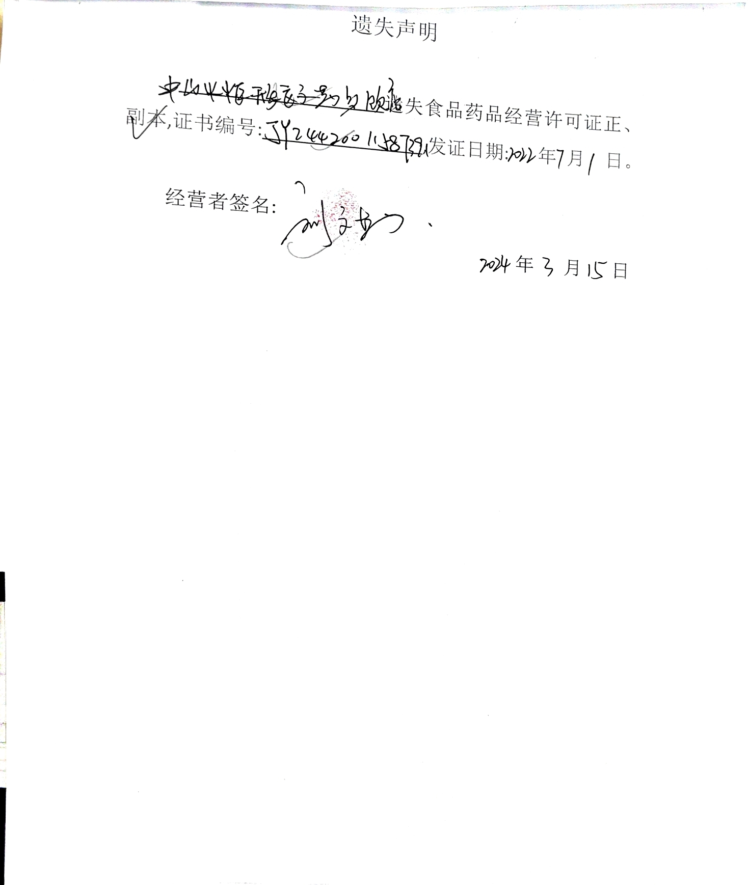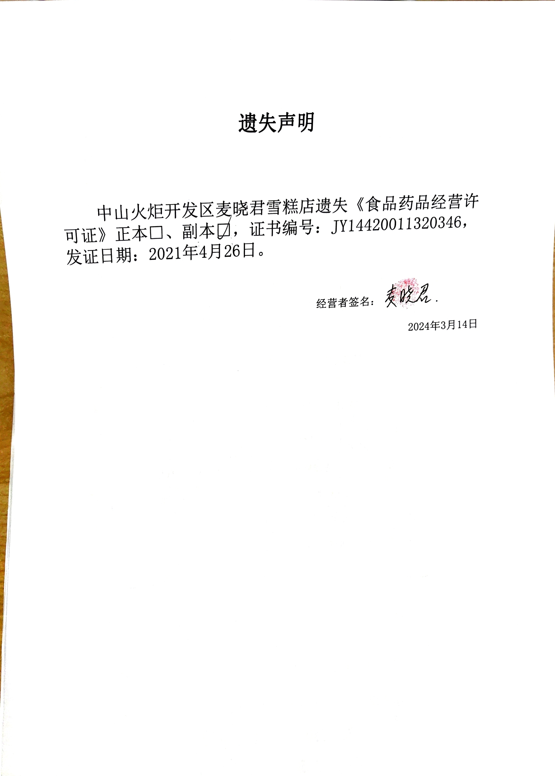 食品药品经营许可证遗失声明(中山火炬开发区麦晓君雪糕店、中山火炬开发区文勤餐饮店、中山火炬开发区枯木百货商店、中山火炬开发区乔乔便利店、中山市火炬开发区石聪餐饮店)