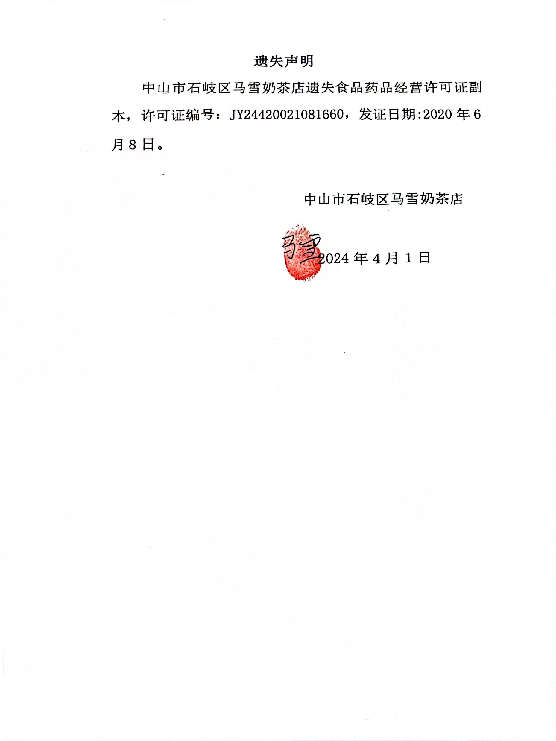 食品药品经营许可证遗失声明(中山市石岐区妮采咖啡店、中山市石岐区马雪奶茶店)