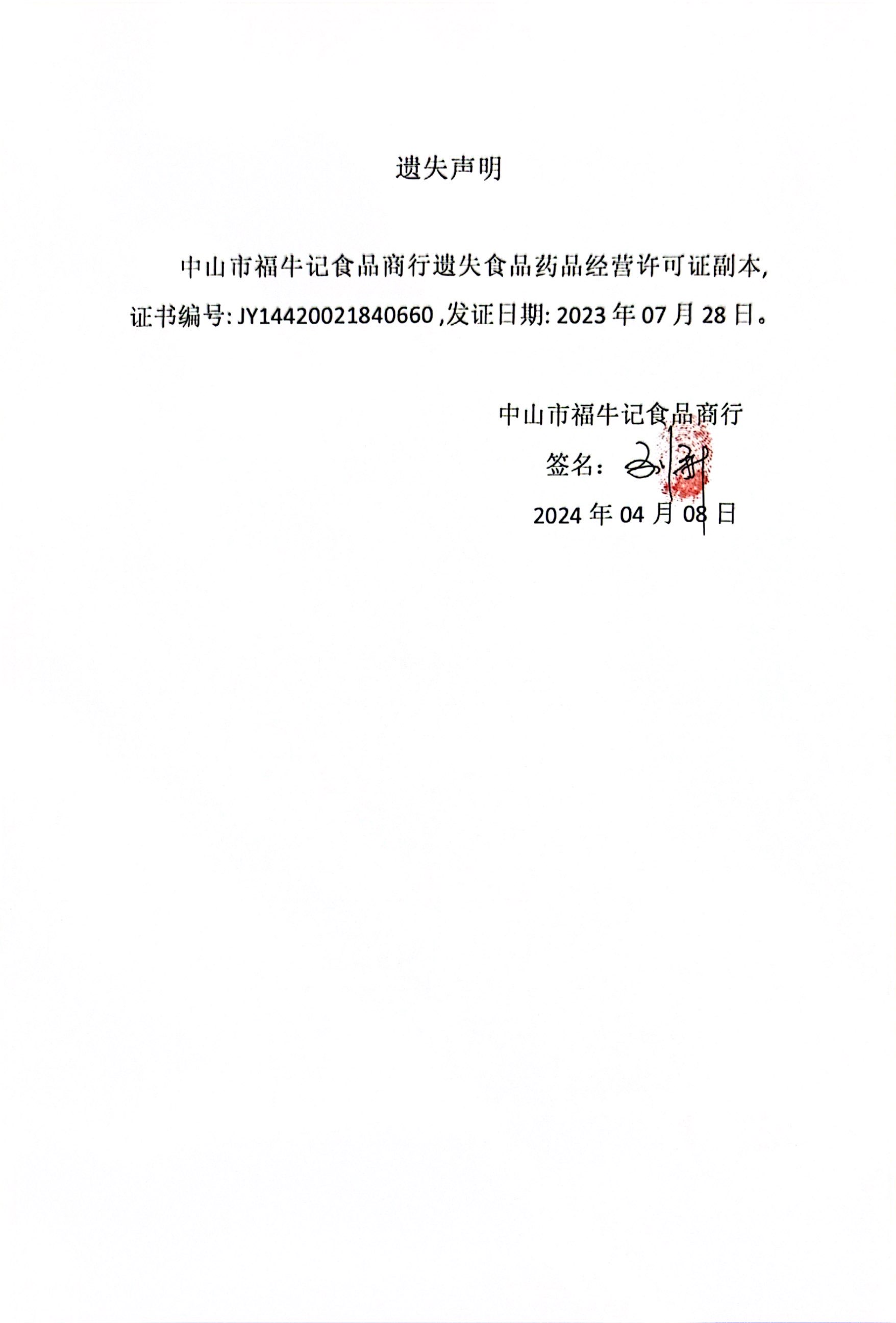 食品药品经营许可证遗失声明(中山市福牛记食品商行)