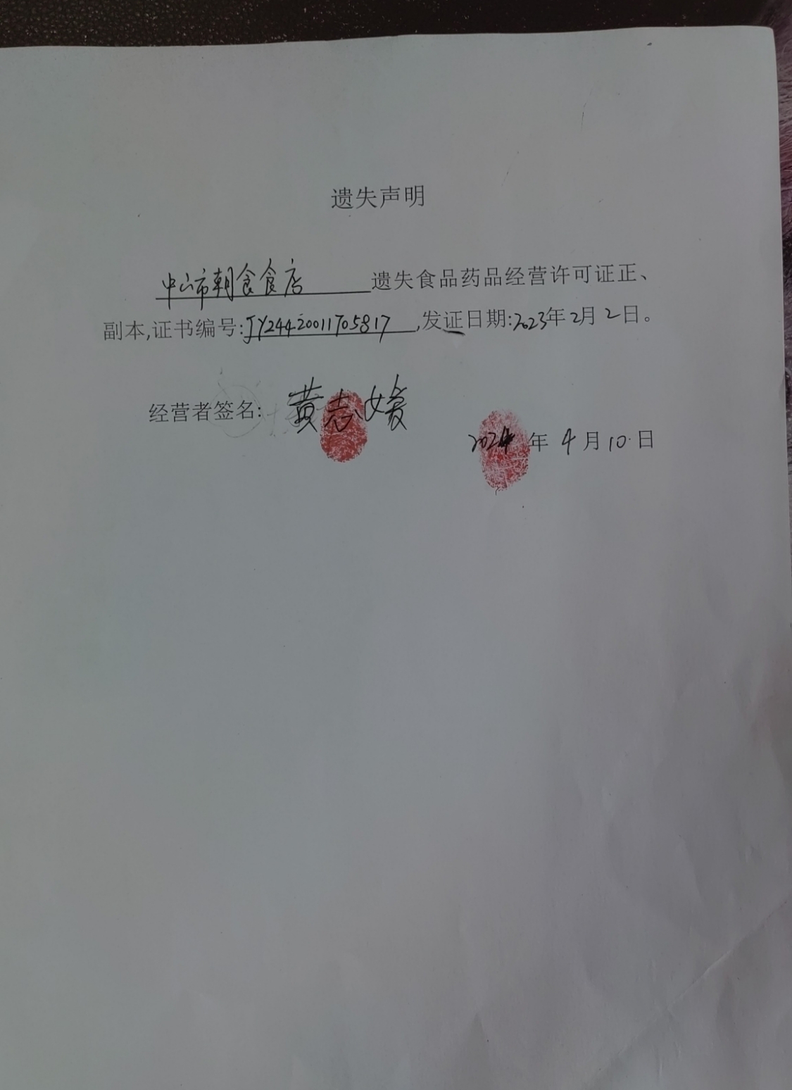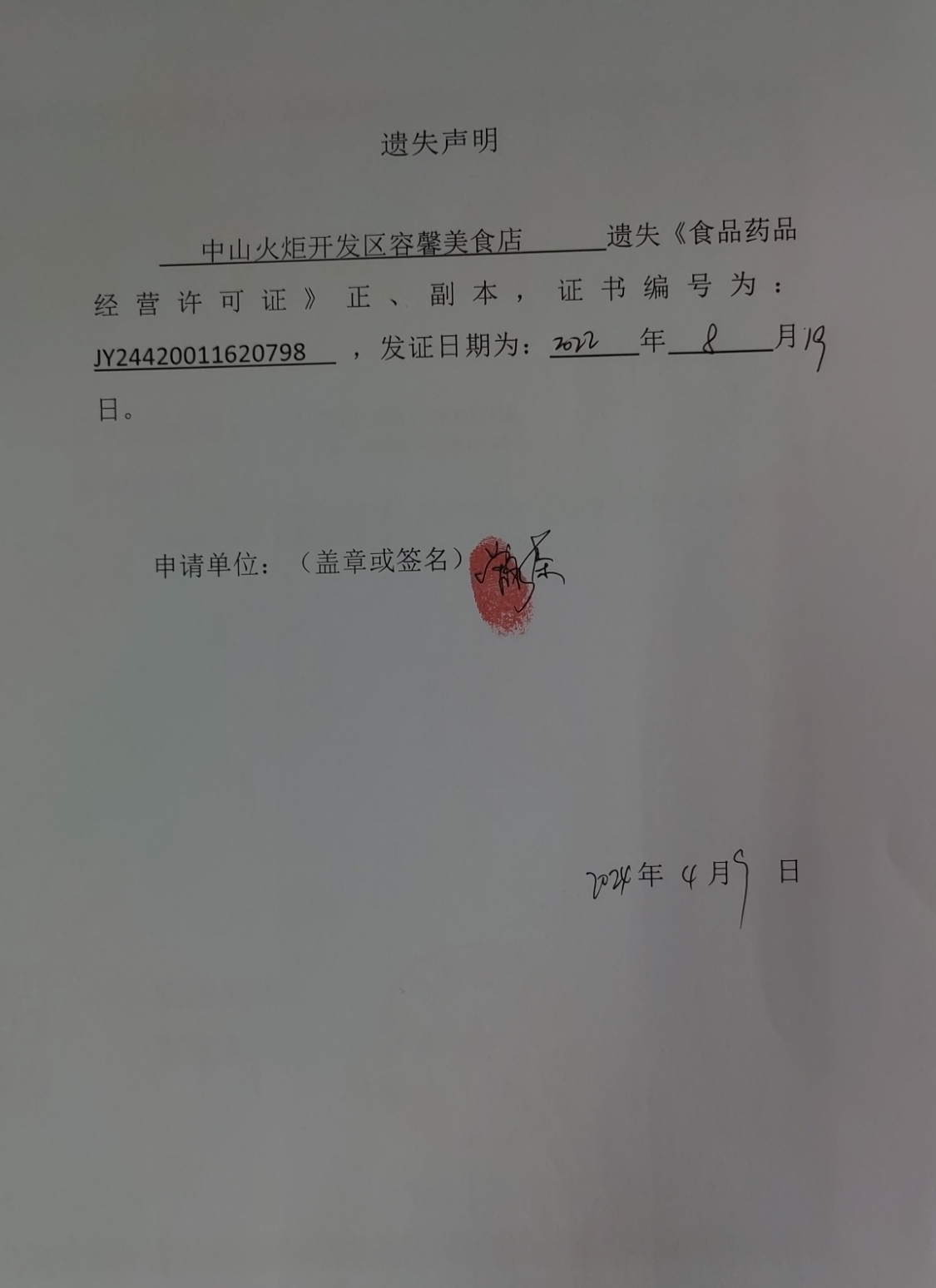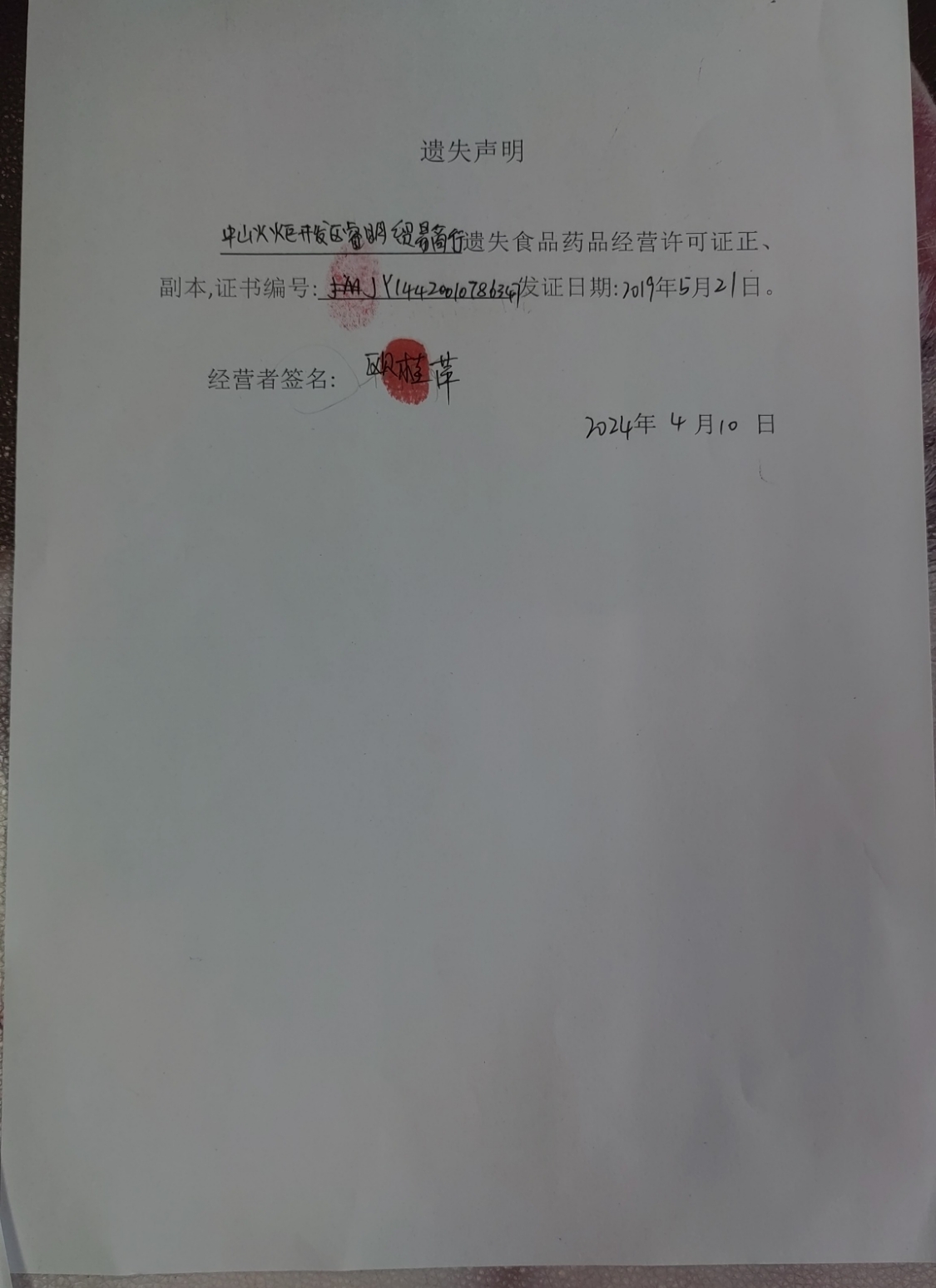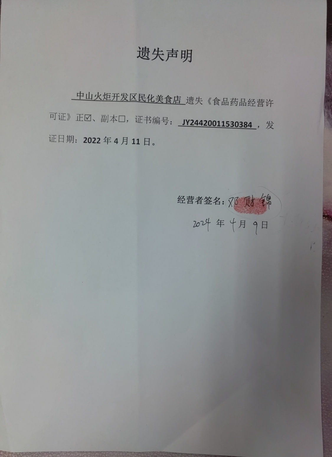 食品药品经营许可证遗失声明(中山火炬开发区民化美食店、中山火炬开发区容馨美食店、中山火炬开发区睿明贸易商行、中山市朝食食店、中山市火炬开发区提江餐饮店(个体工商户))