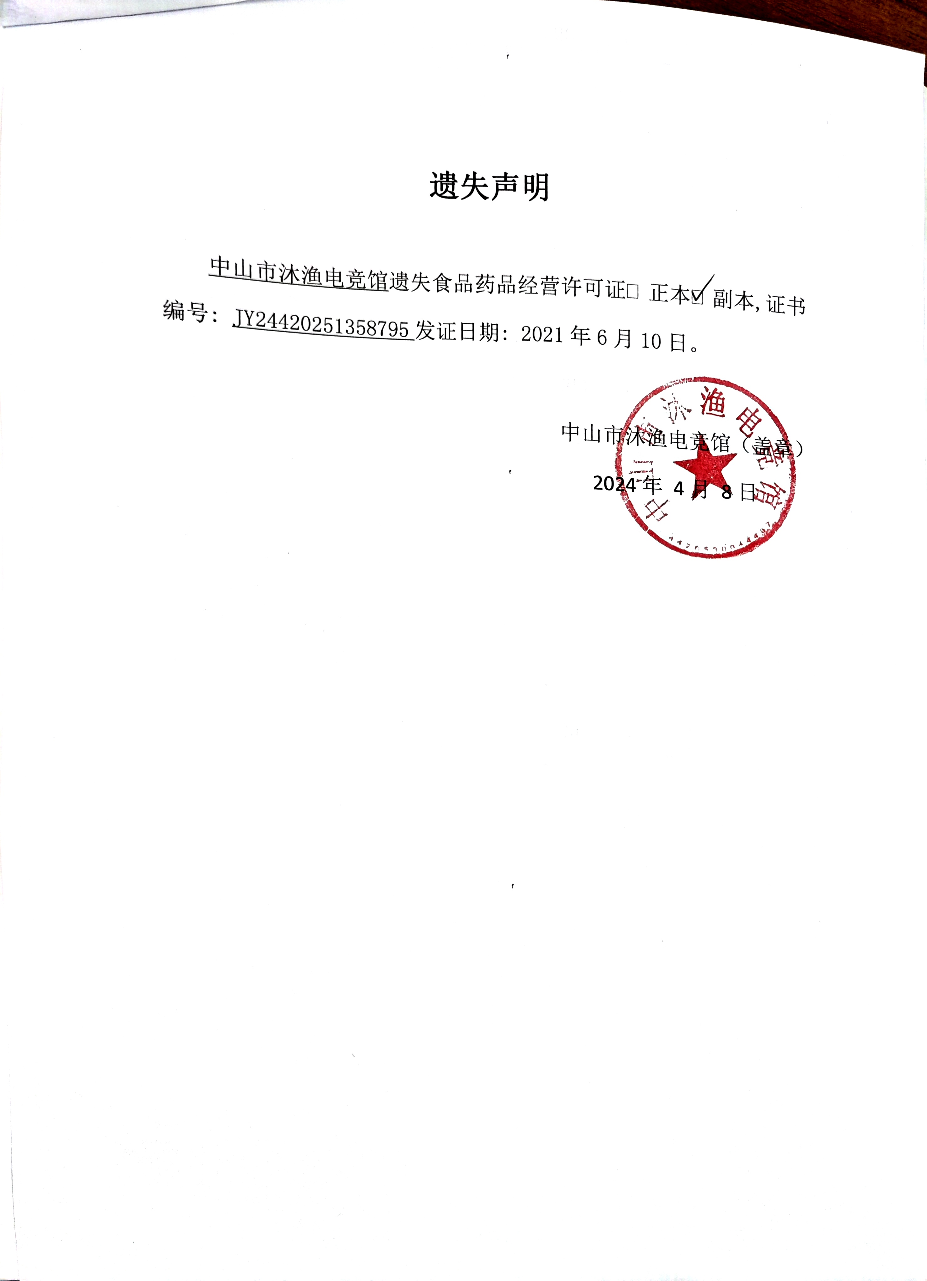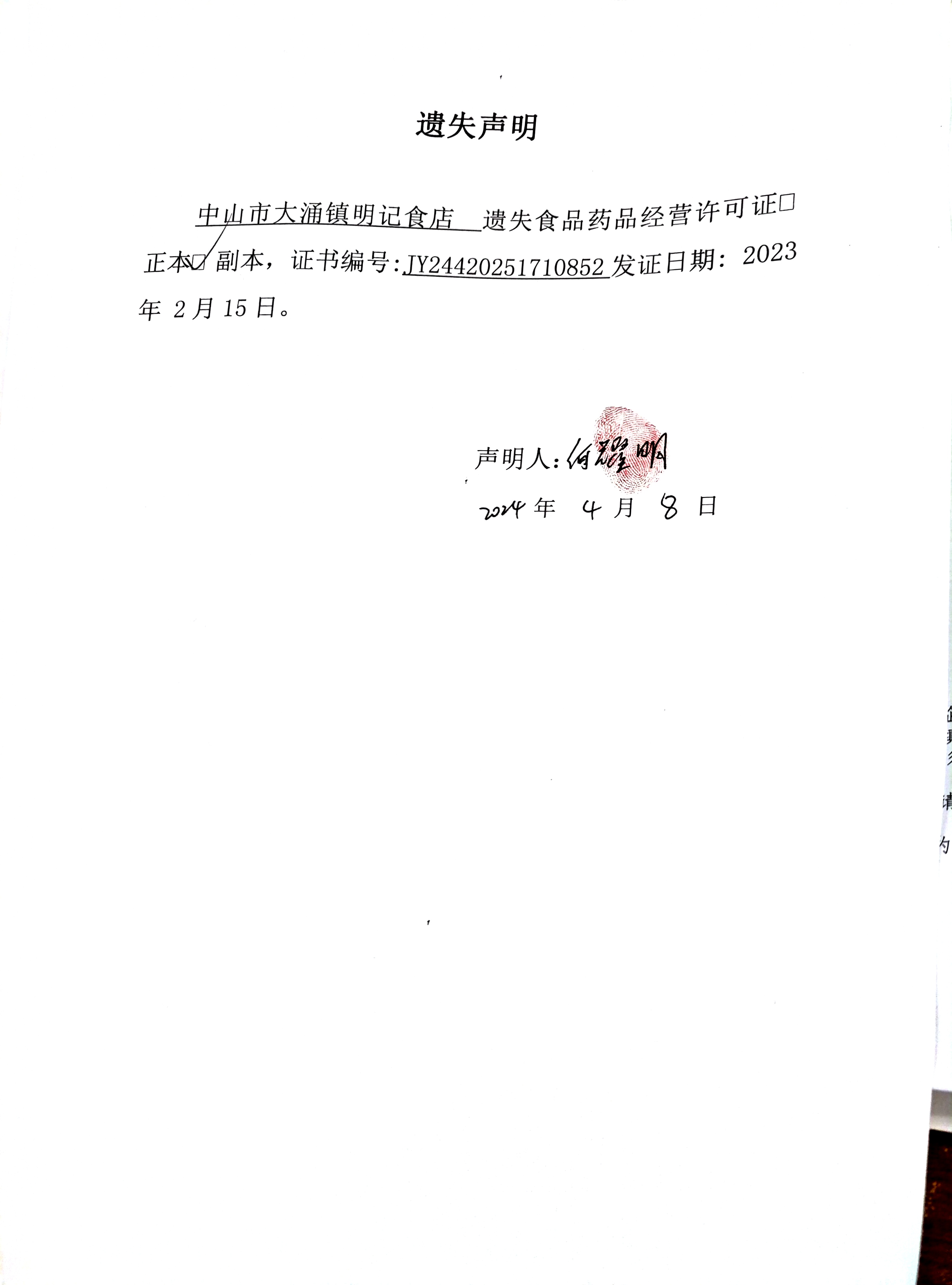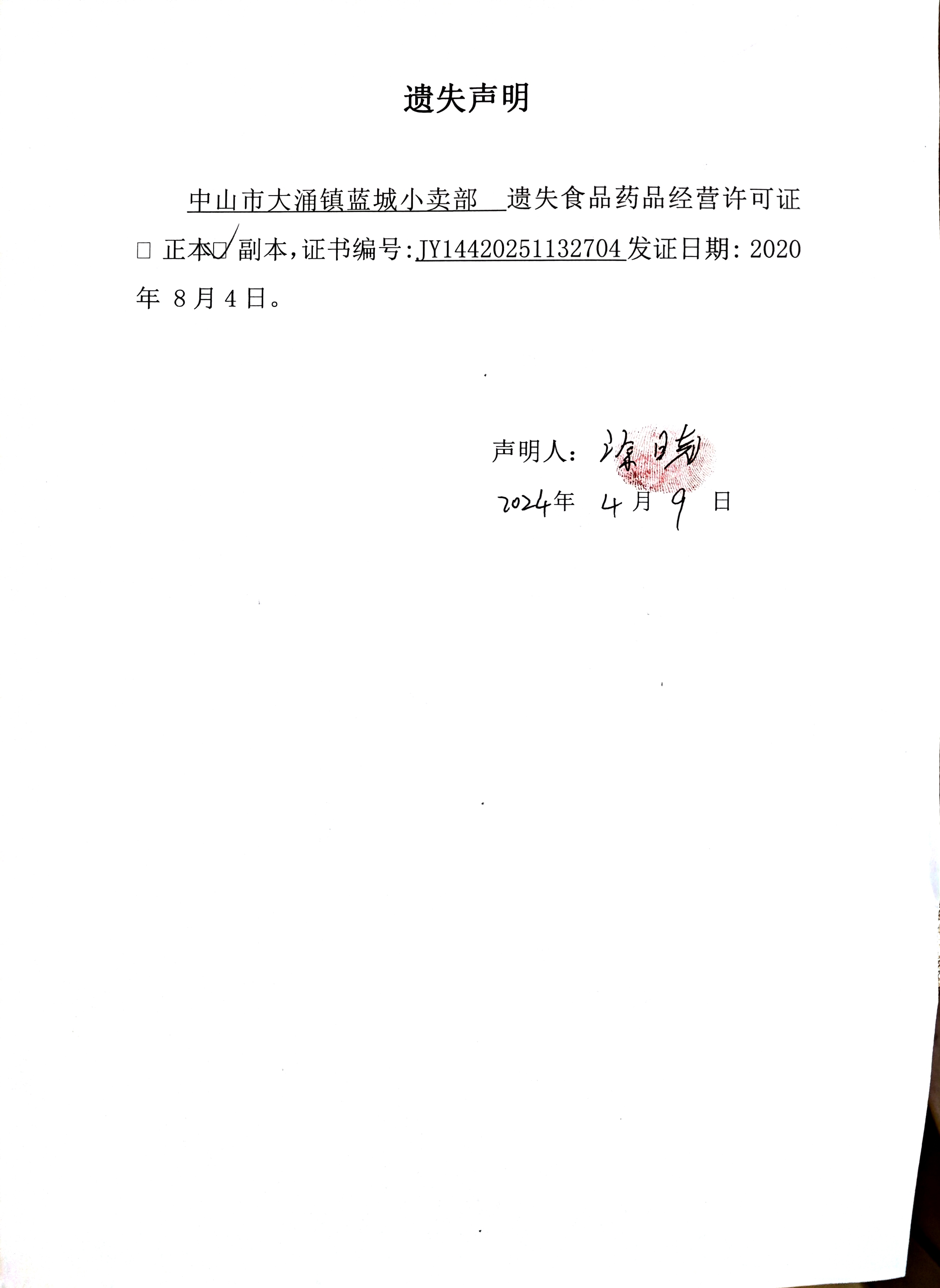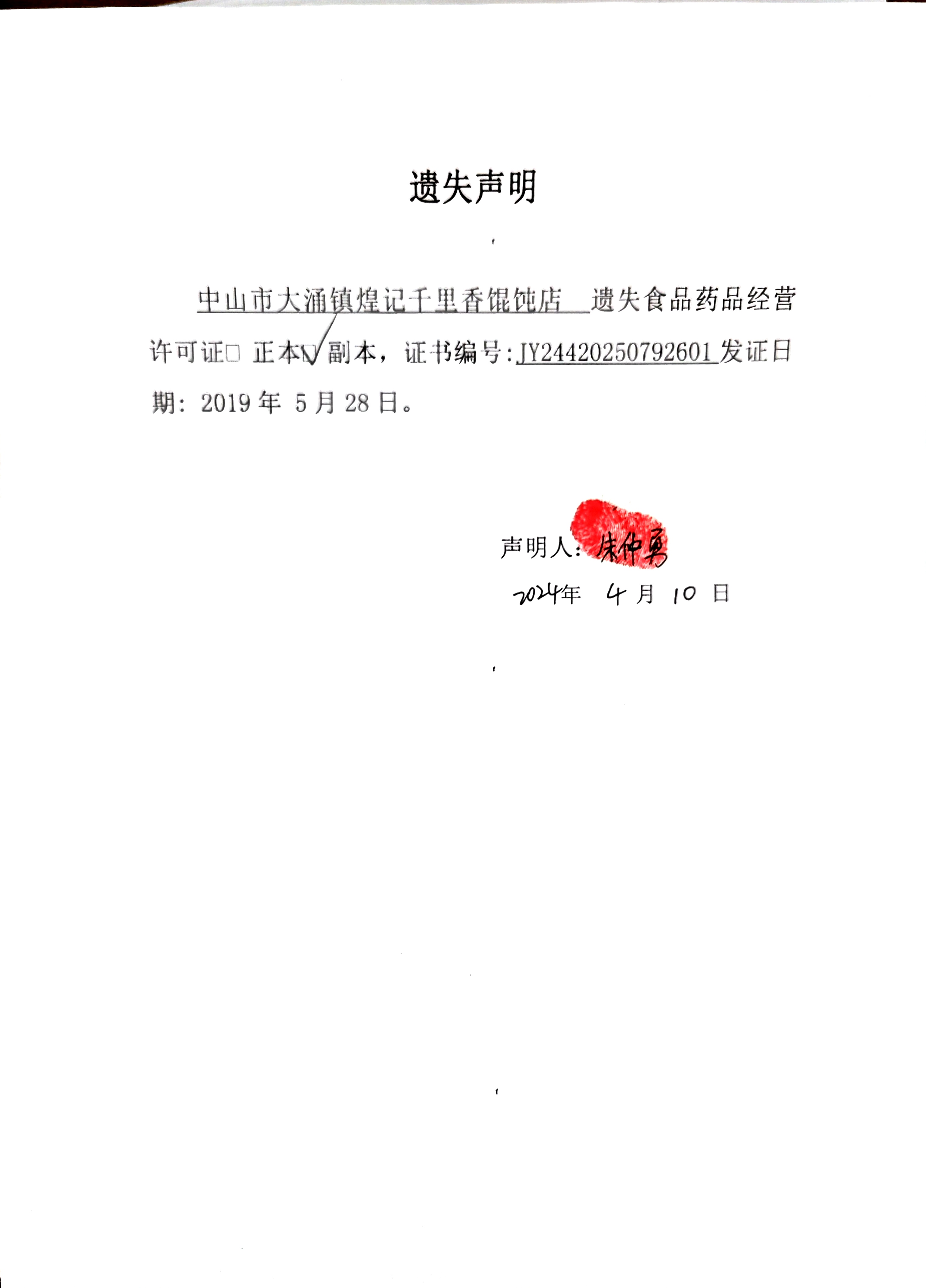 食品药品经营许可证遗失声明(中山市大涌镇煌记千里香馄饨店、中山市大涌镇蓝城小卖部、中山市大涌镇明记食店、中山市沐渔电竞馆 )