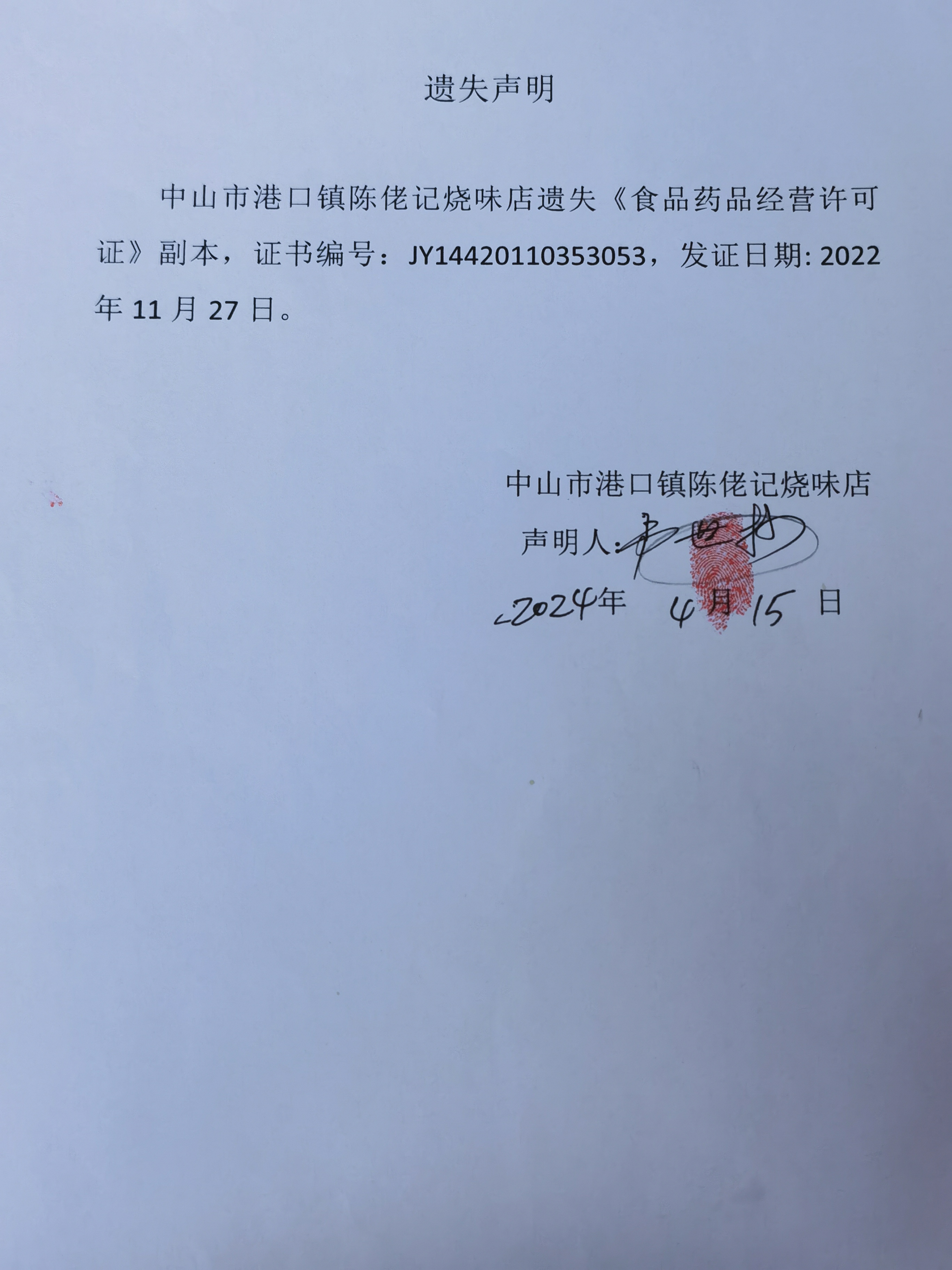 食品药品经营许可证遗失声明(中山市港口镇福安堂药店、中山市港口镇陈佬记烧味店、中山市港口镇冷萃餐饮店、中山市大水田餐厅)