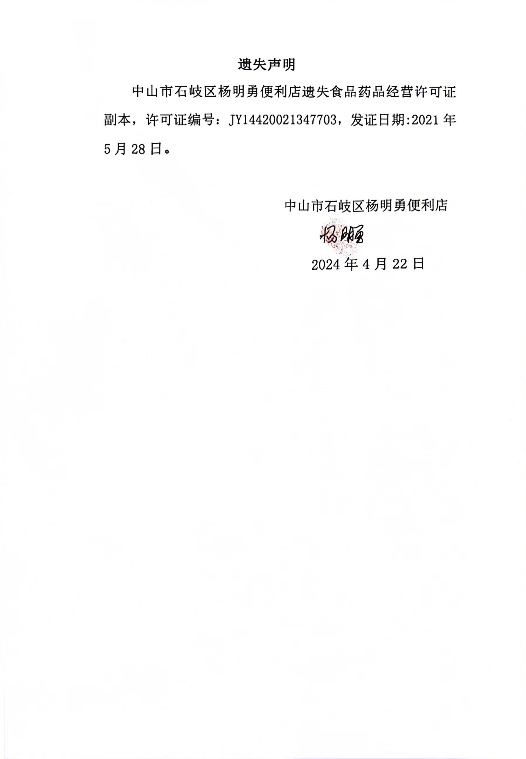 食品药品经营许可证遗失声明(中山市石岐区杨明勇便利店)