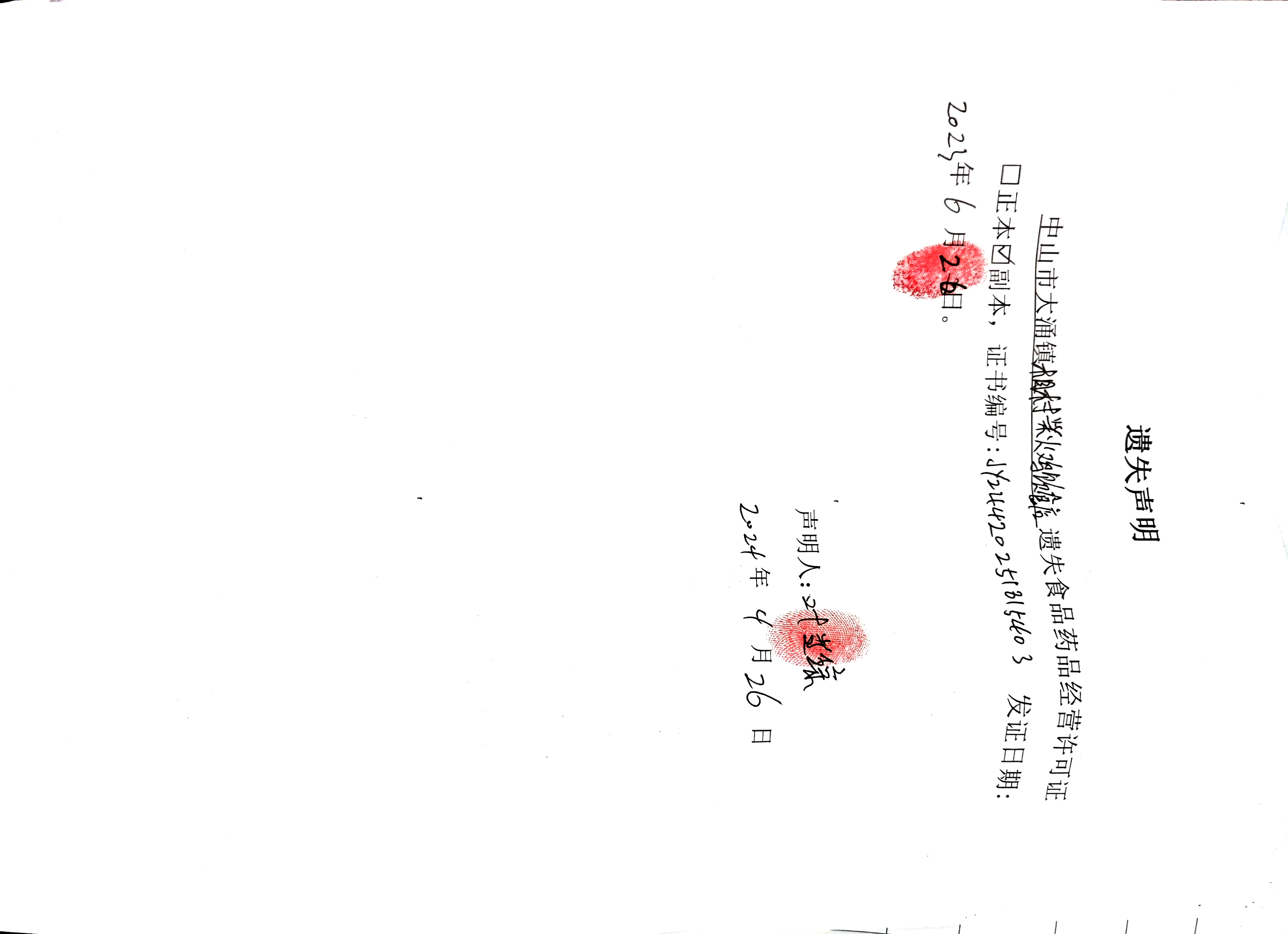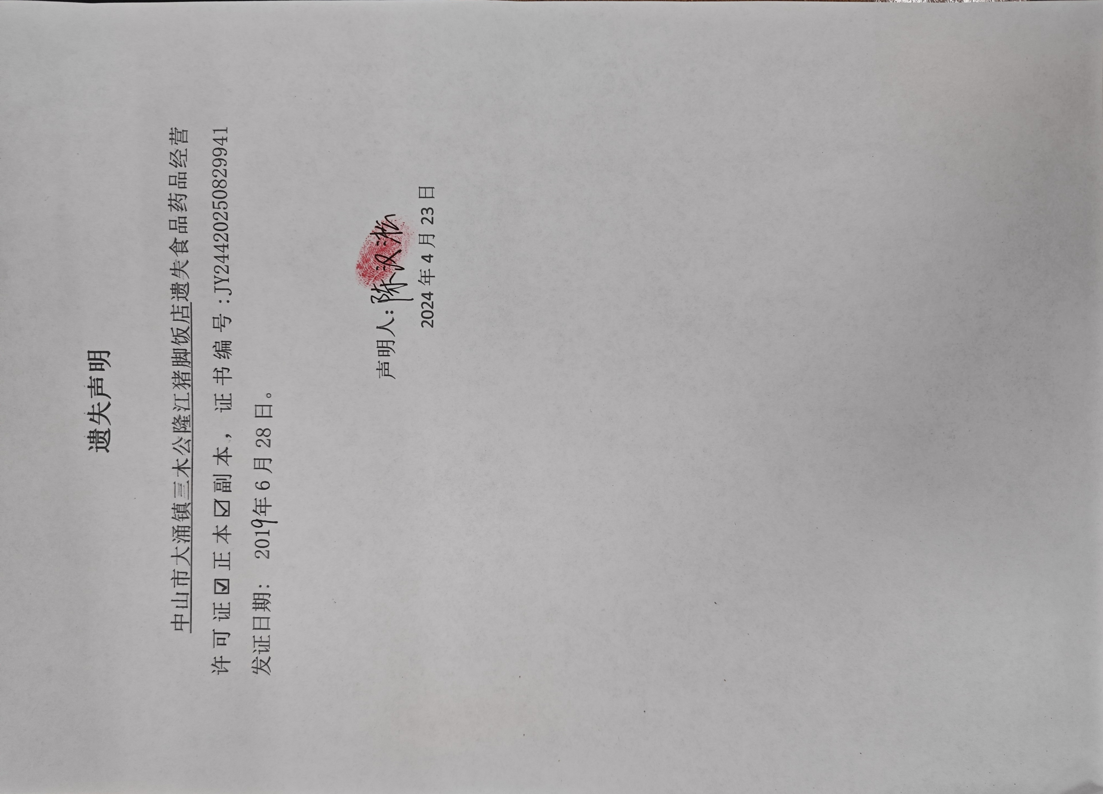食品药品经营许可证遗失声明(中山市大涌镇三木公隆江猪脚饭店、中山市大涌镇相村柴火鸡饮食店)