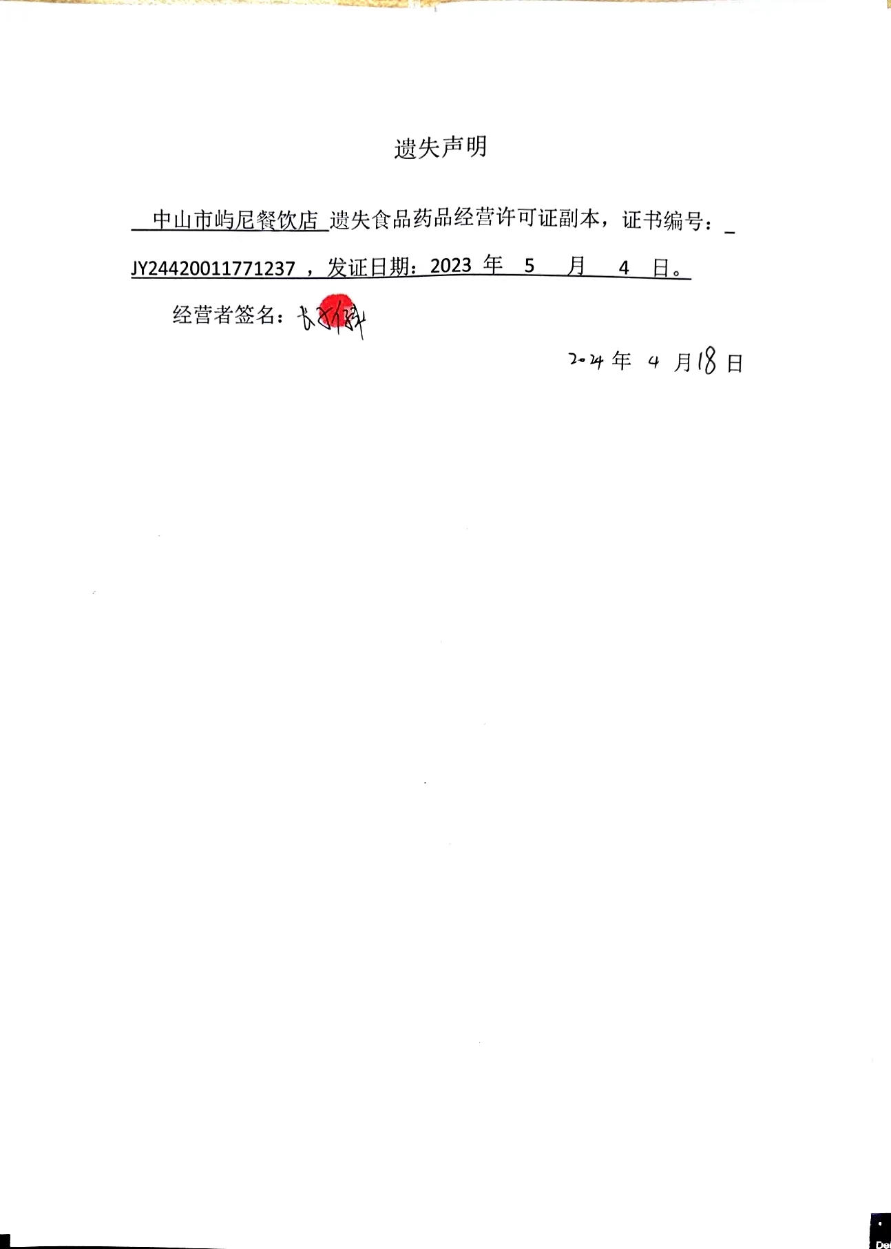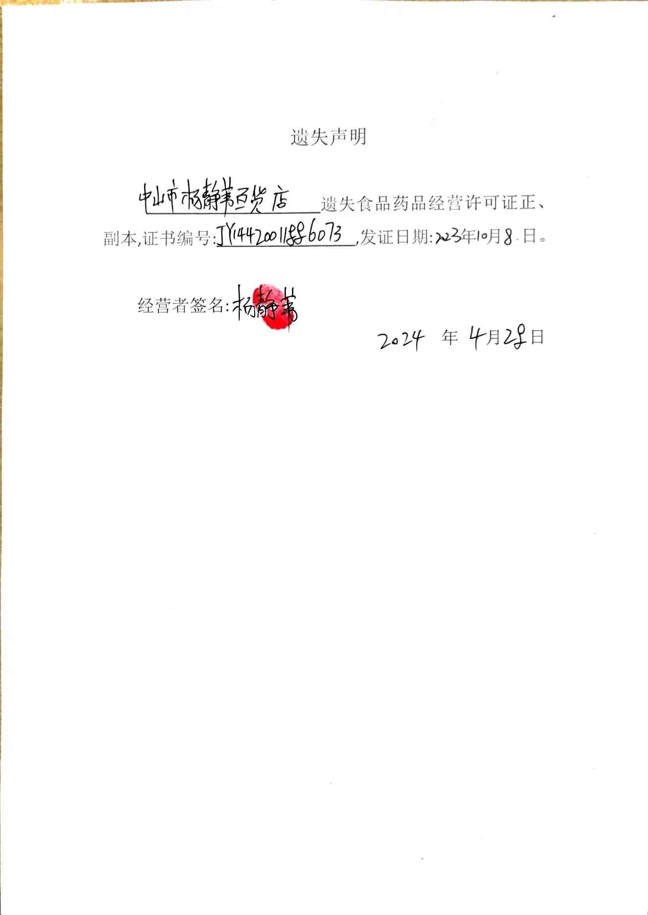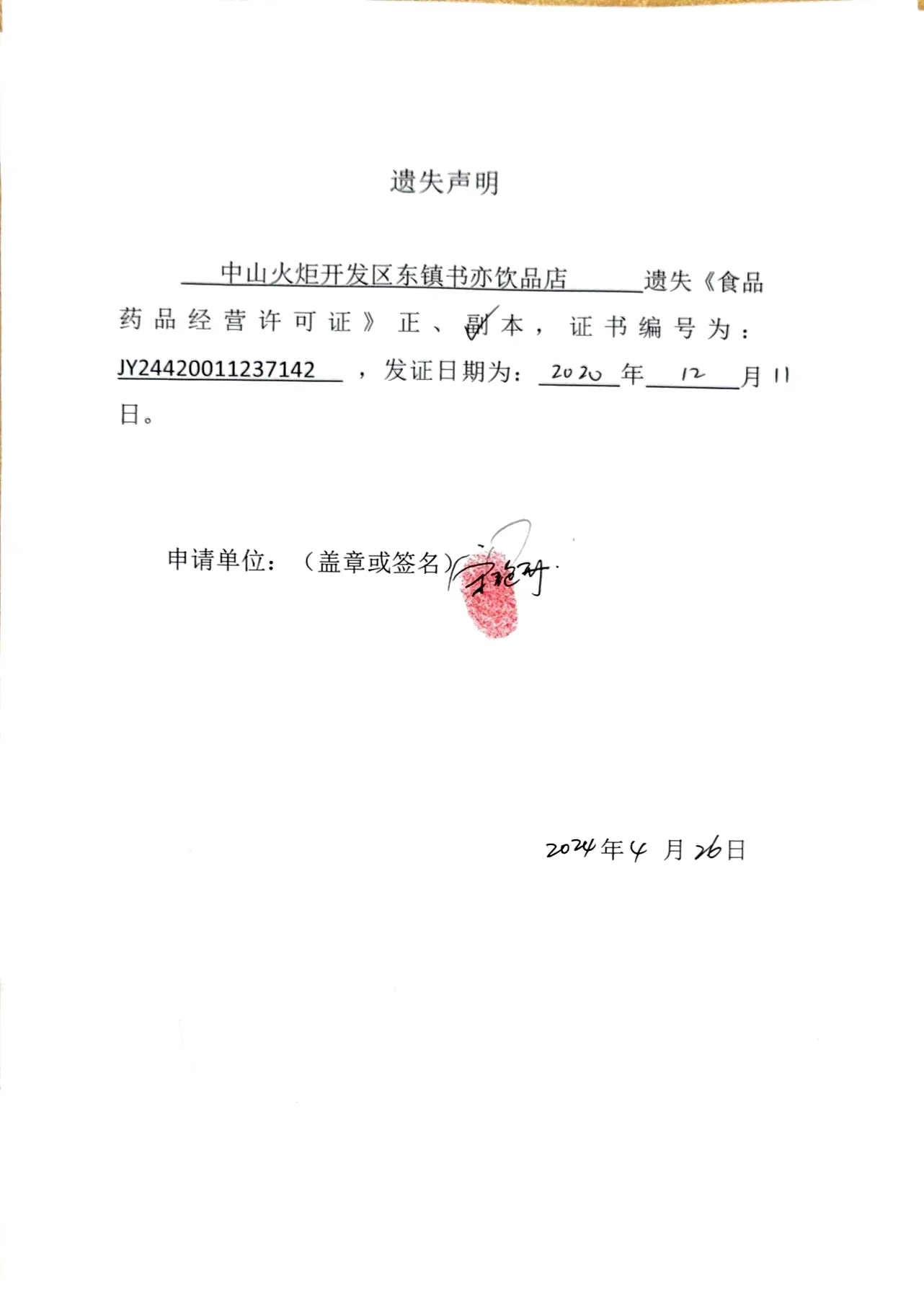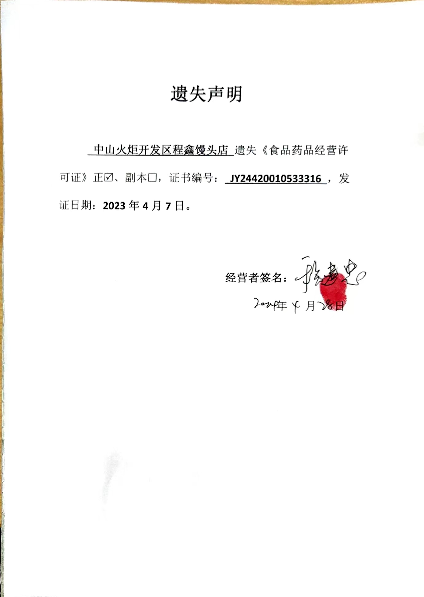 食品药品经营许可证遗失声明(中山火炬开发区东镇书亦饮品店、中山市屿尼餐饮店、中山市杨静苇百货店、中山火炬开发区程鑫馒头店)