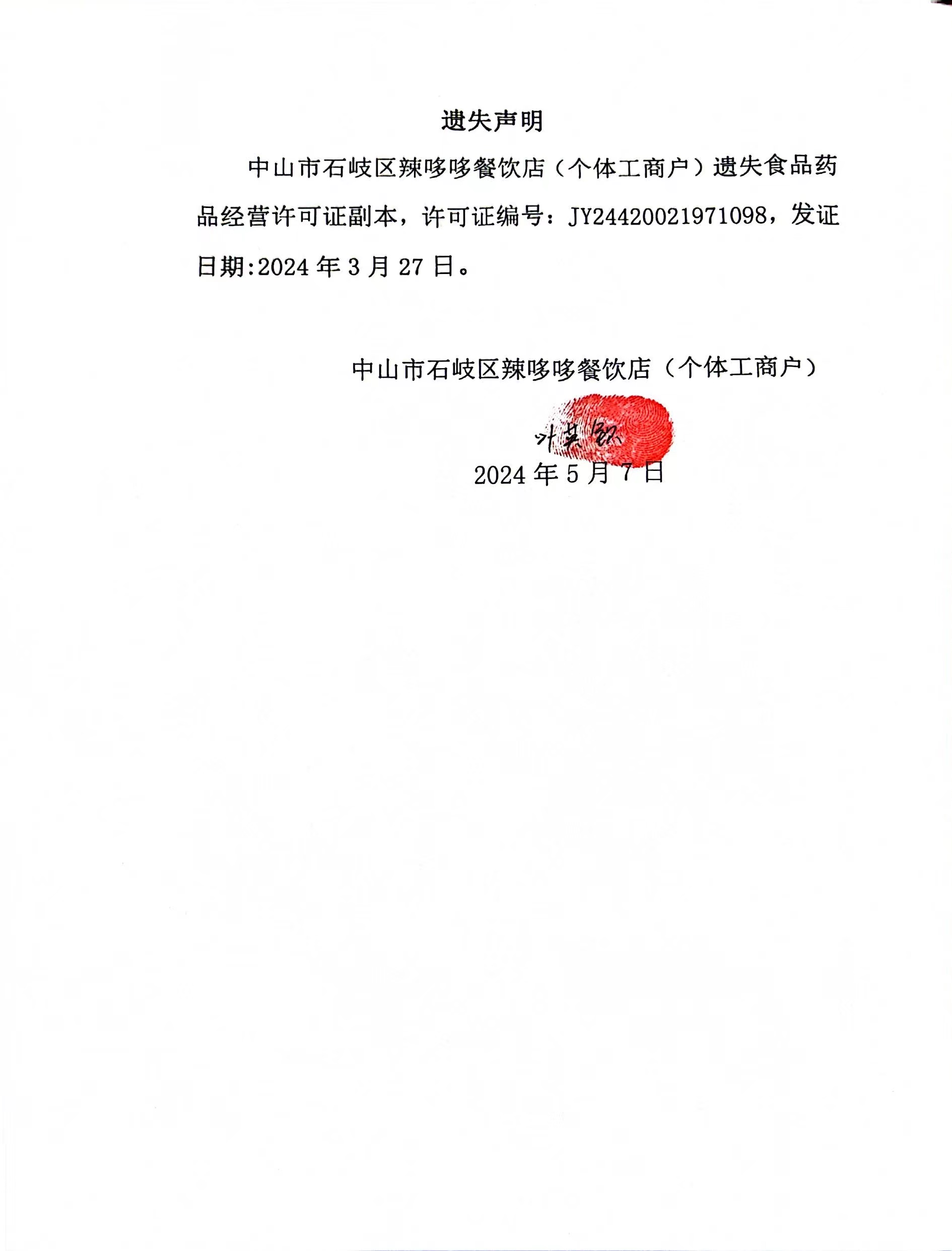 食品药品经营许可证遗失声明(中山市石岐区辣哆哆餐饮店(个体工商户)、中山市石岐区邓小可小笼包店)