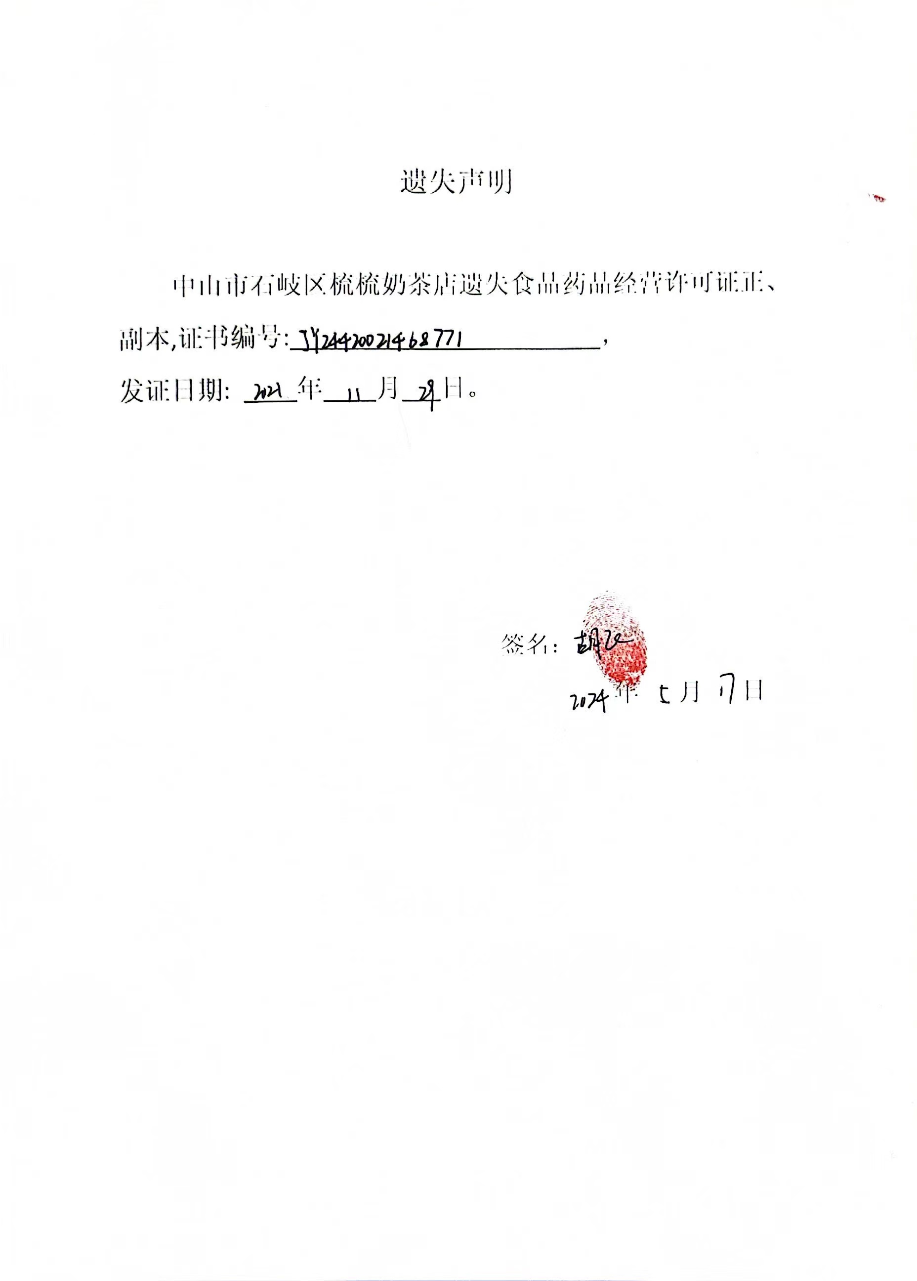 食品药品经营许可证遗失声明(中山市石岐区梳梳奶茶店)