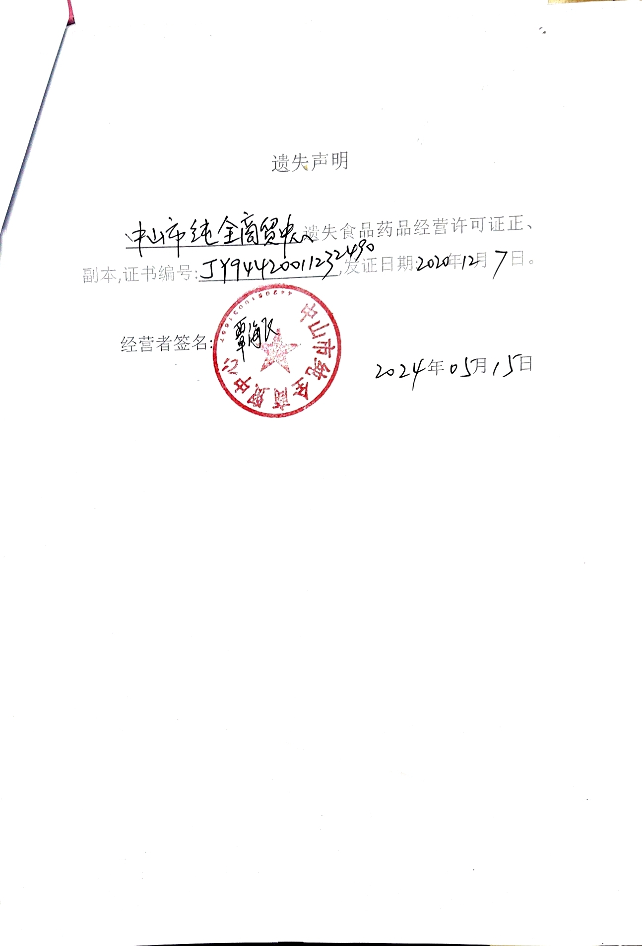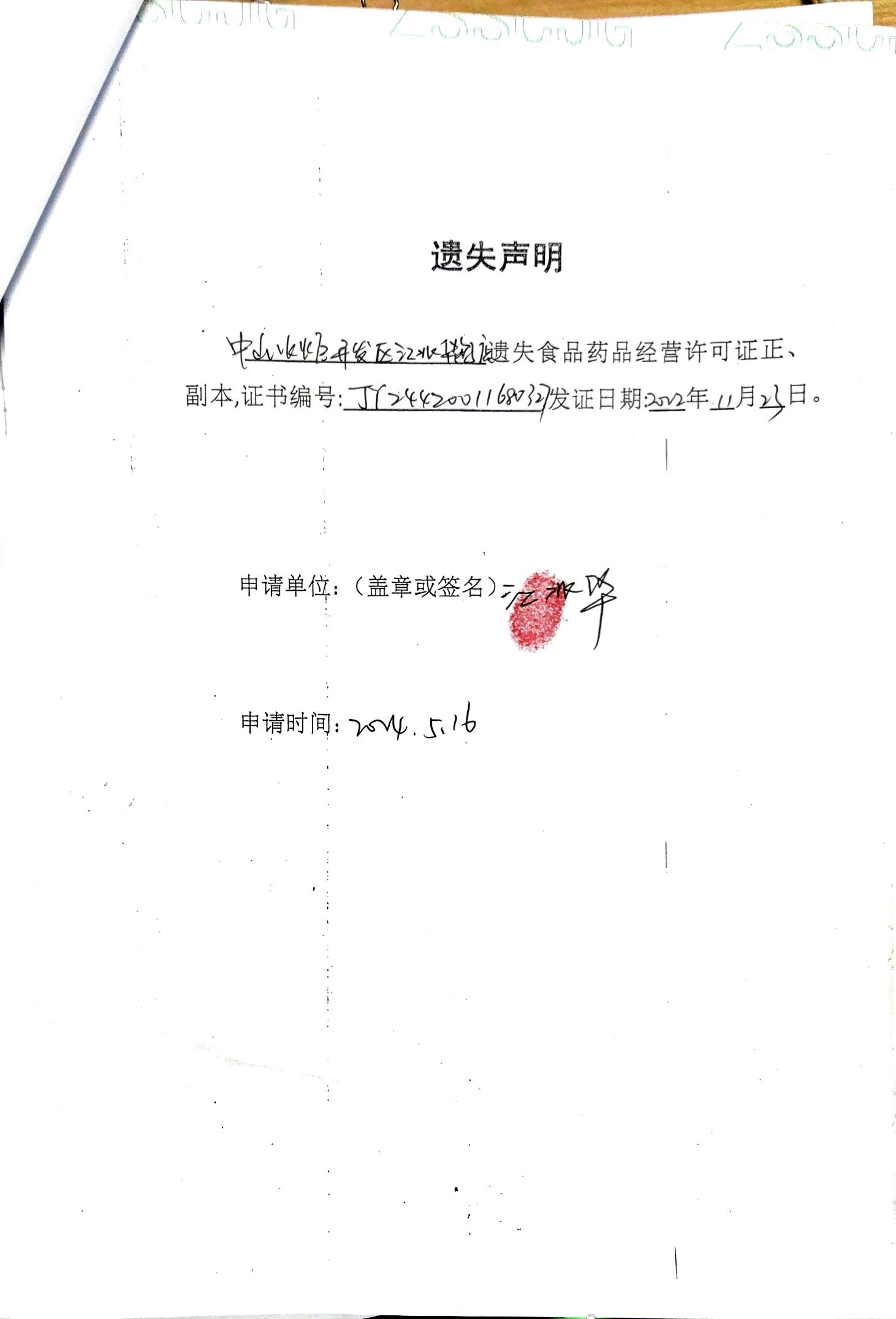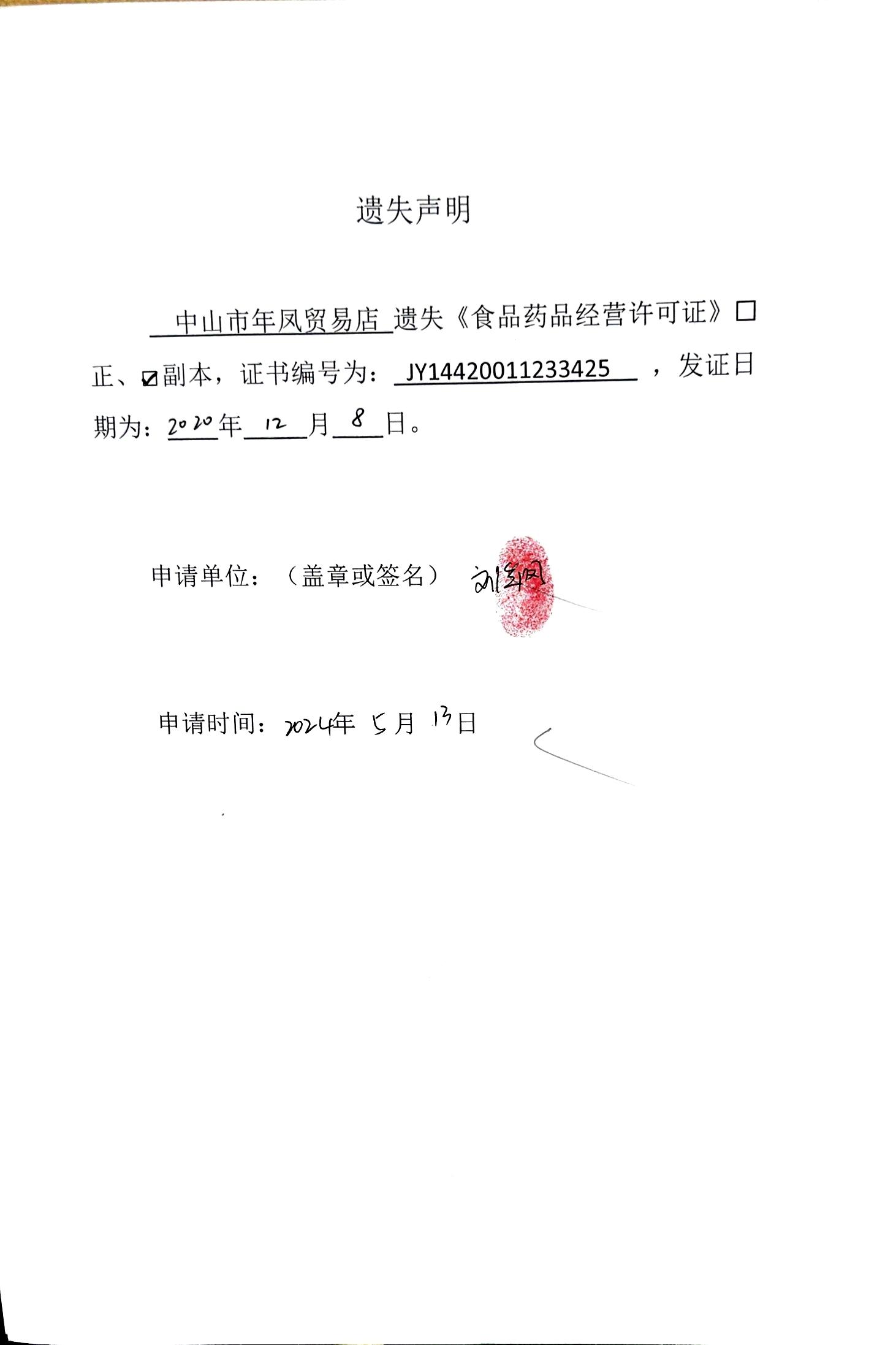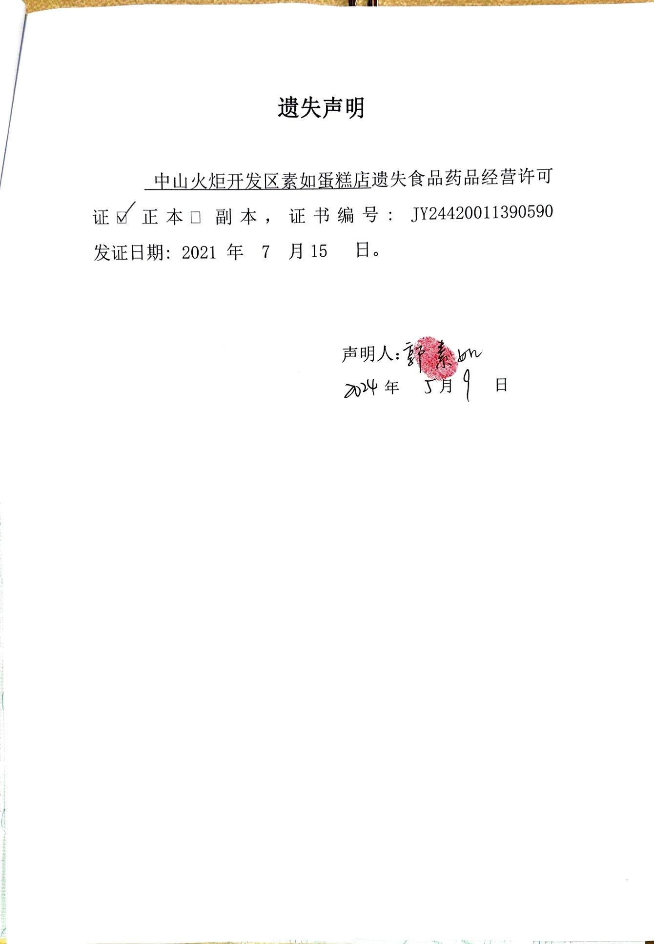 食品药品经营许可证遗失声明(中山火炬开发区素如蛋糕店、中山市年凤贸易店、中山火炬开发区江兆华包子店、中山市纯全商贸中心)