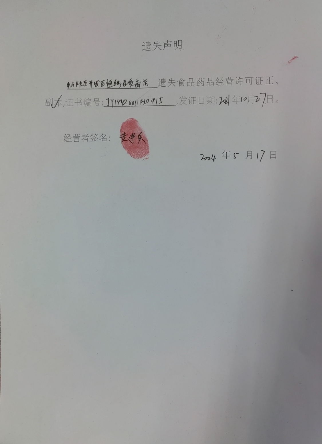 食品药品经营许可证遗失声明(中山火炬开发区恒缘百货商店)