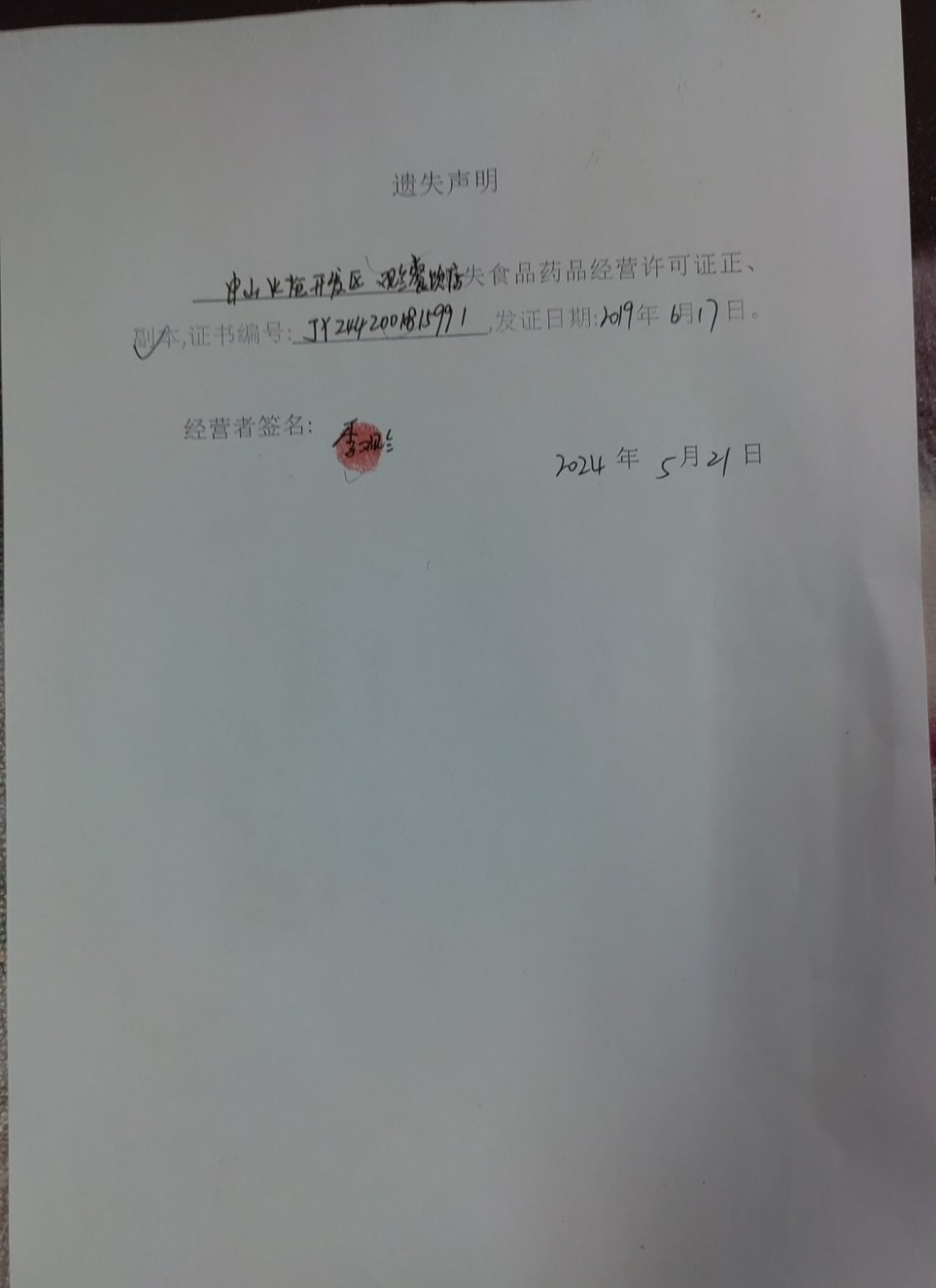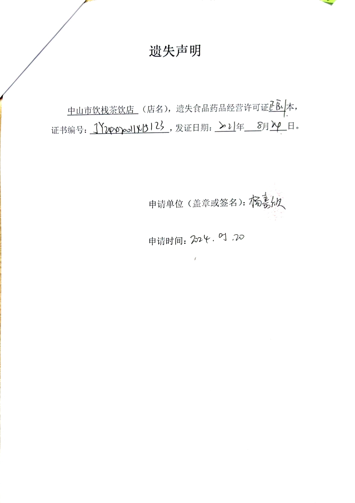 食品药品经营许可证遗失声明(中山市饮栈茶饮店、广东明丰饮食管理服务有限公司、中山火炬开发区观兰餐饮店、中山市摩力卡酒店有限公司)