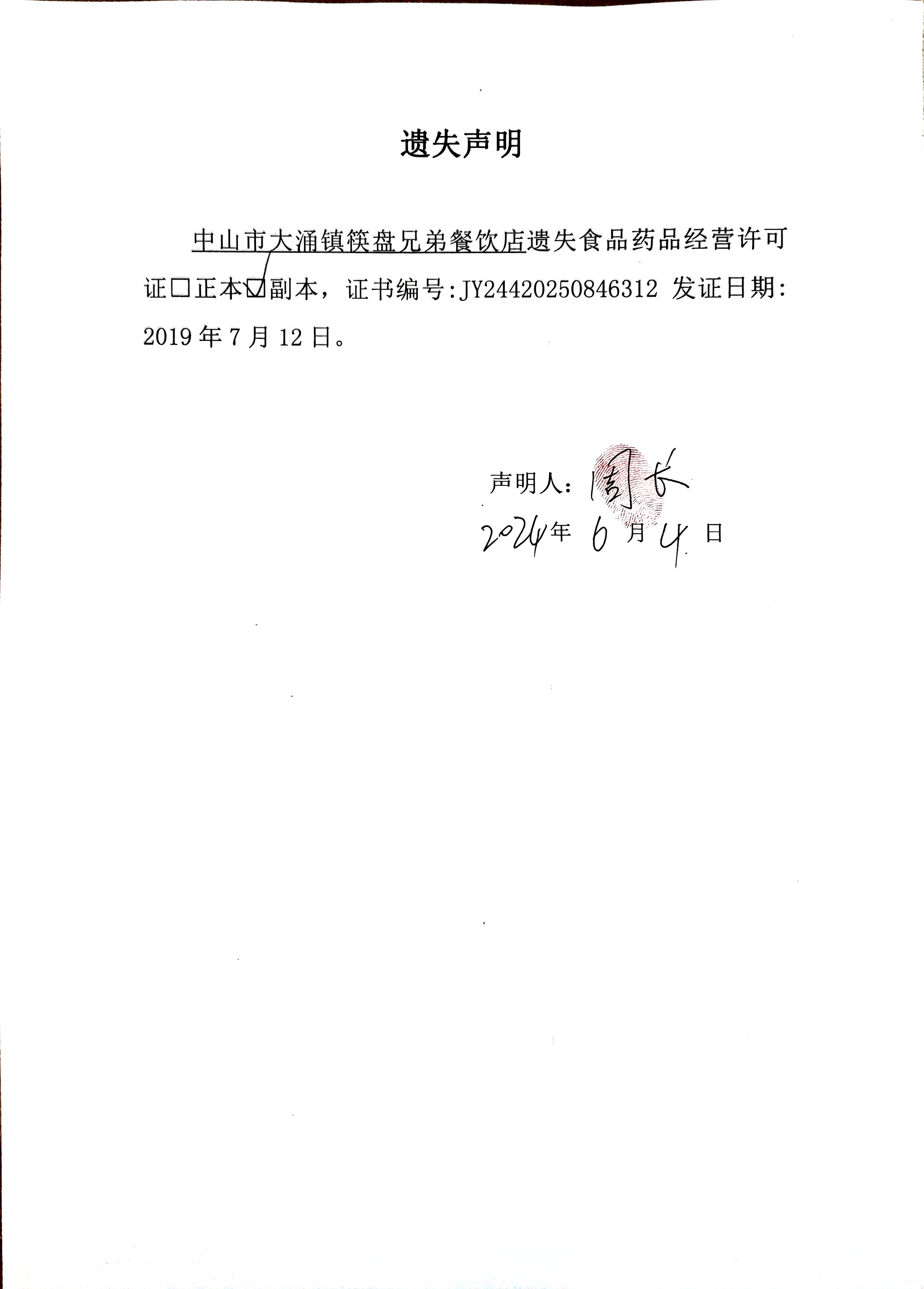 食品药品经营许可证遗失声明(中山市大涌镇筷盘兄弟餐饮店)