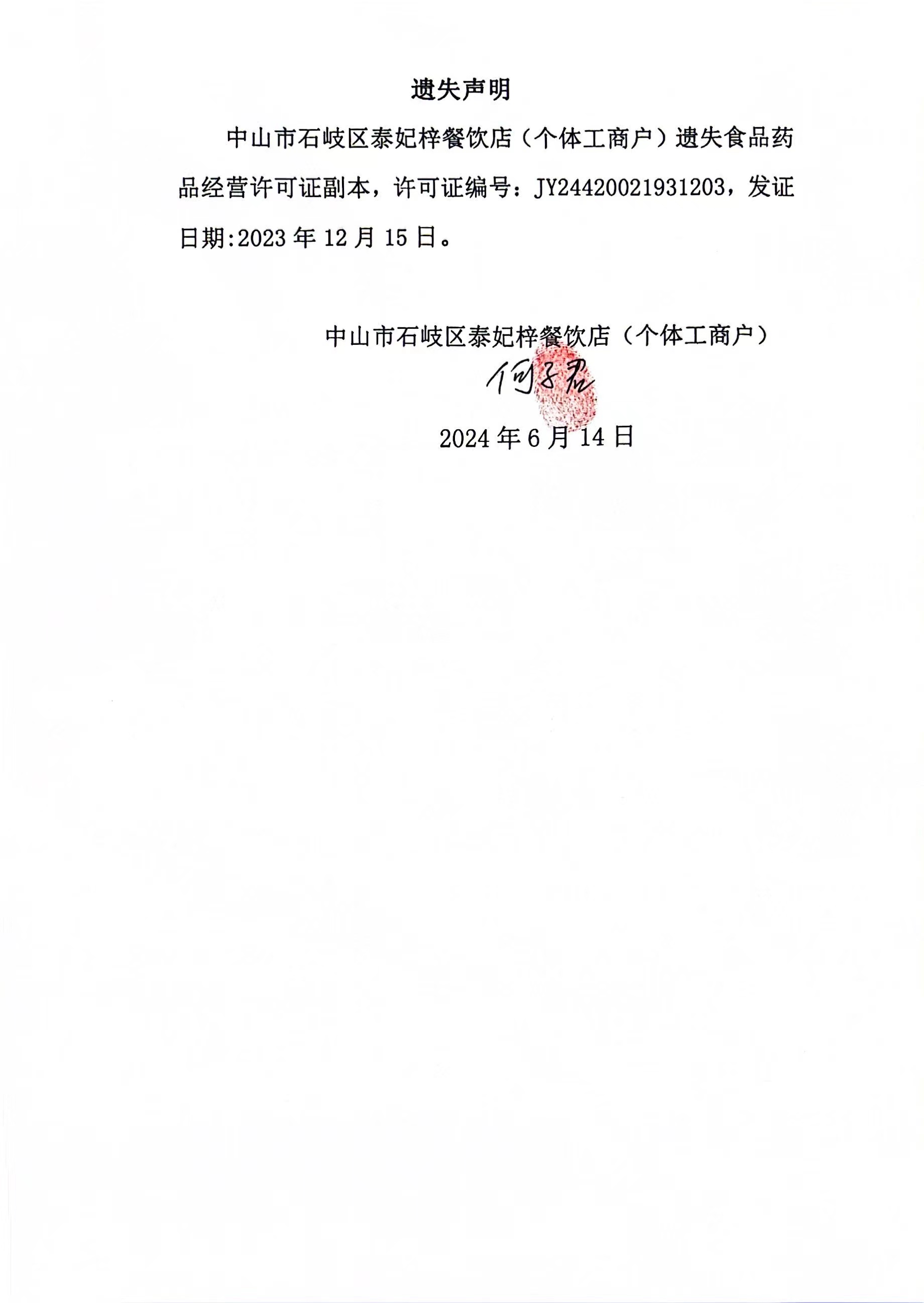 食品药品经营许可证遗失声明(中山市石岐区泰妃梓餐饮店(个体工商户))