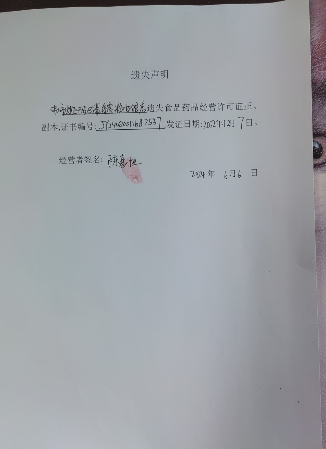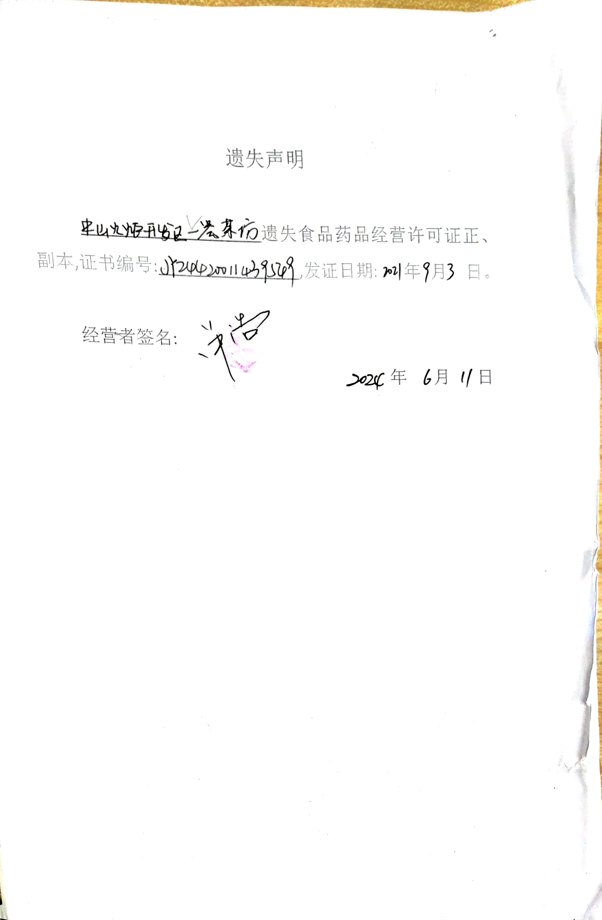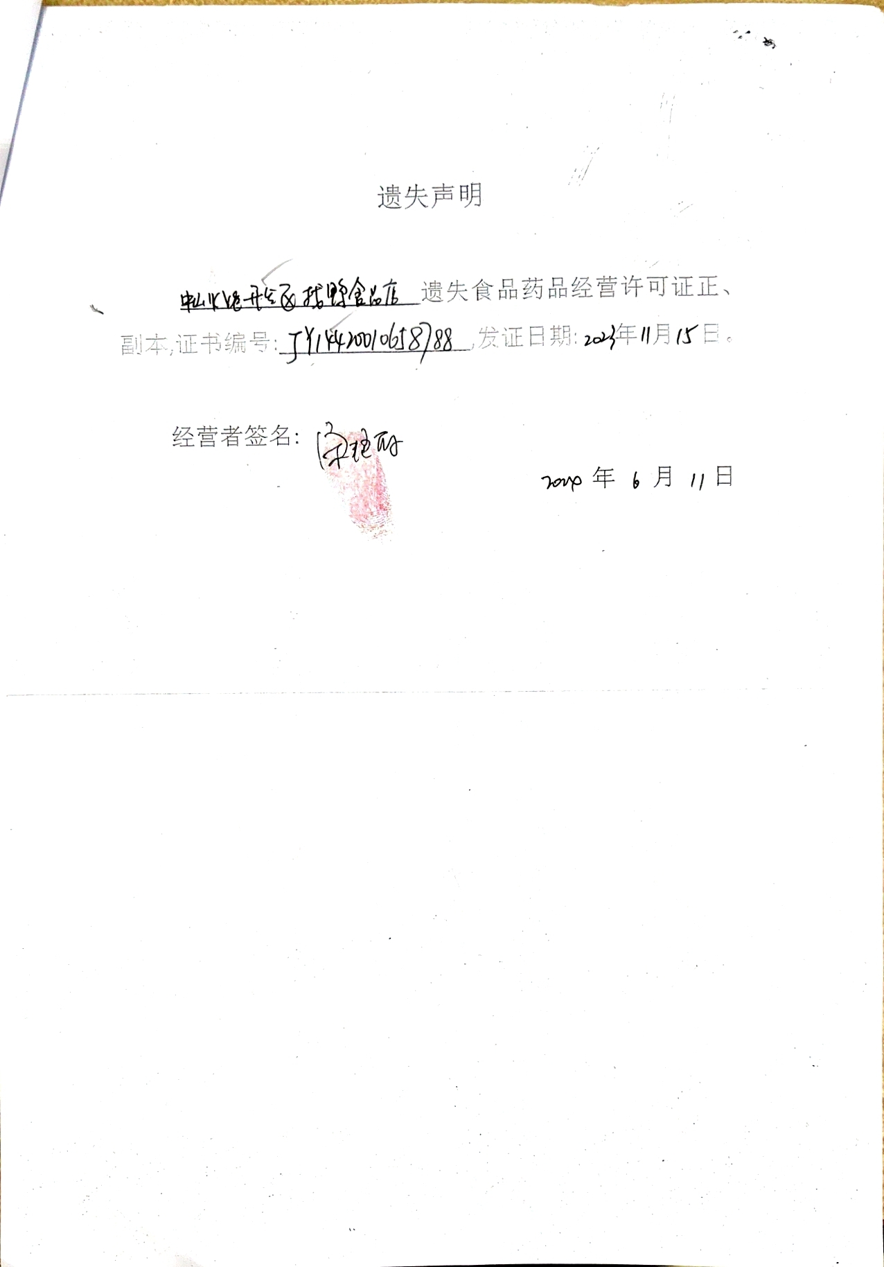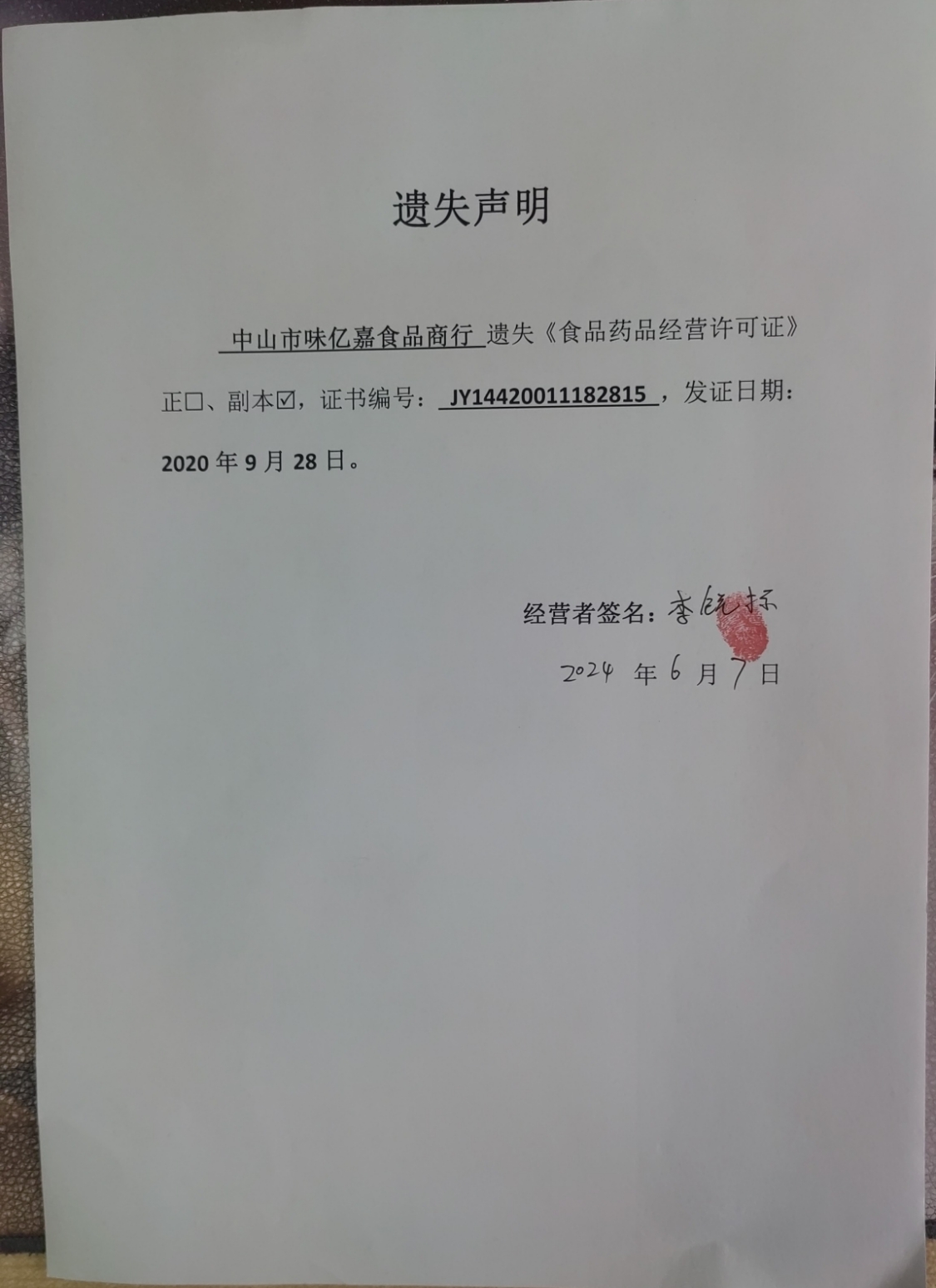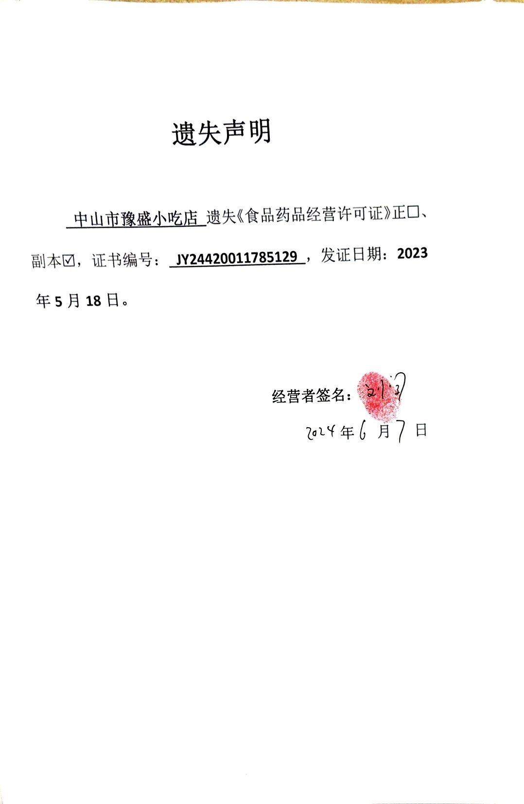 食品药品经营许可证遗失声明(中山火炬开发区一誉茶坊、中山火炬开发区找鸭食品店、中山市火炬开发区濠岛客粉面馆店、中山市味亿嘉食品商行、中山市豫盛小吃店)