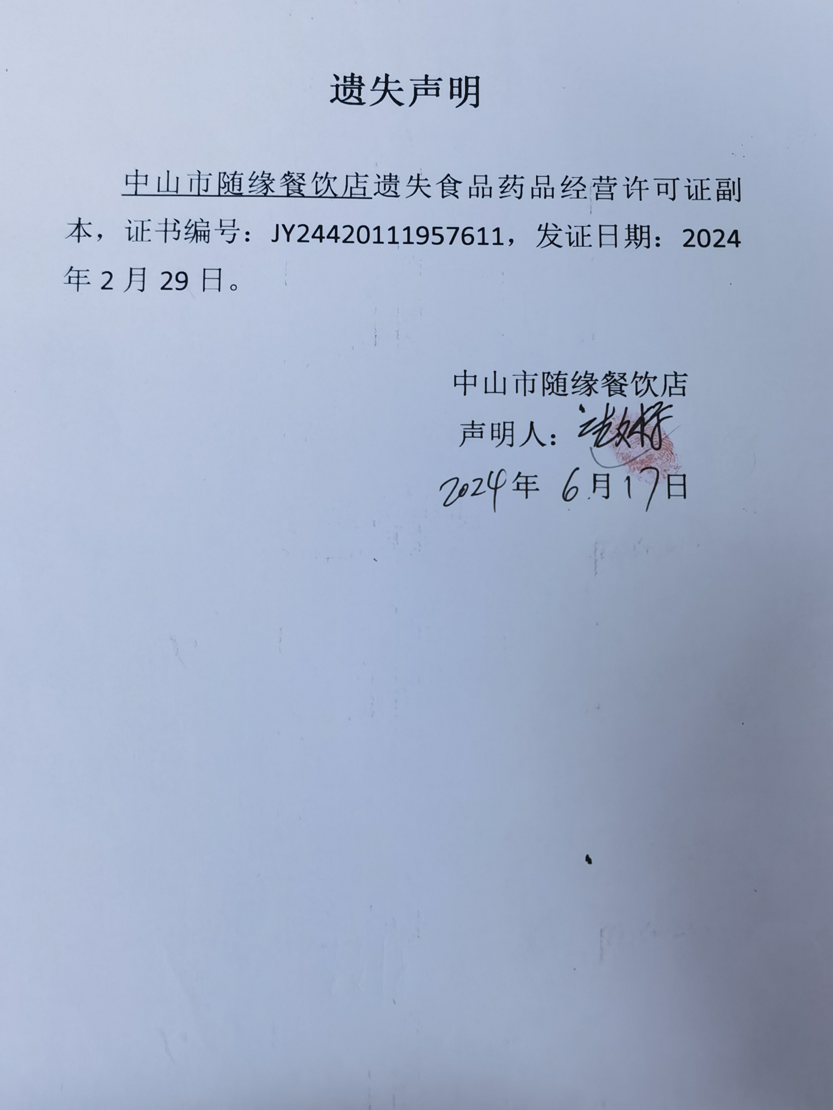 食品药品经营许可证遗失声明(中山市港口镇志陈餐饮店、中山市随缘餐饮店、中山市港口镇爽心食品商行 、中山市港口镇易搵茶档餐饮店)