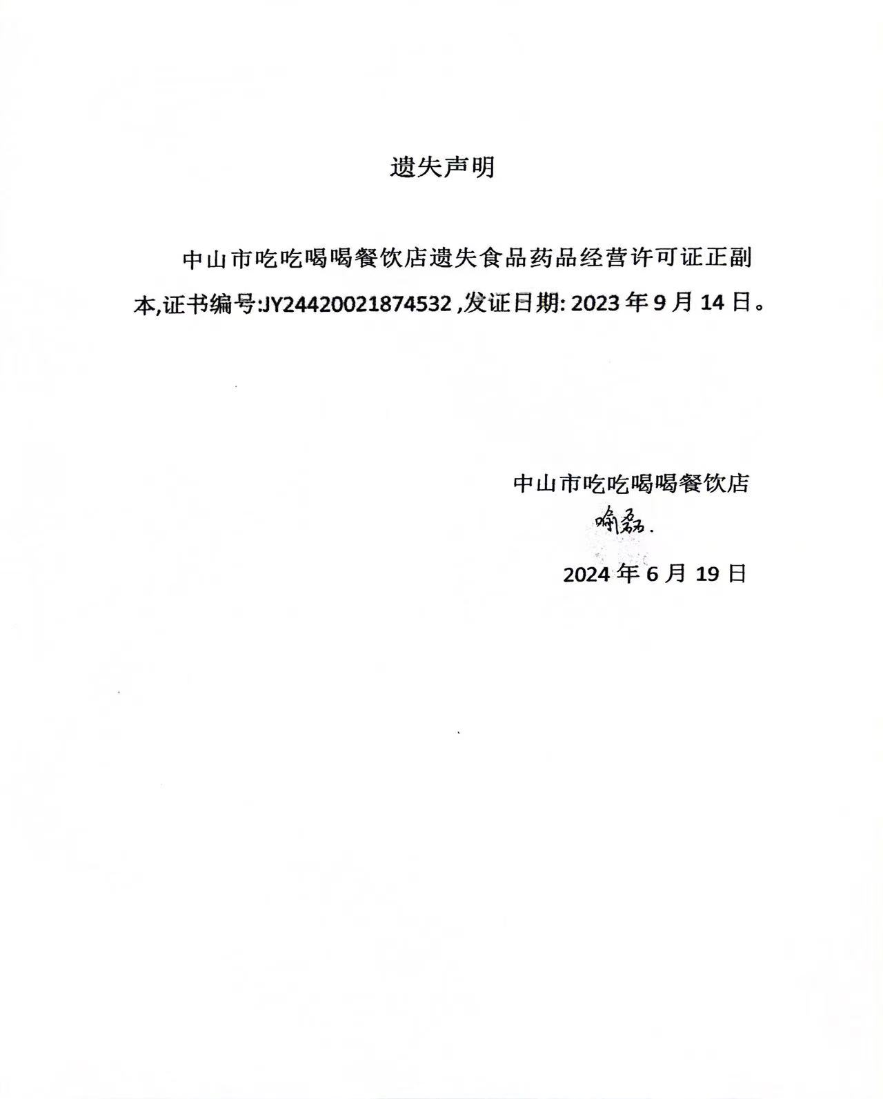 食品药品经营许可证遗失声明(中山市吃吃喝喝餐饮店)
