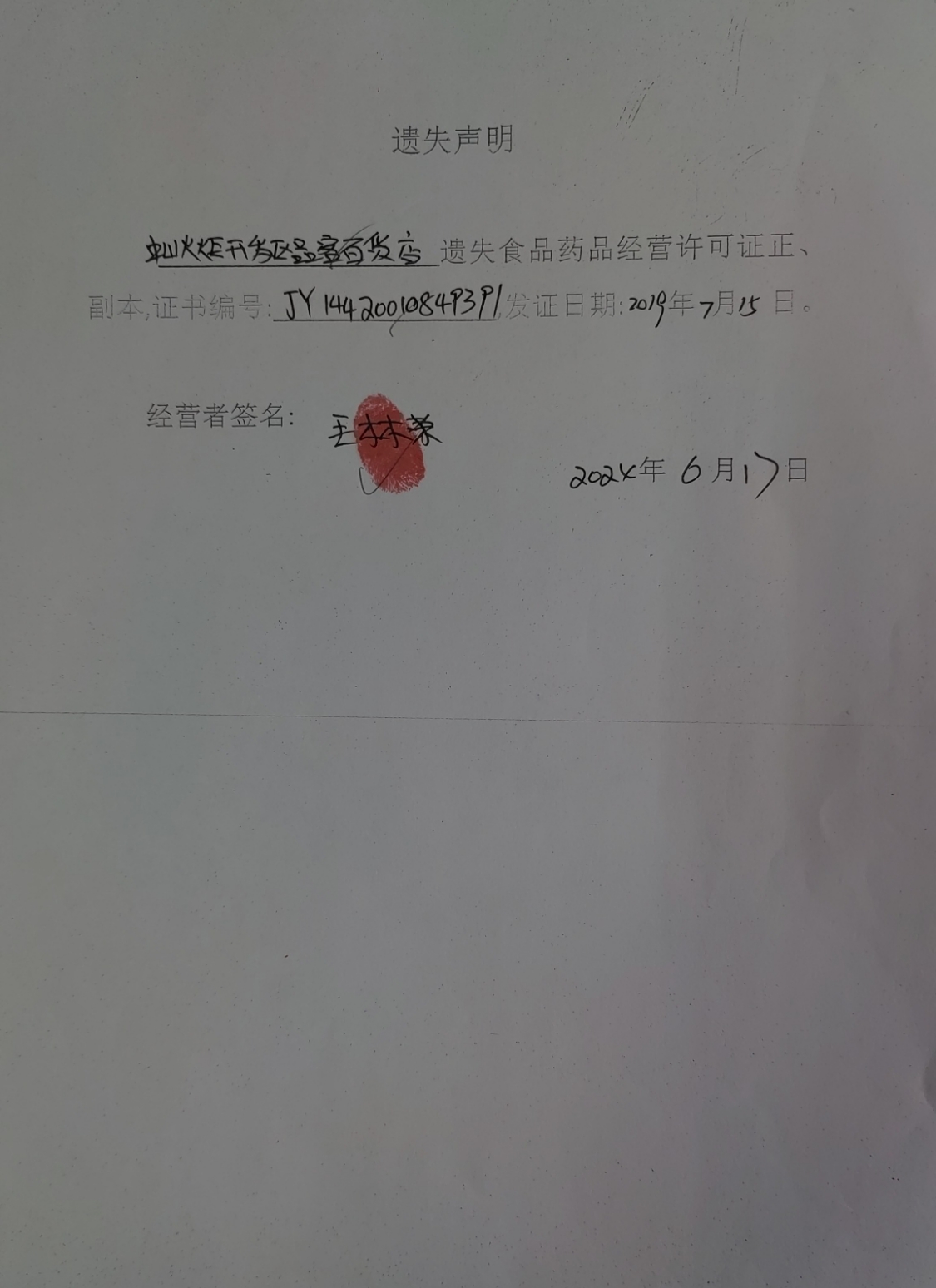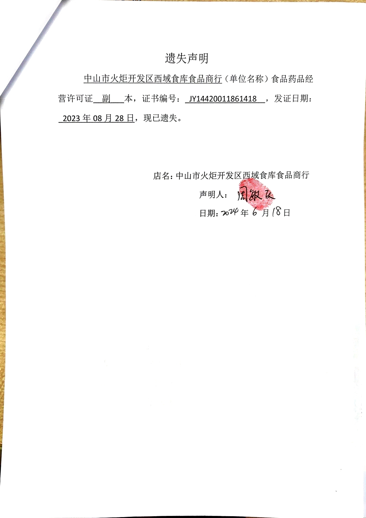 食品药品经营许可证遗失声明(中山火炬开发区品客百货店、中山市火炬开发区西域食库食品商行、中山市青鼎穆牛肉面店、中山市五毛餐饮有限公司)