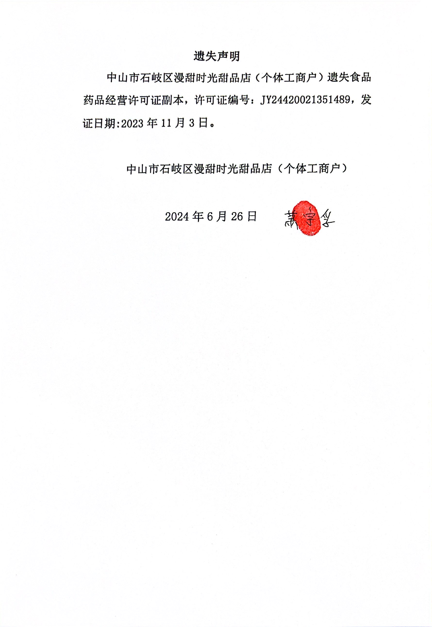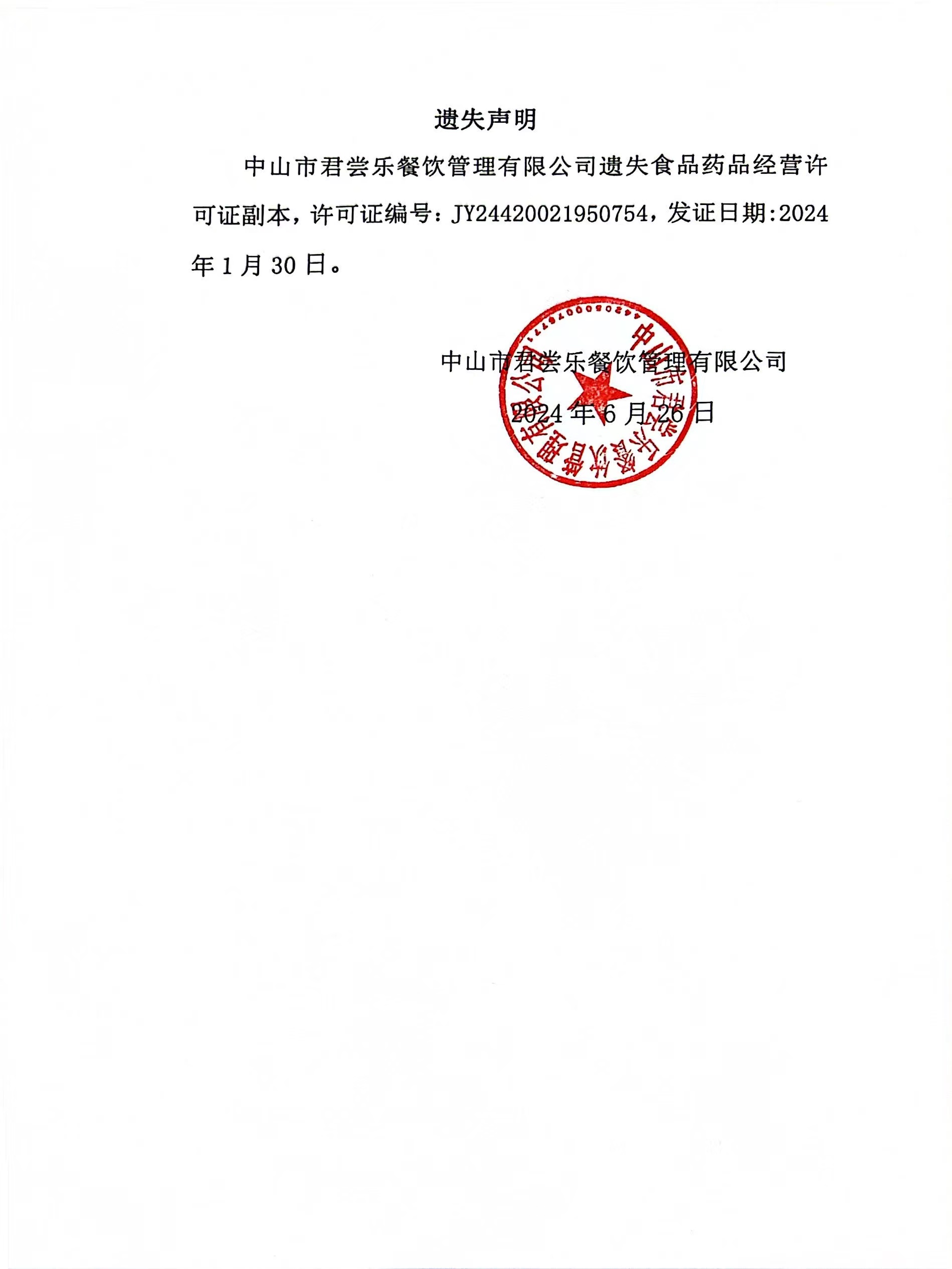 食品药品经营许可证遗失声明【中山市君尝乐餐饮管理有限公司、中山市石岐区漫甜时光甜品店(个体工商户)】