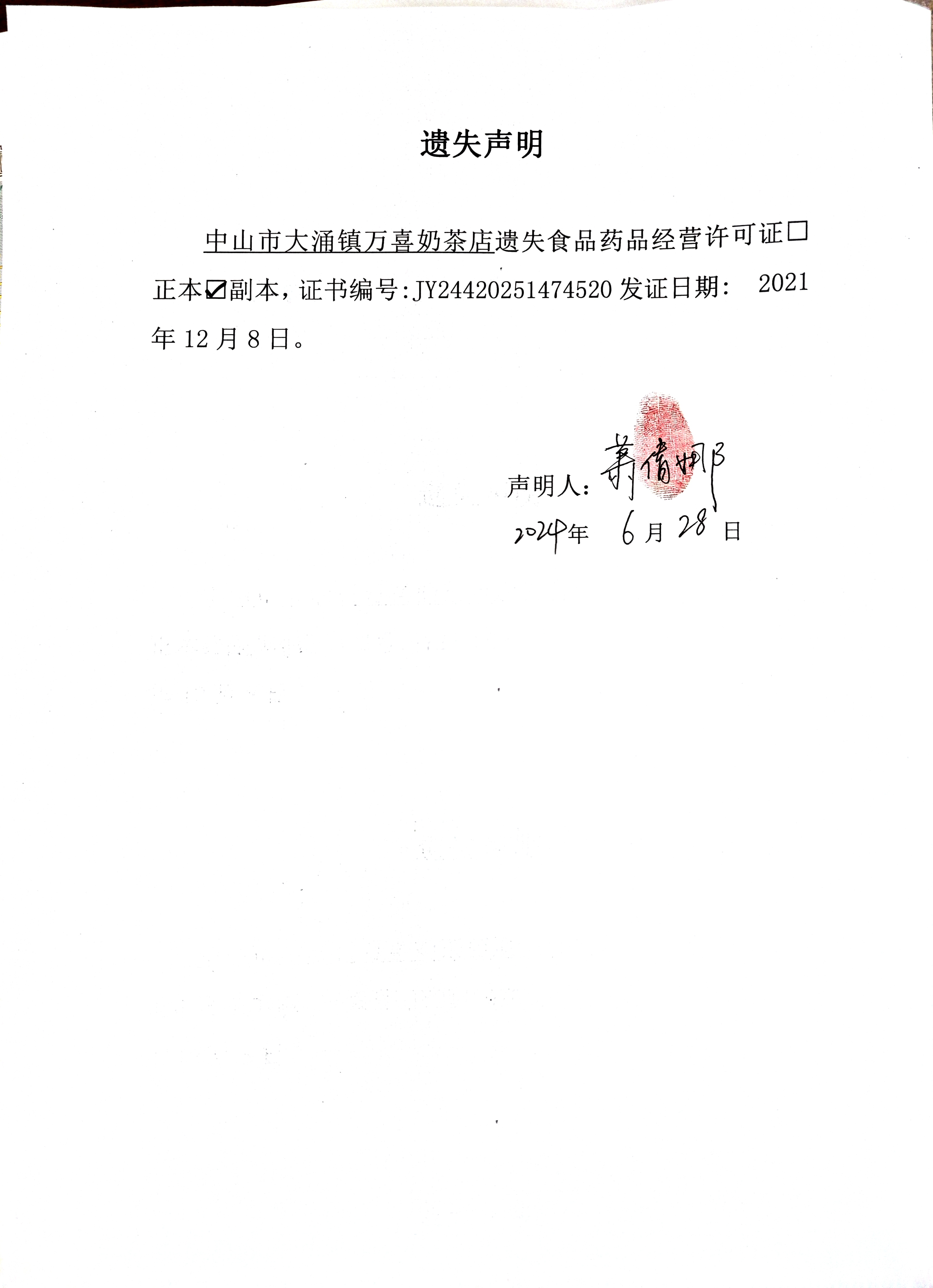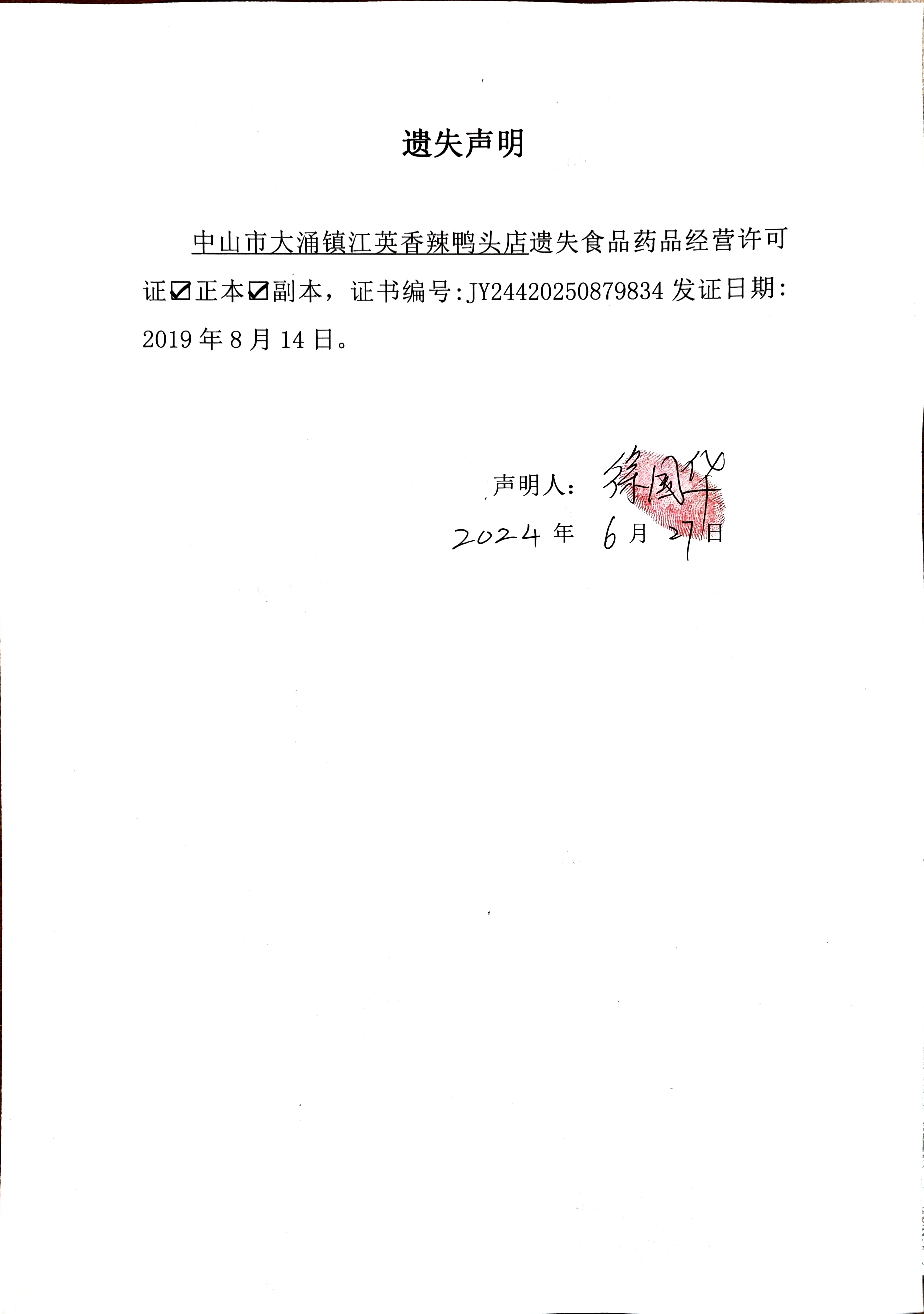 食品药品经营许可证遗失声明(中山市大涌镇江英香辣鸭头店、中山市大涌镇万喜奶茶店)