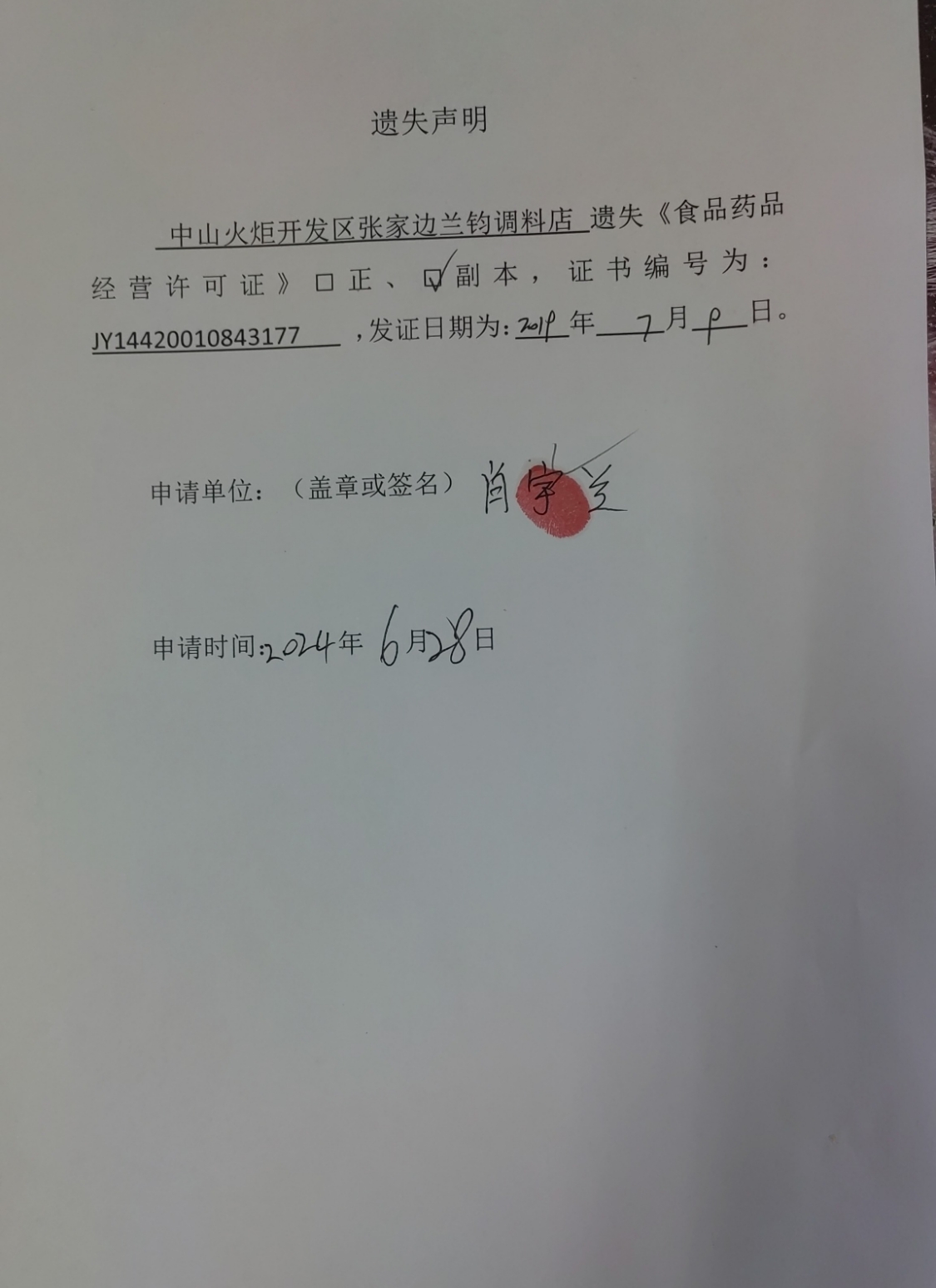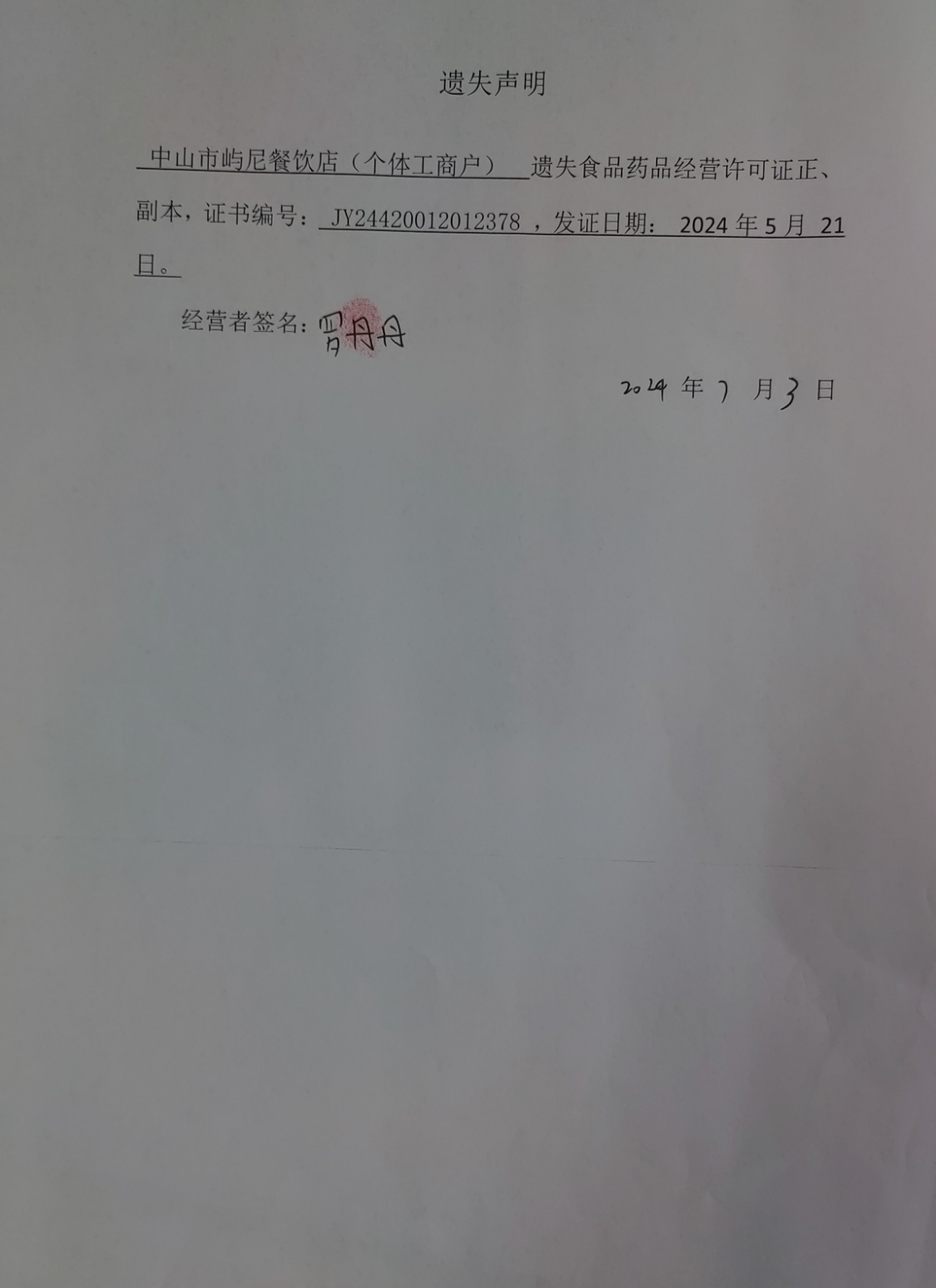 食品药品经营许可证遗失声明【中山市屿尼餐饮店(个体工商户)、中山火炬开发区张家边兰钧调料店】