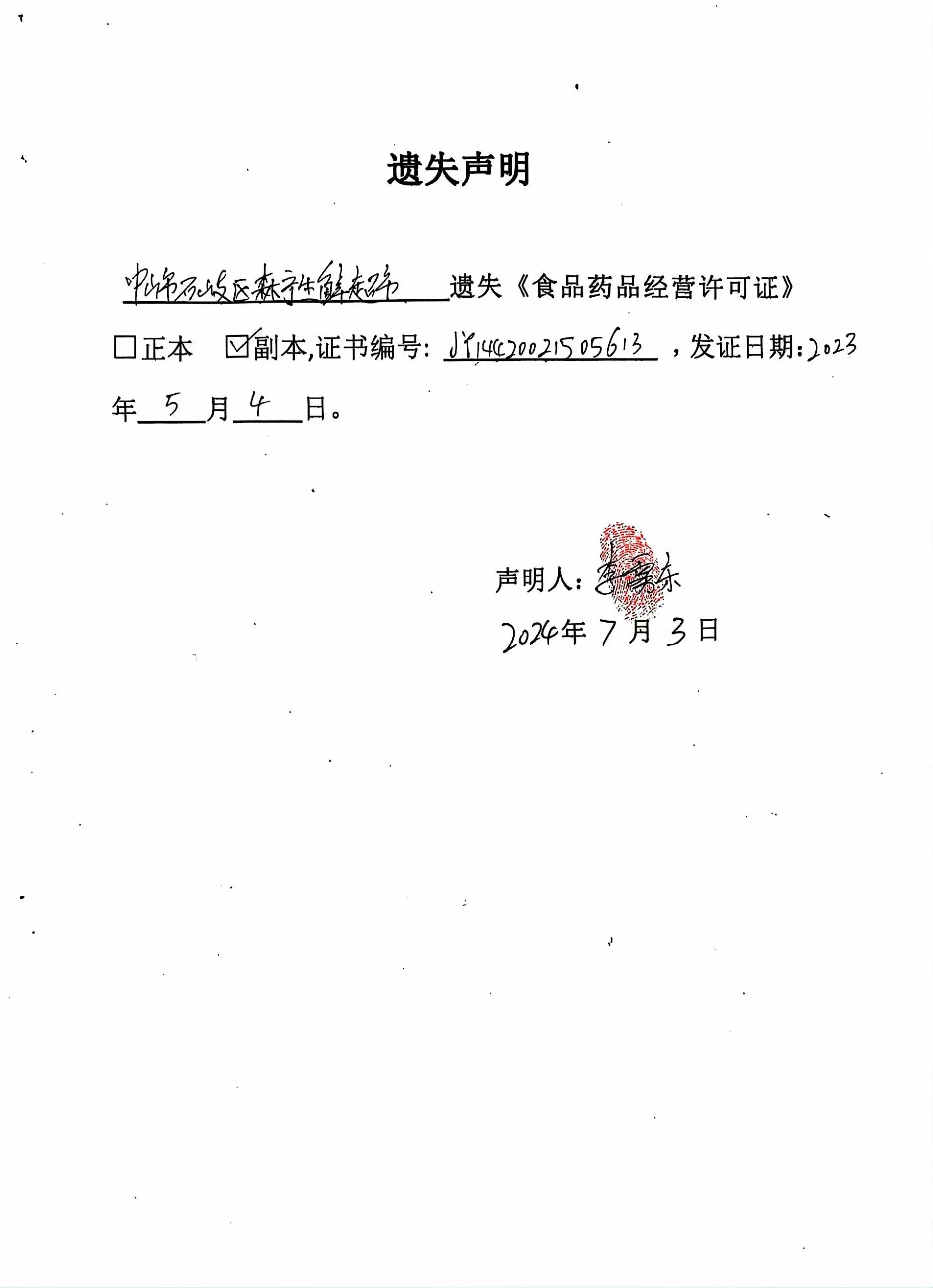 食品药品经营许可证遗失声明(中山市石岐区森宁生鲜超市)