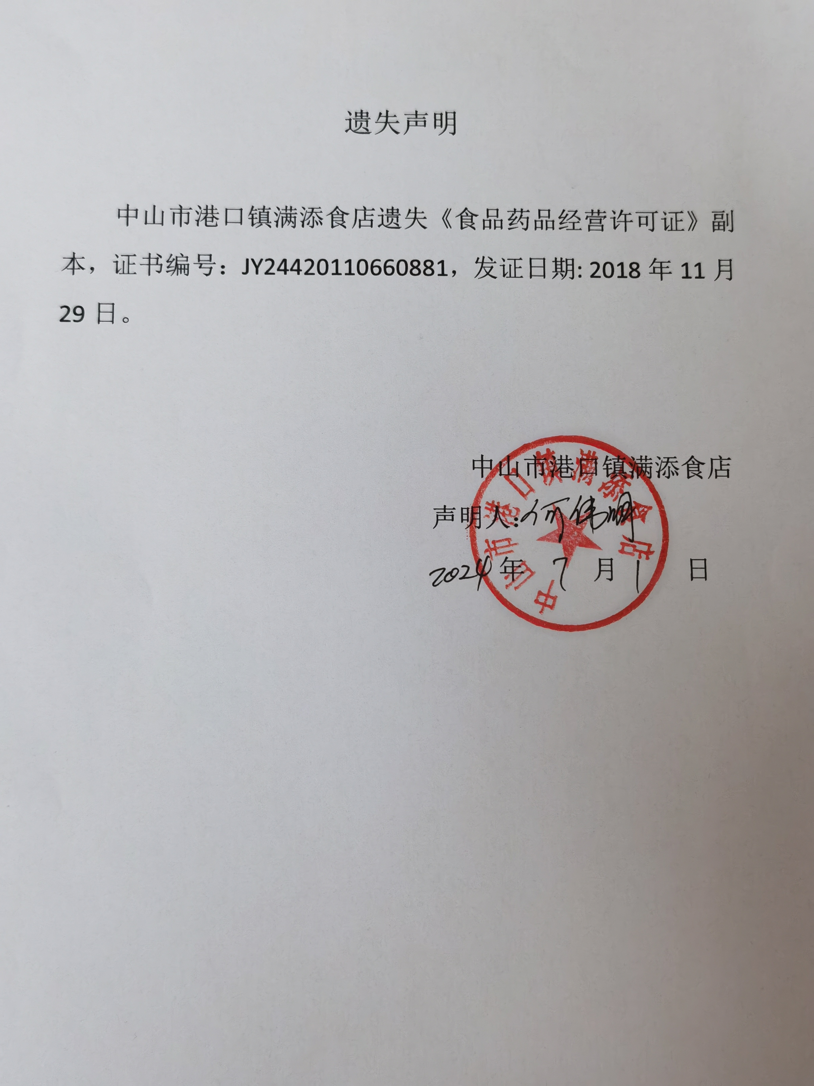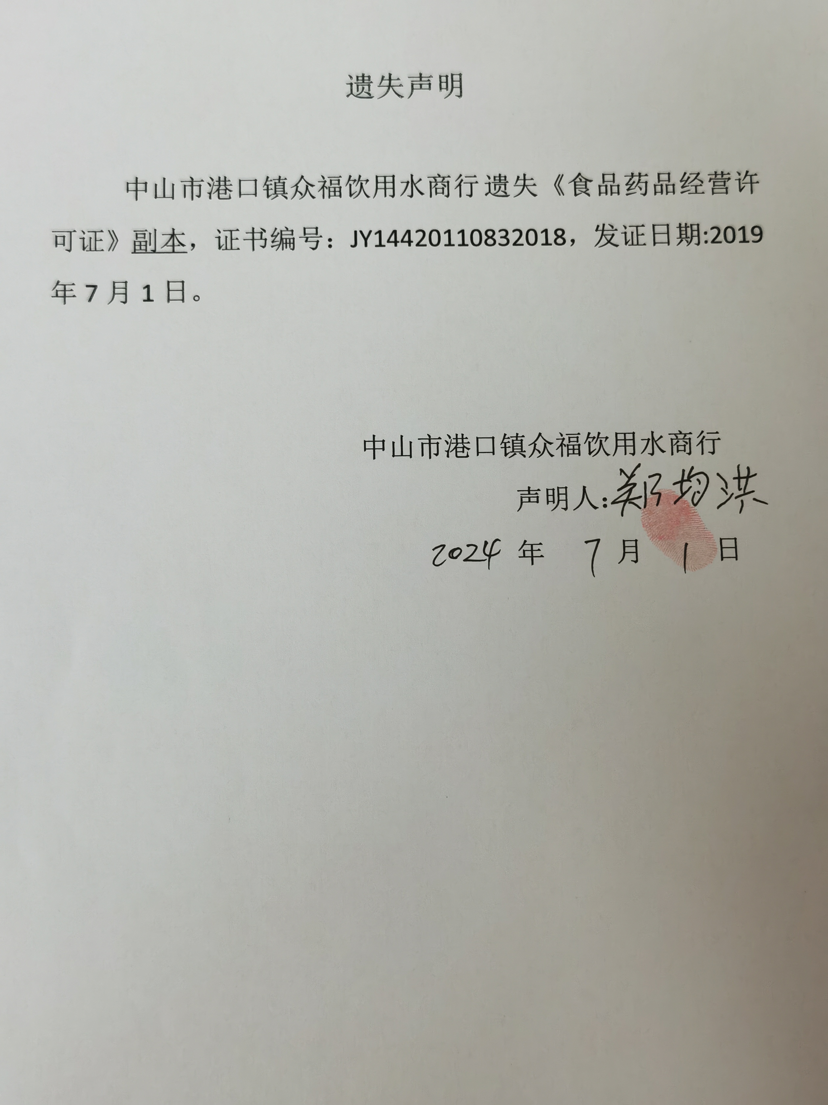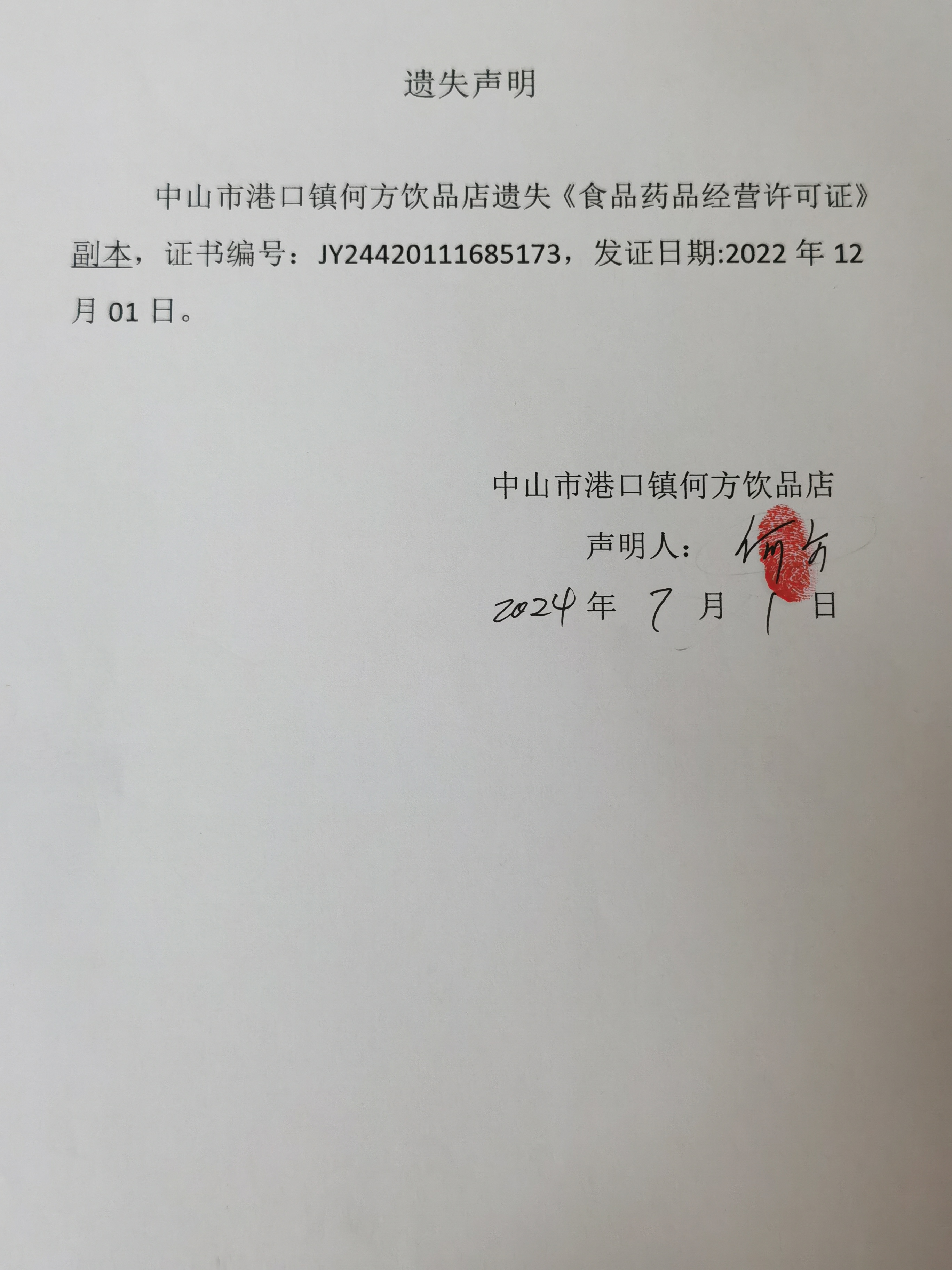 食品药品经营许可证遗失声明(中山市港口镇何方饮品店、中山市港口镇满添食店、中山市港口镇众福饮用水商行)