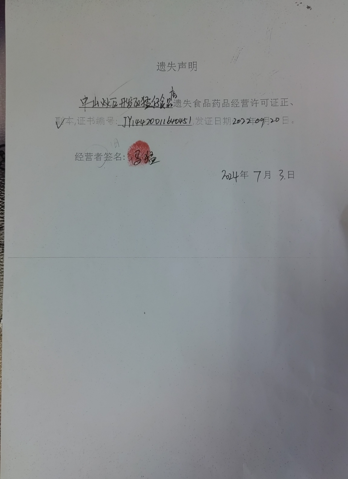 食品药品经营许可证遗失声明(中山火炬开发区猛仔食品店、中山火炬开发区杨龙包子店)