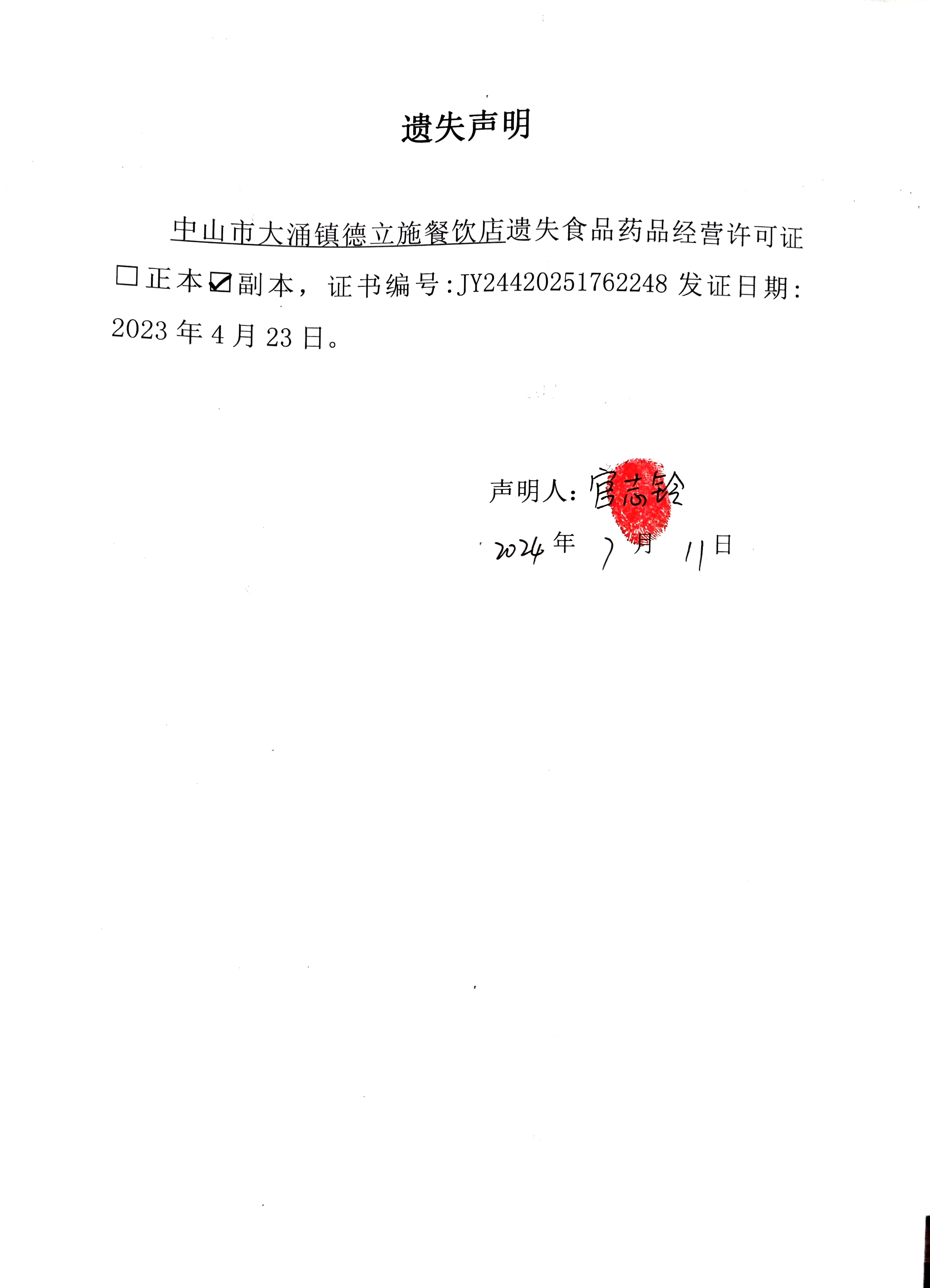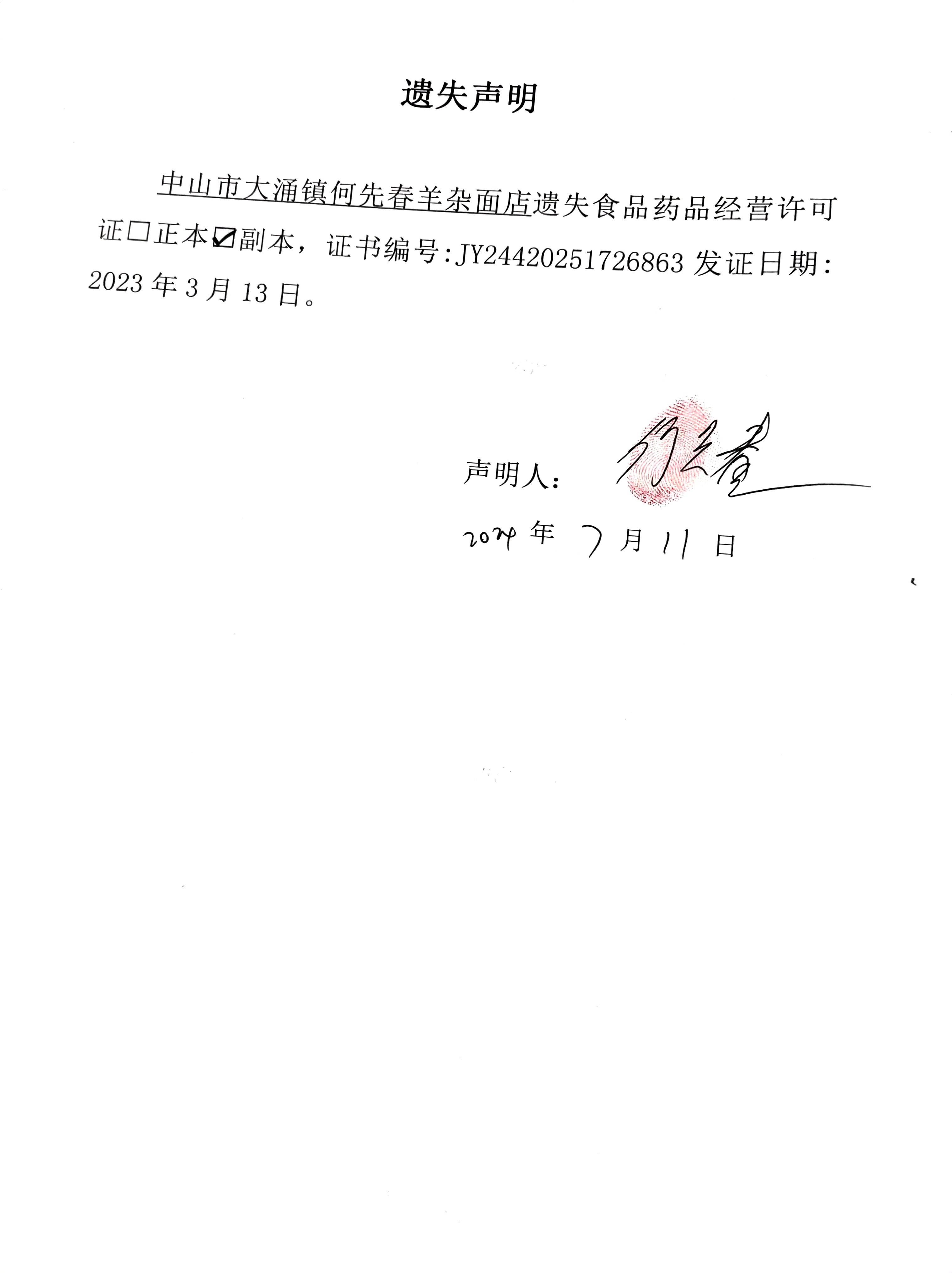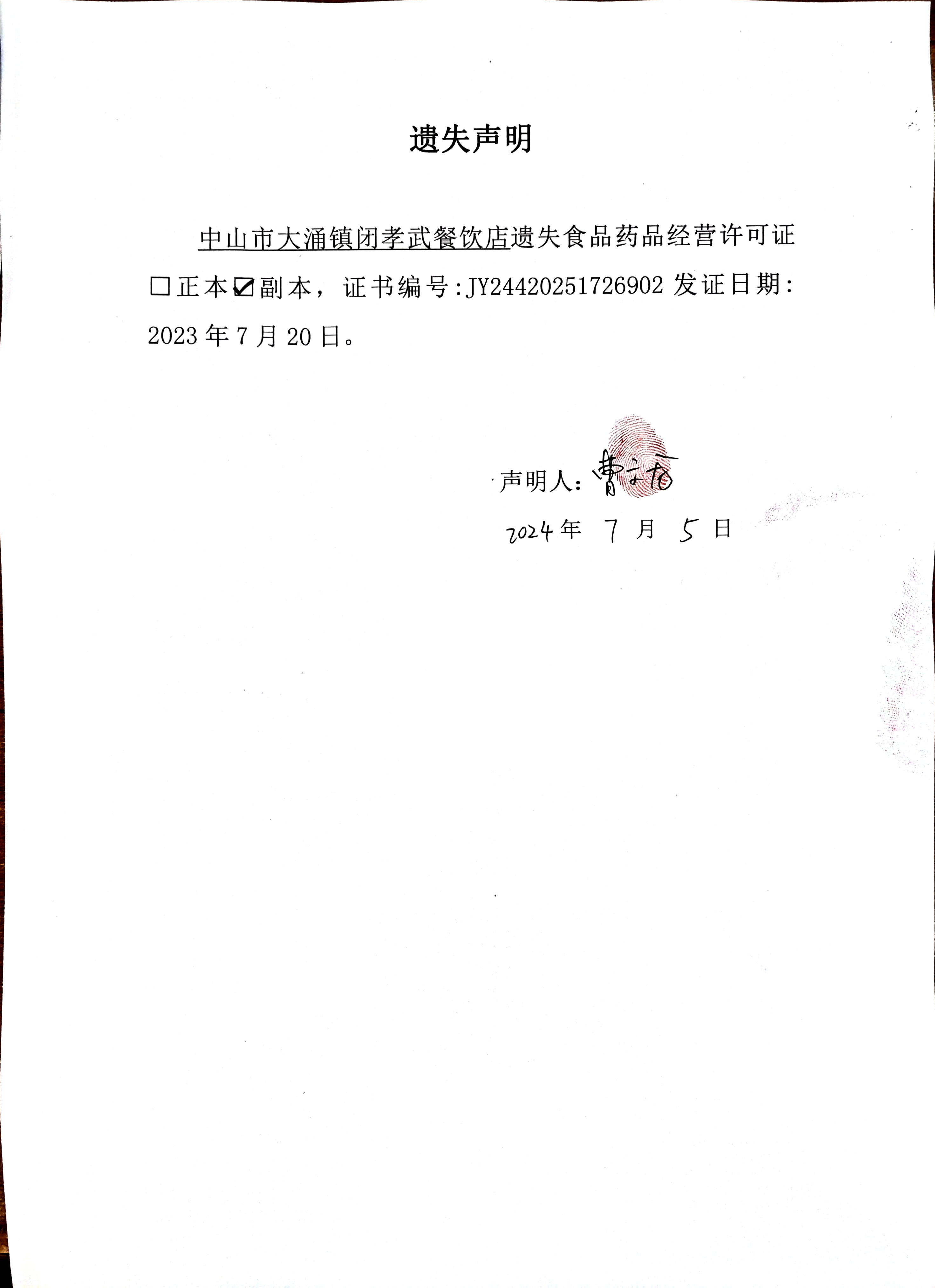 食品药品经营许可证遗失声明(中山市大涌镇闭孝武餐饮店、中山市大涌镇德立施餐饮店、中山市大涌镇何先春羊杂面店)