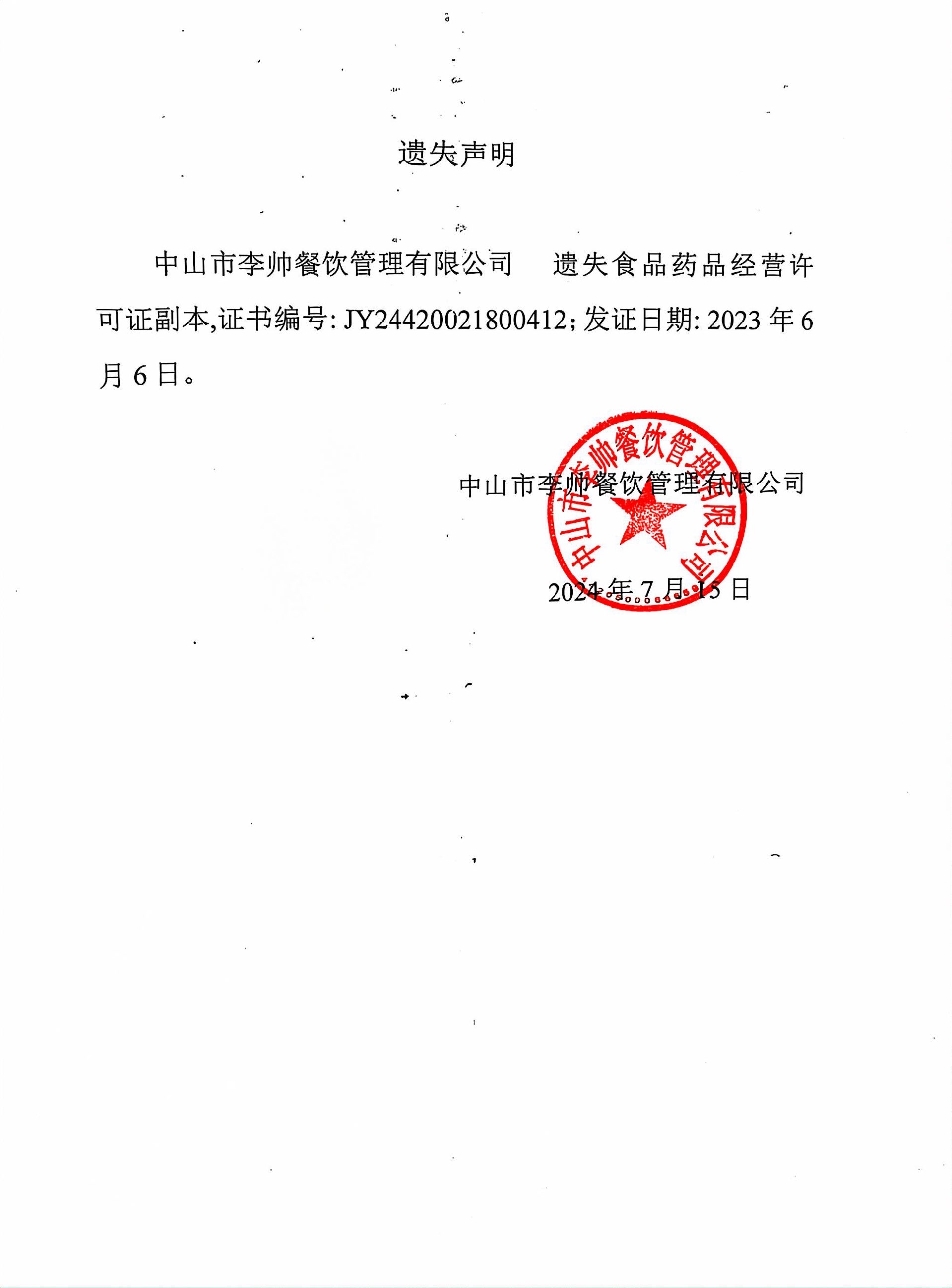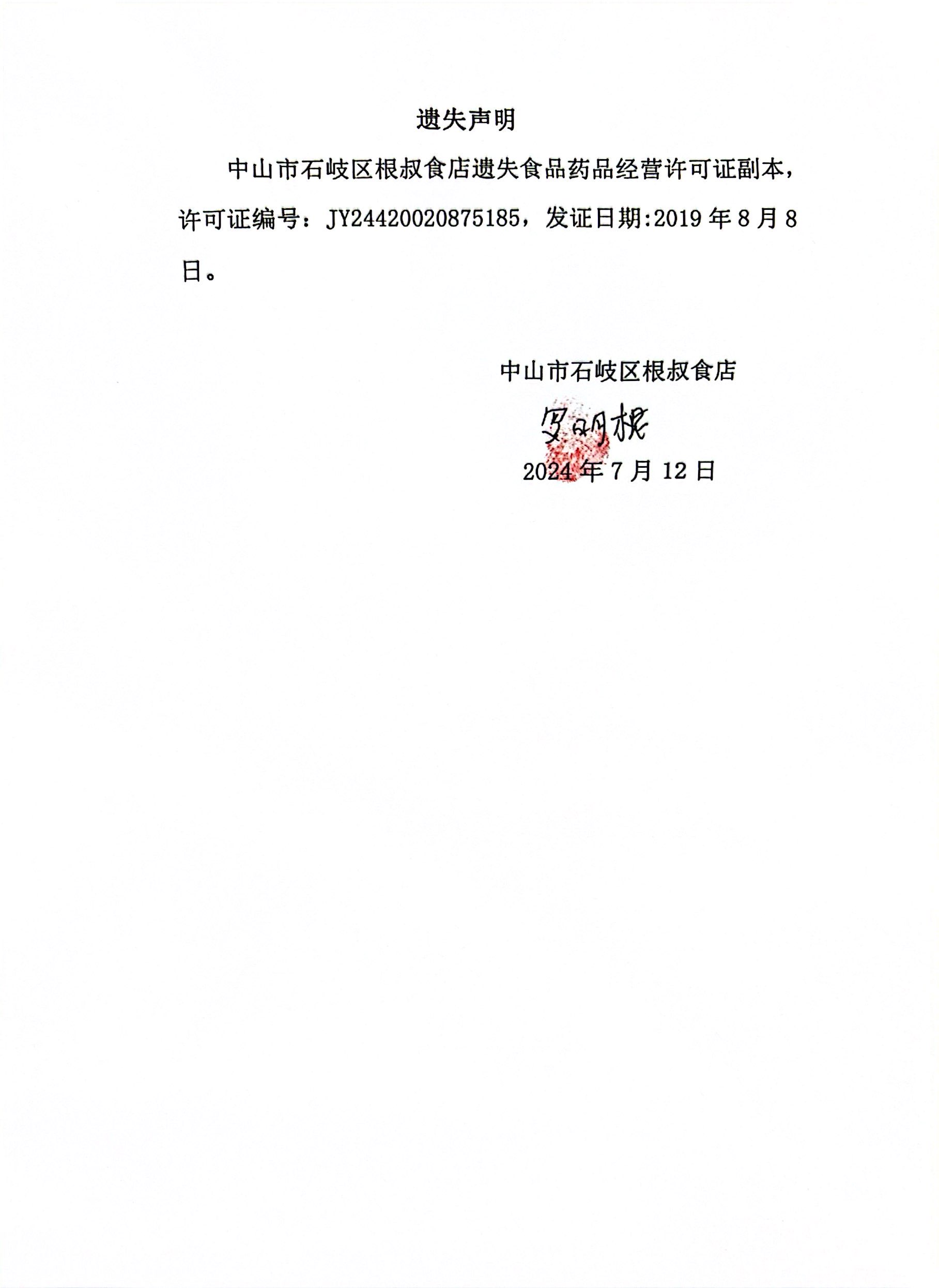 食品药品经营许可证遗失声明【中山市潮一乡餐饮店(个体工商户)、中山市石岐区根叔食店、中山市李帅餐饮管理有限公司】