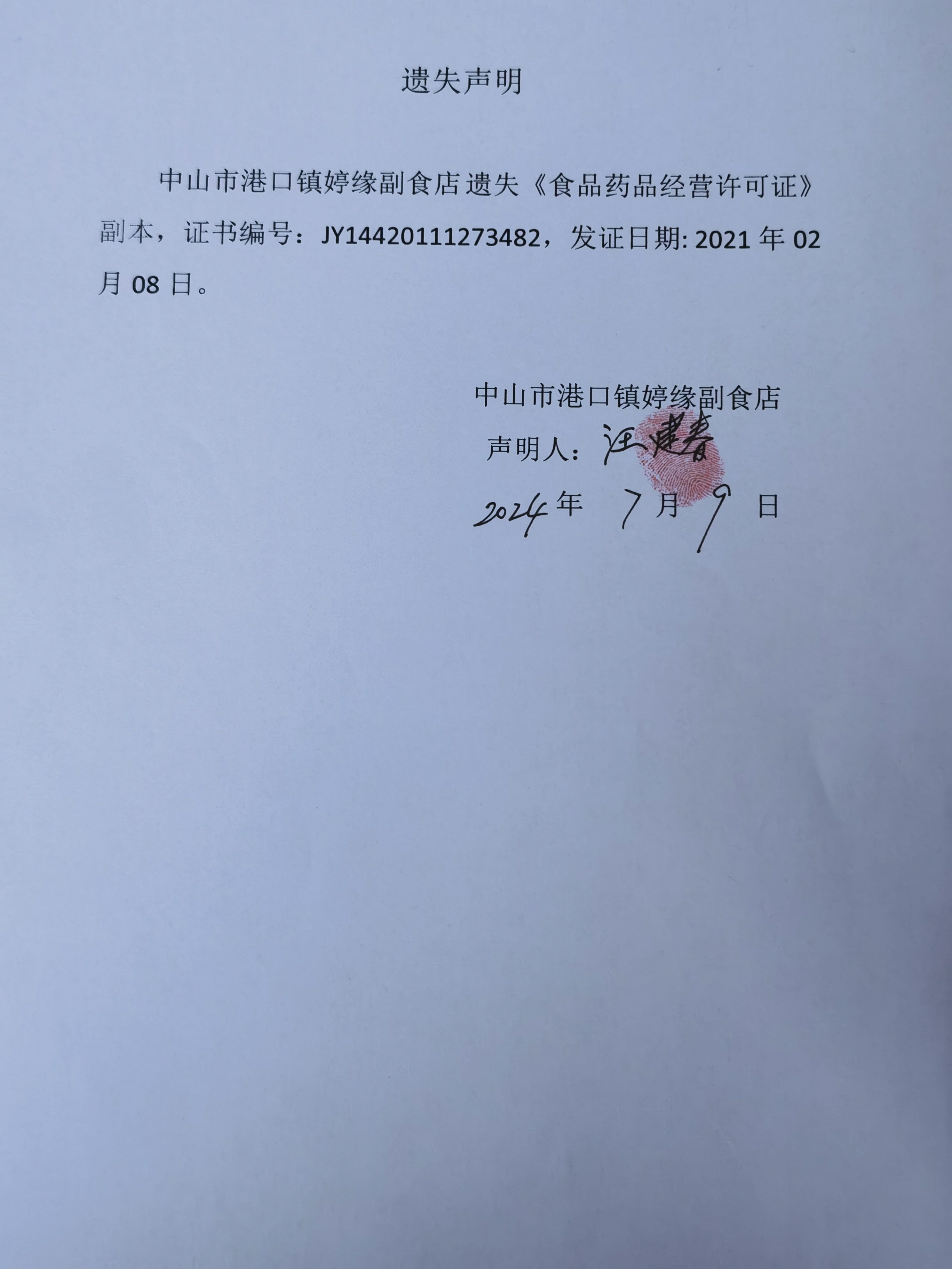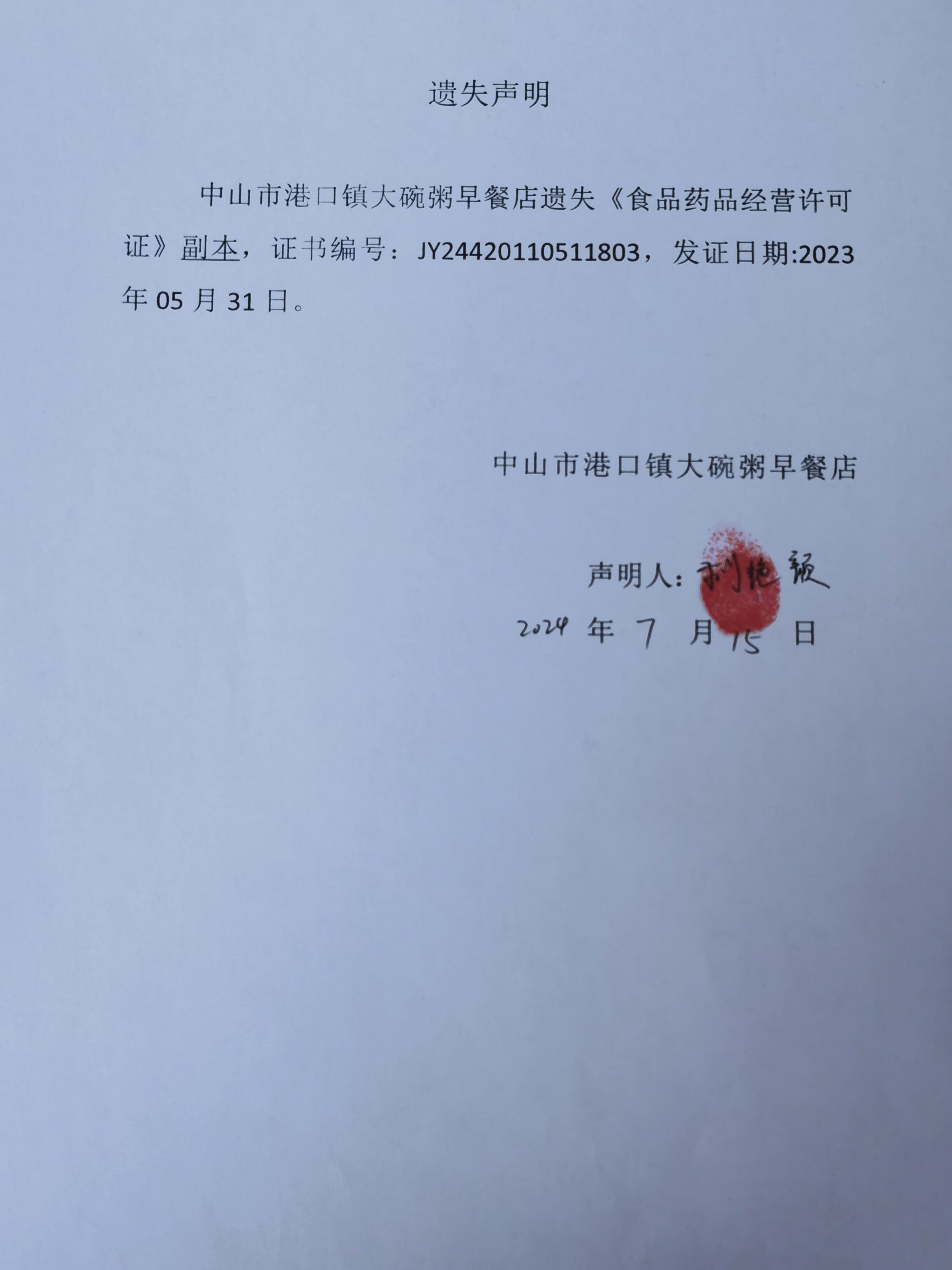 食品药品经营许可证遗失声明(中山市港口镇大碗粥早餐店、中山市港口镇婷缘副食店)