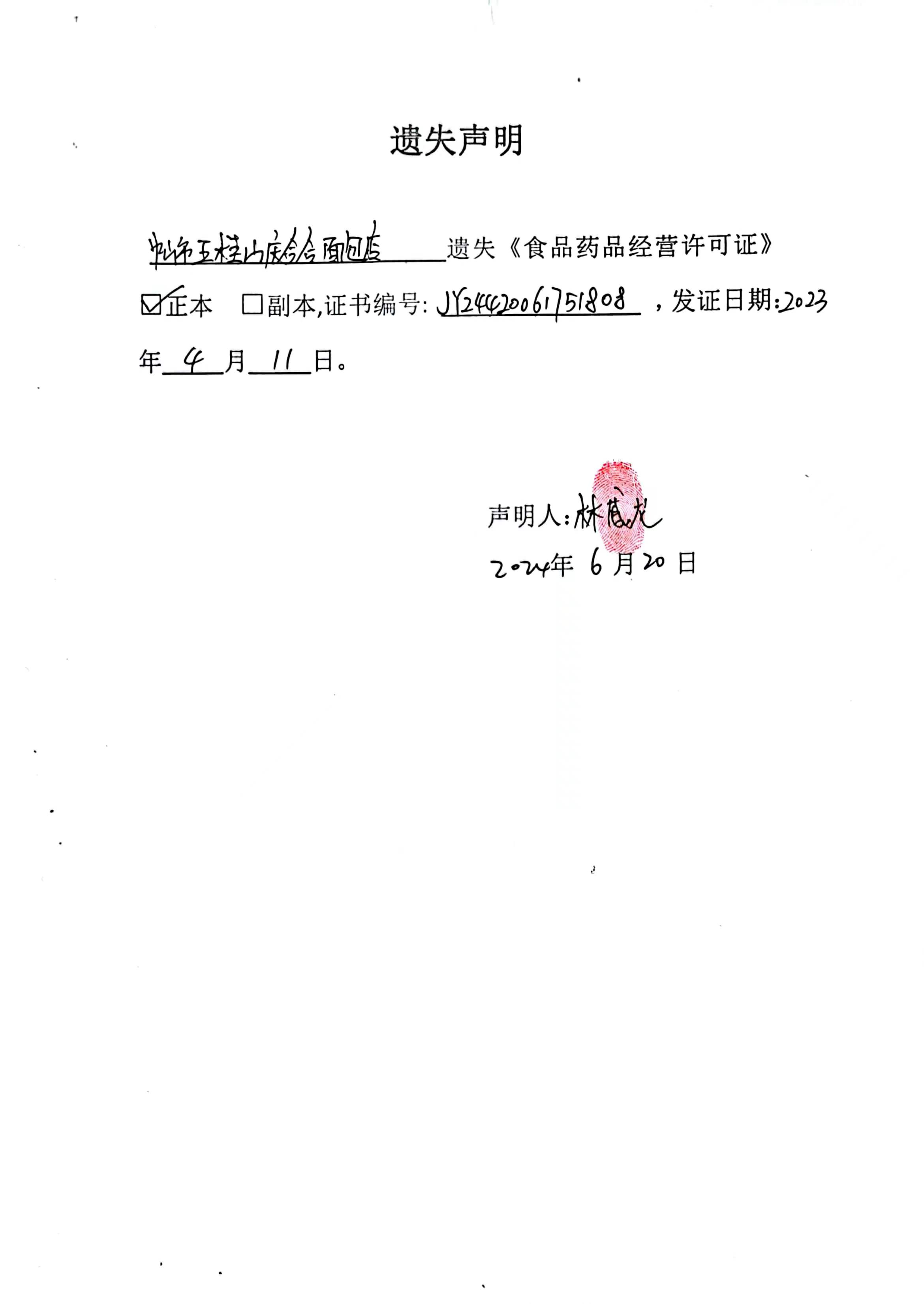 食品药品经营许可证遗失声明(中山市五桂山庆合合面包店)