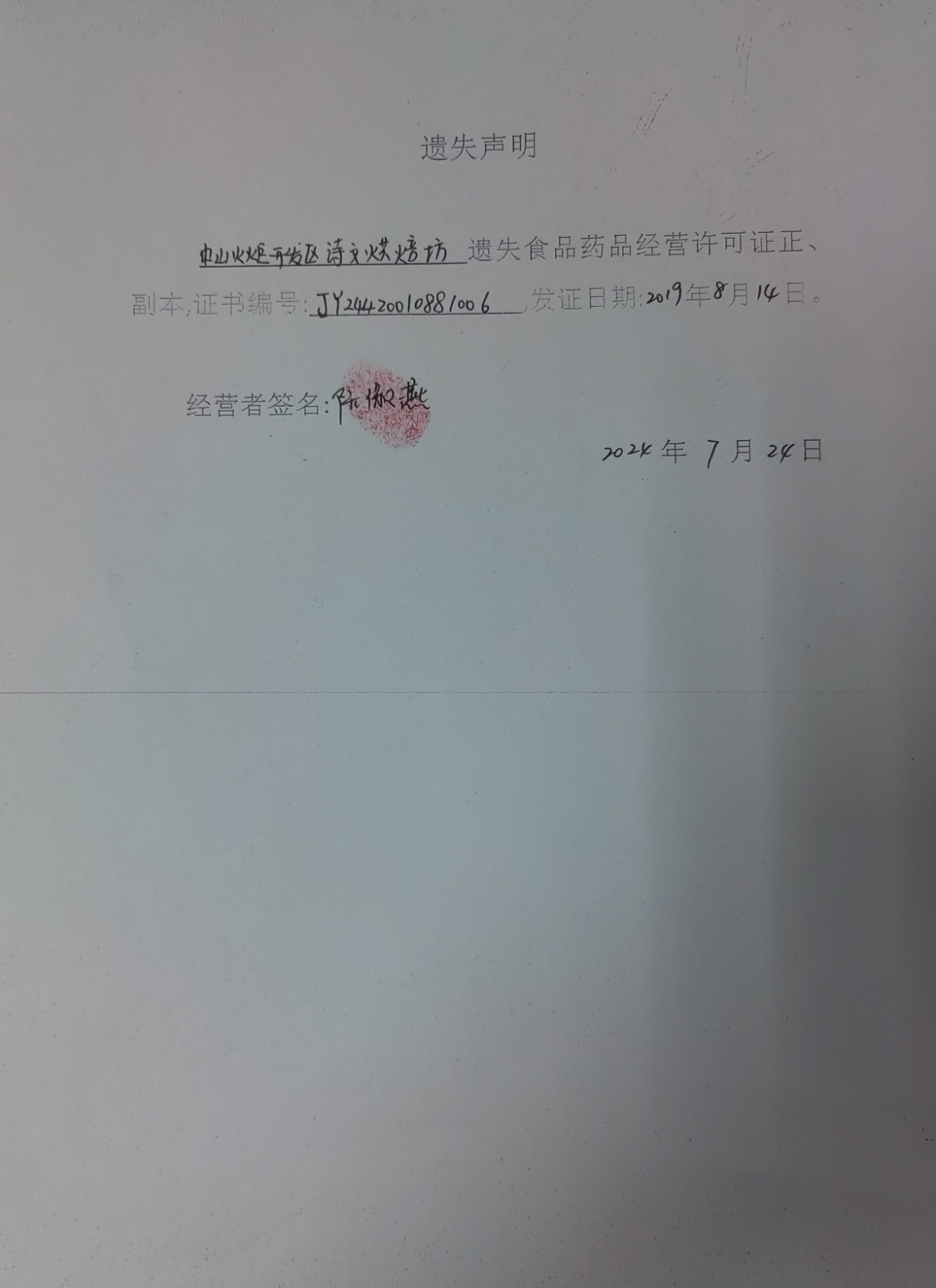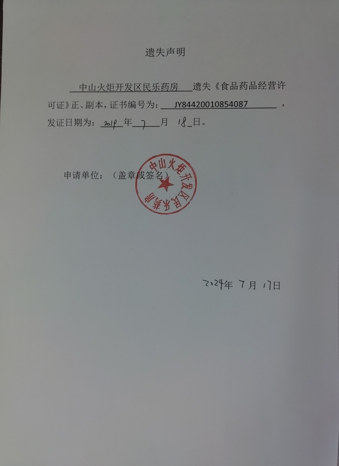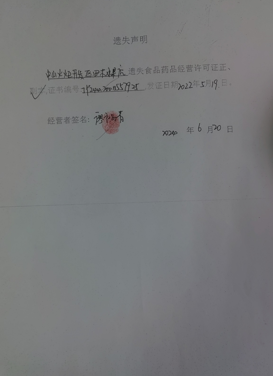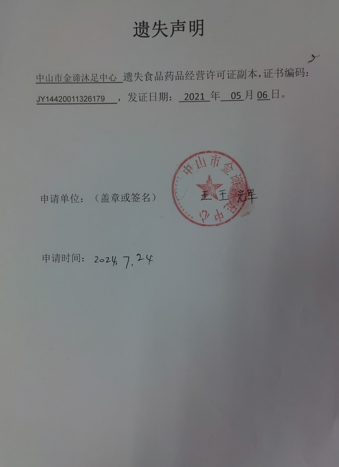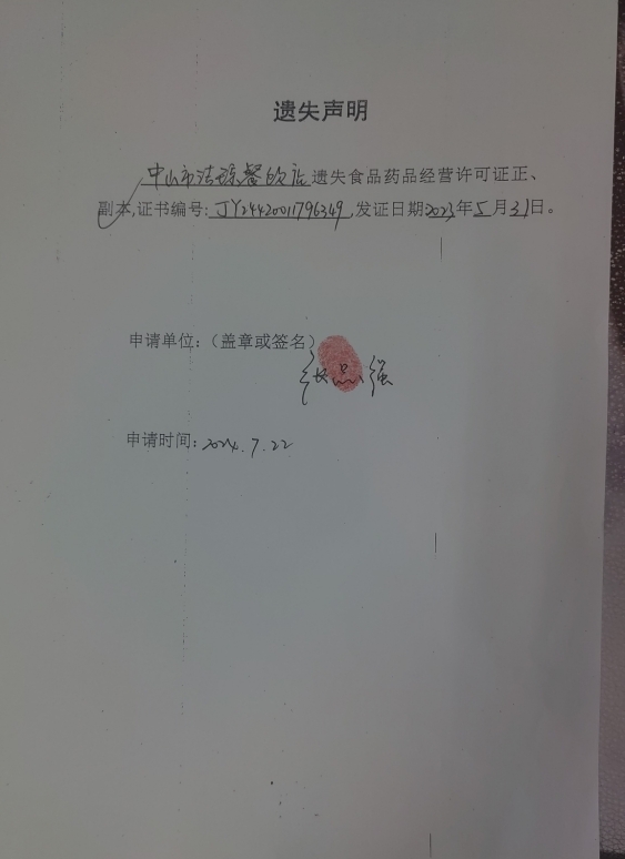 食品药品经营许可证遗失声明(中山市金谛沐足中心、中山市洁琼餐饮店、中山火炬开发区田木水果店、中山火炬开发区诗文烘焙坊、中山火炬开发区民乐药房)