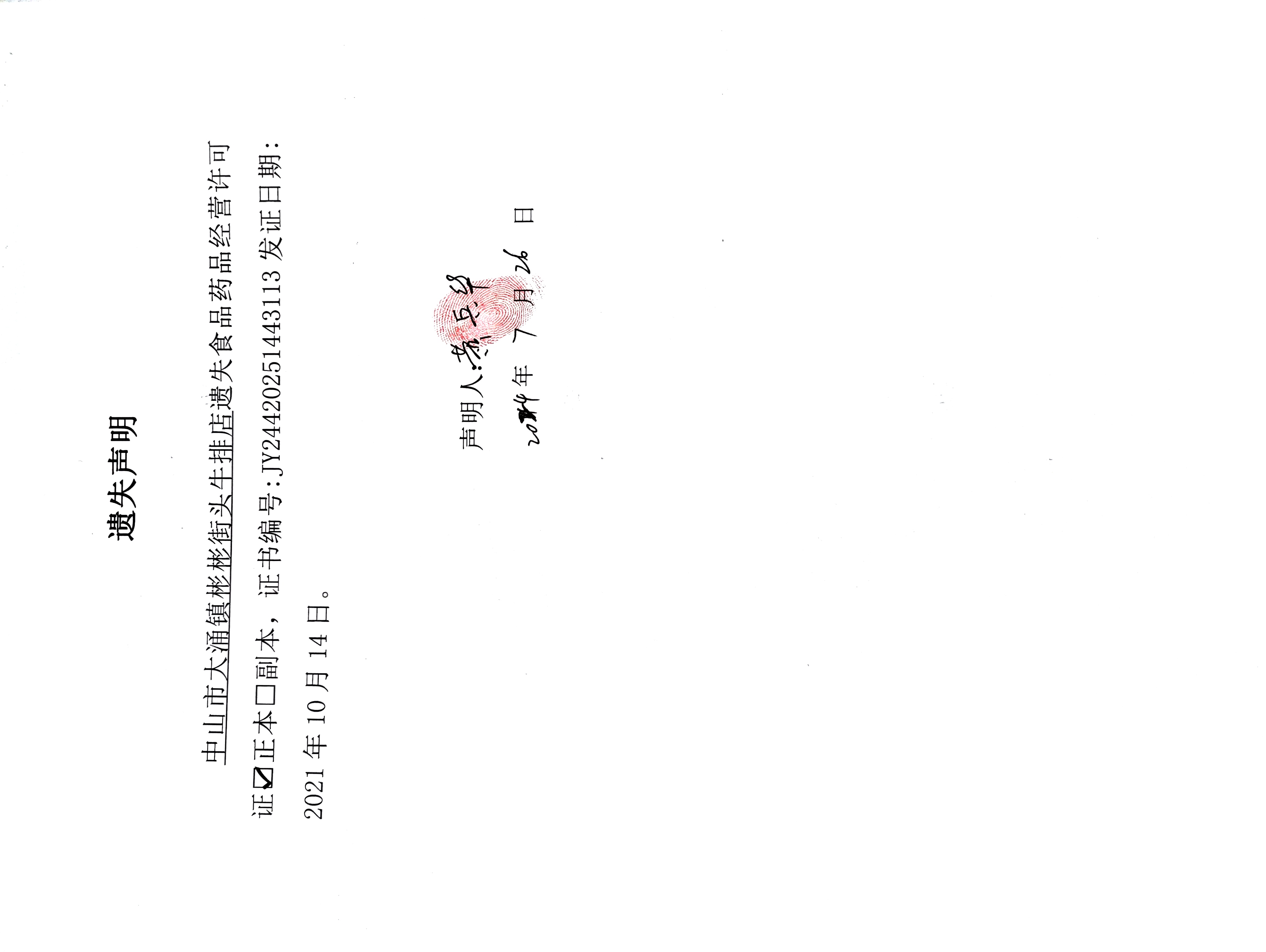 食品药品经营许可证遗失声明(中山市大涌镇彬彬街头牛排店)