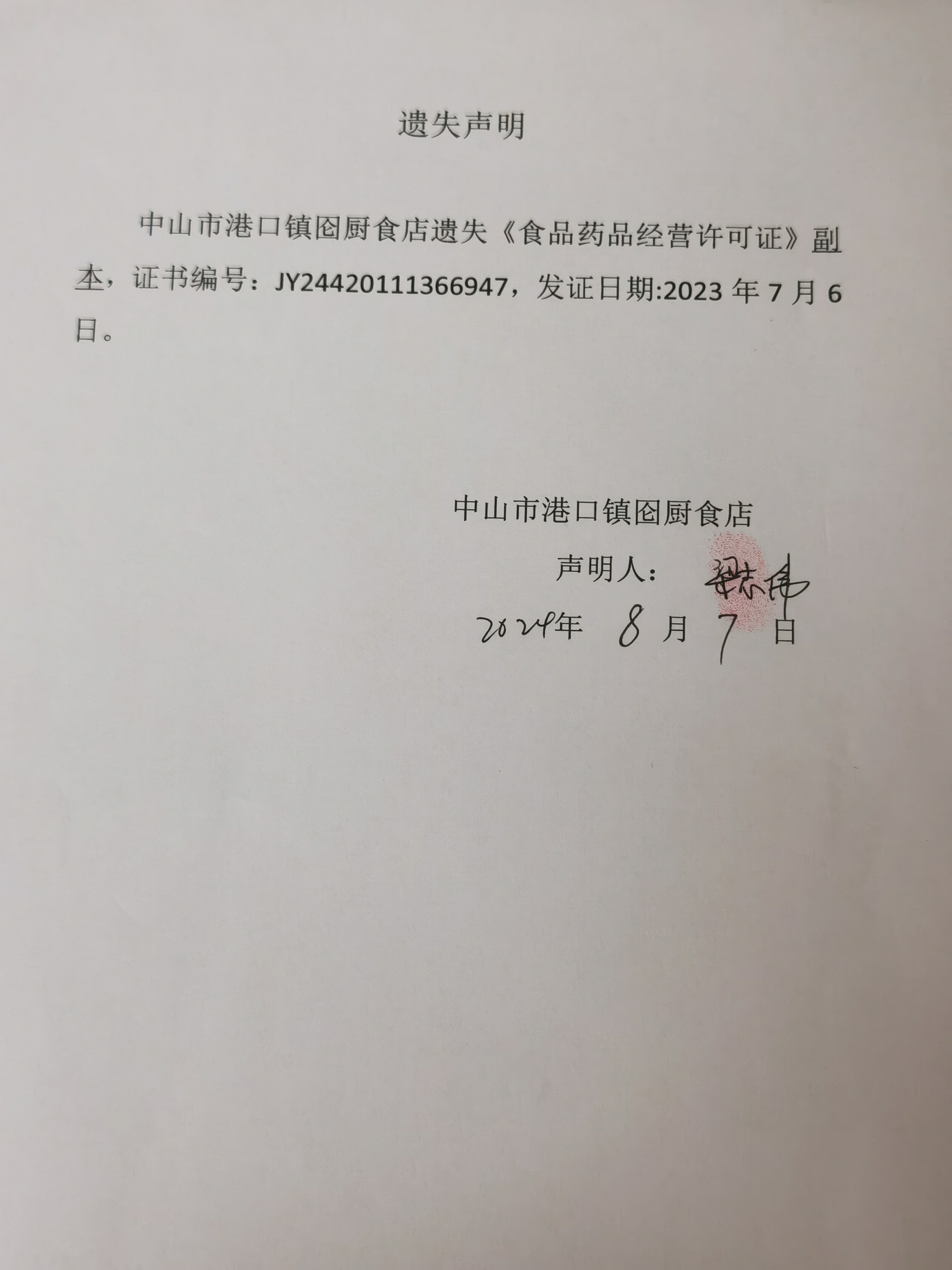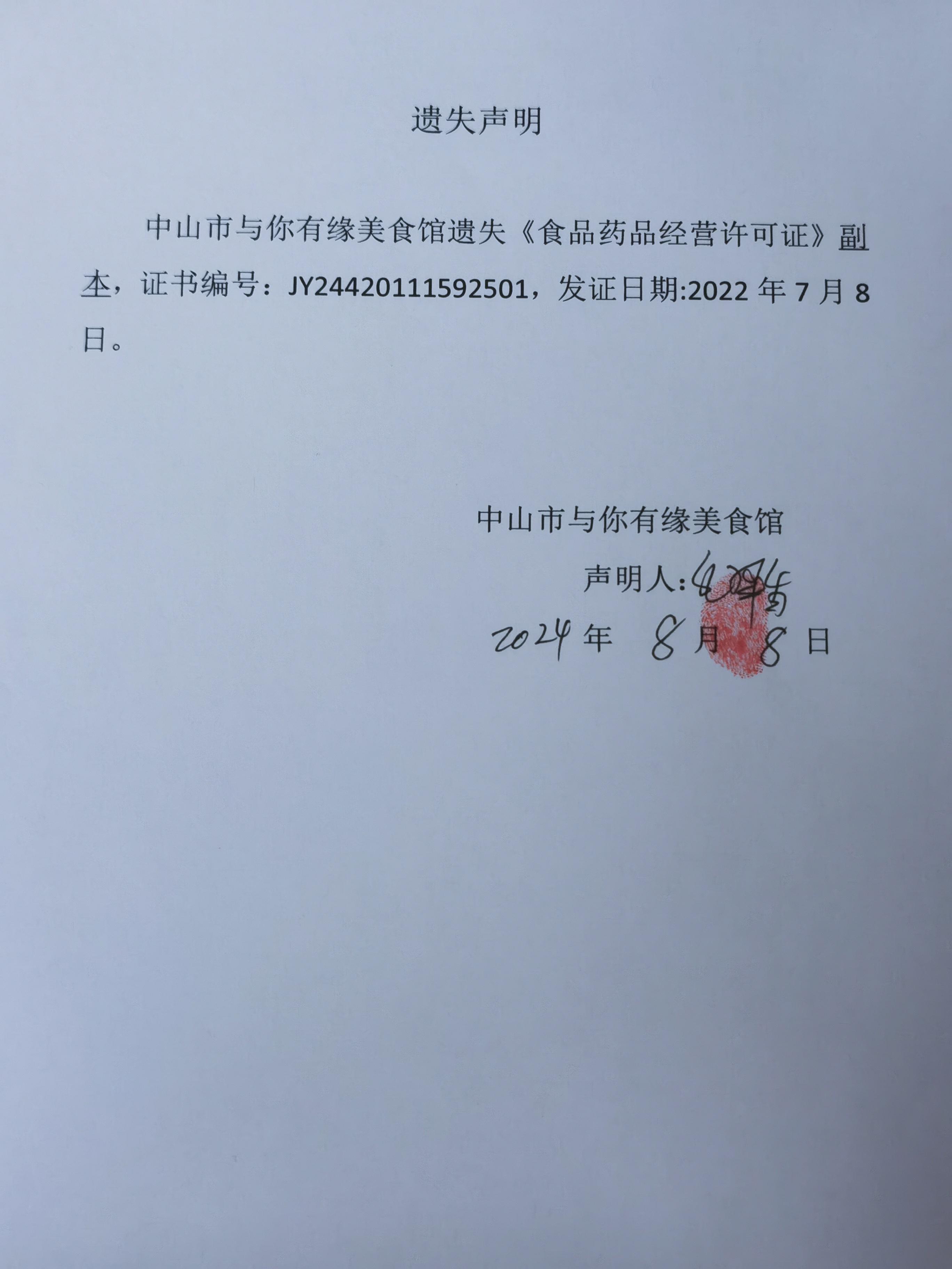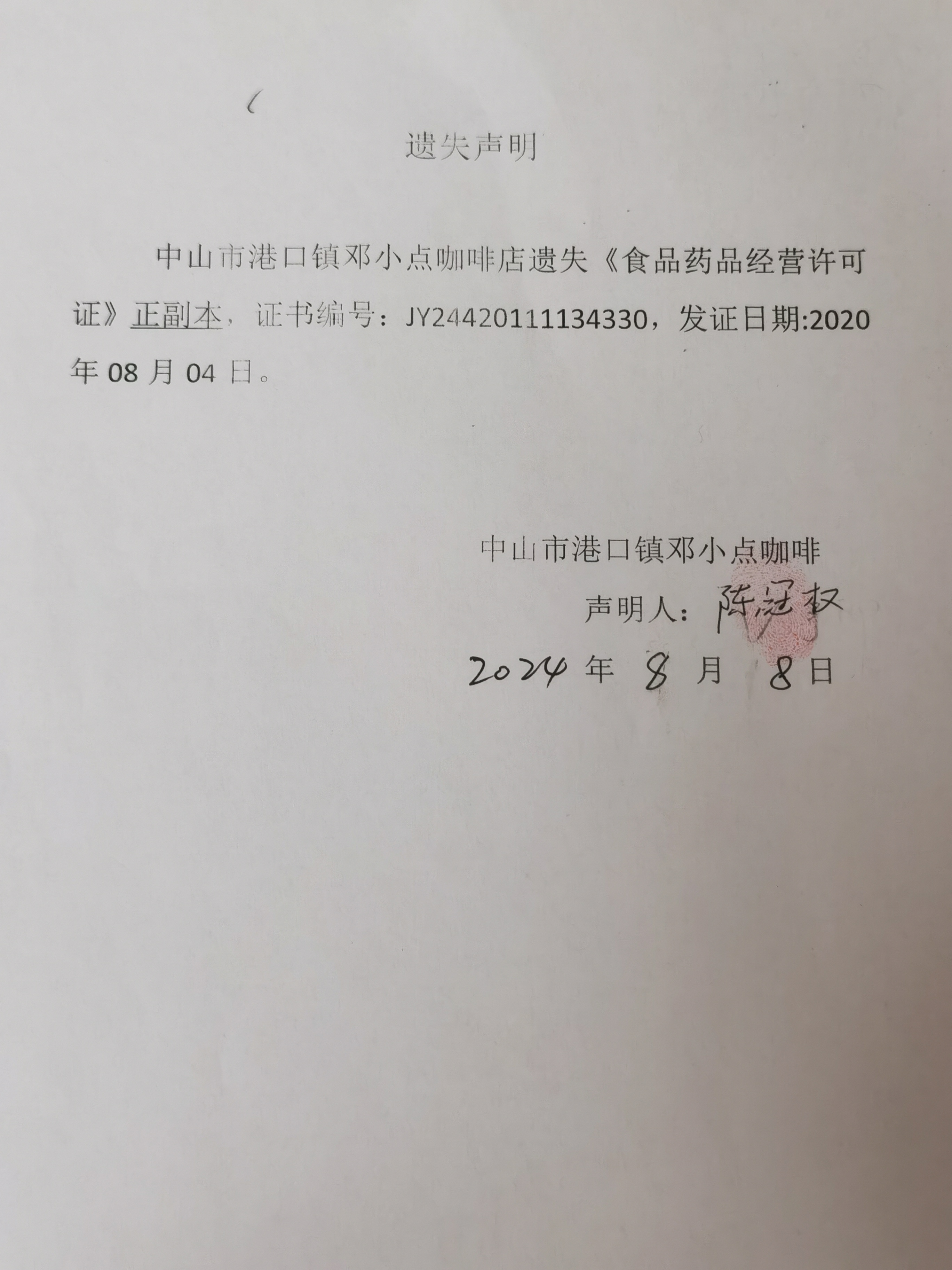 食品药品经营许可证遗失声明(中山市港口镇邓小点咖啡店、中山市与你有缘美食馆、中山市港口镇囵厨食店)