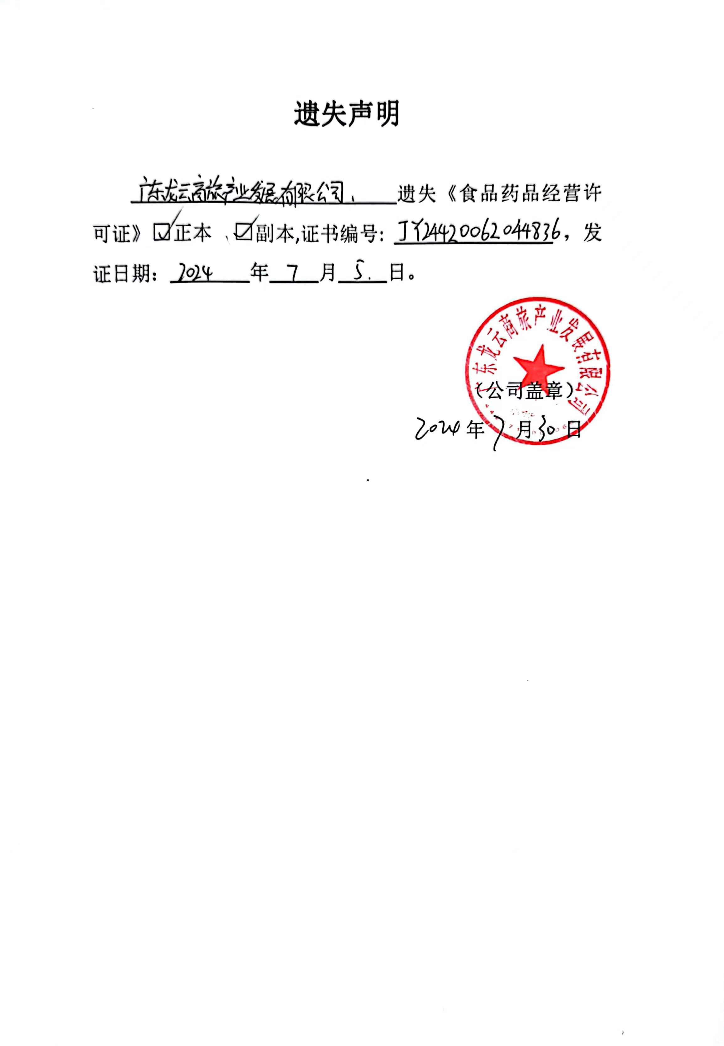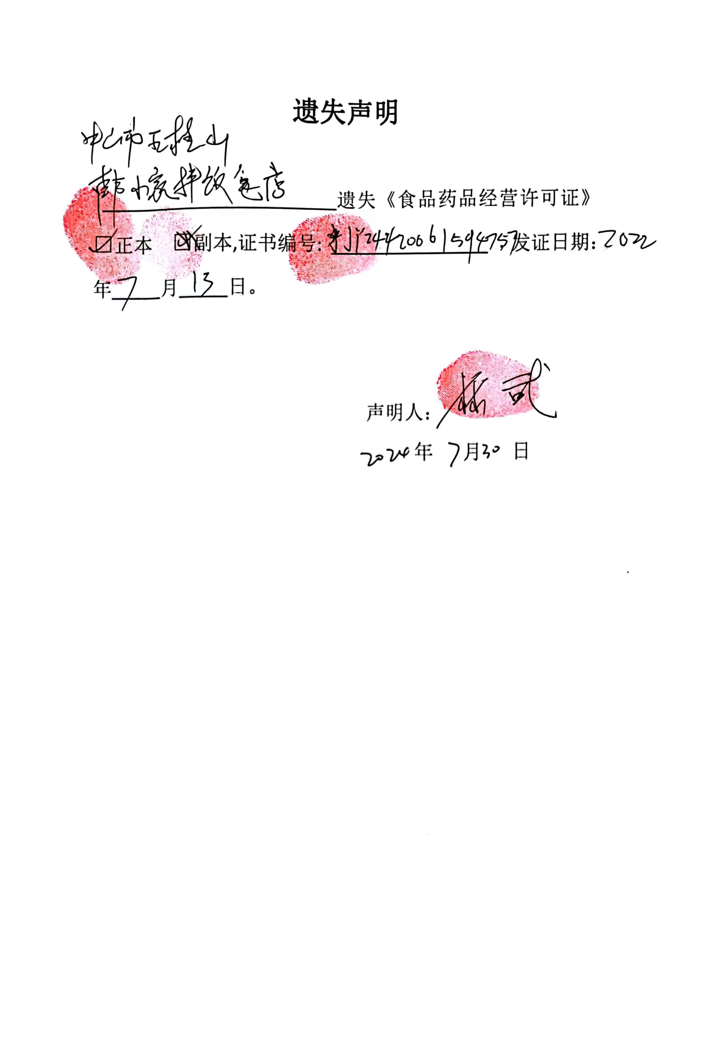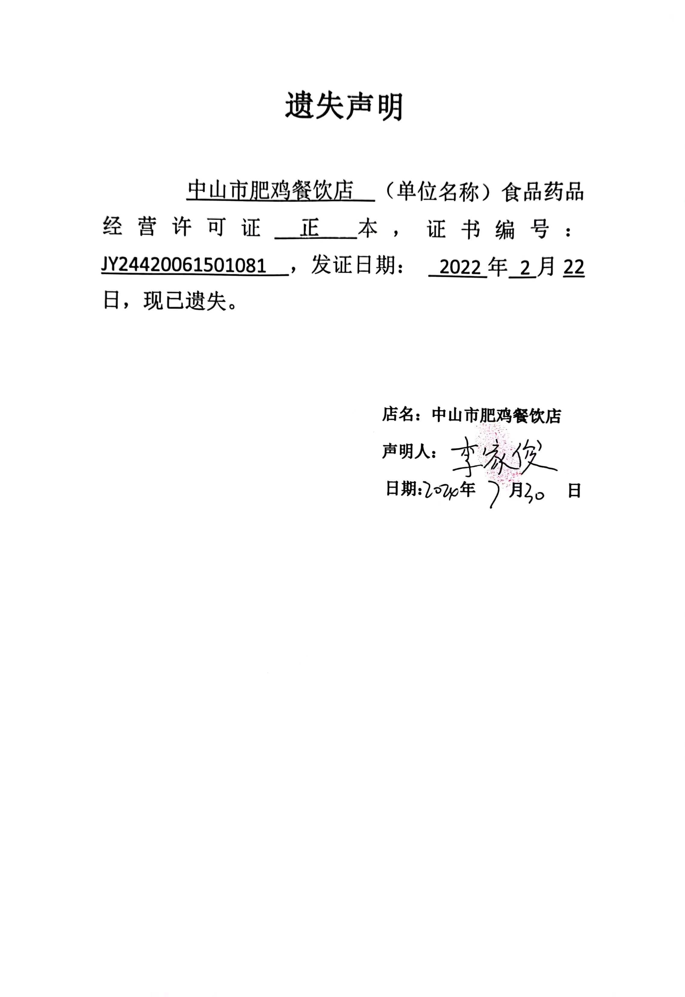 食品药品经营许可证遗失声明(中山市肥鸡餐饮店、广东龙云商旅产业发展有限公司、中山市五桂山韩小家拌饭食店)