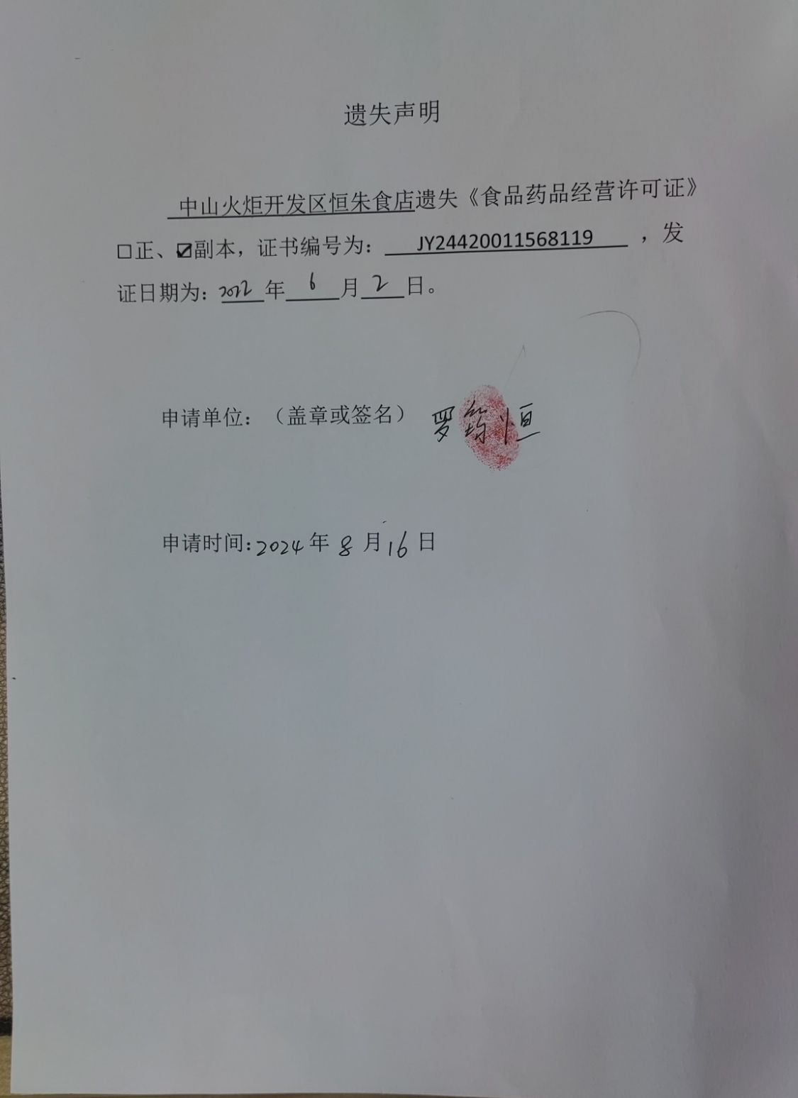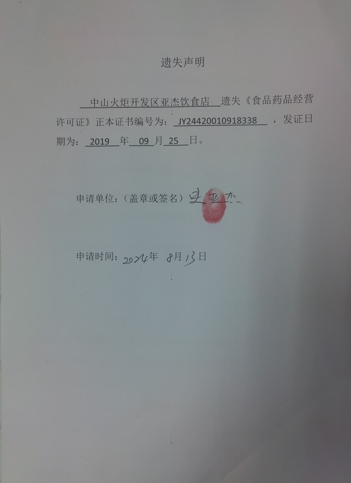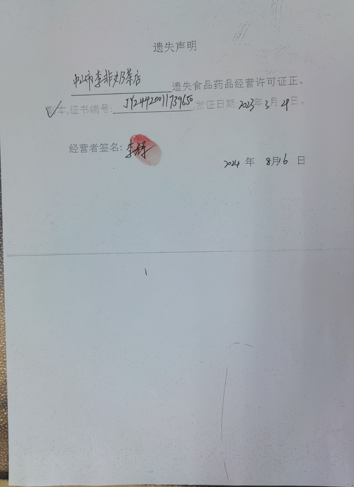 食品药品经营许可证遗失声明(中山市李非奶茶店、中山火炬开发区恒朱食店、中山火炬开发区亚杰饮食店)