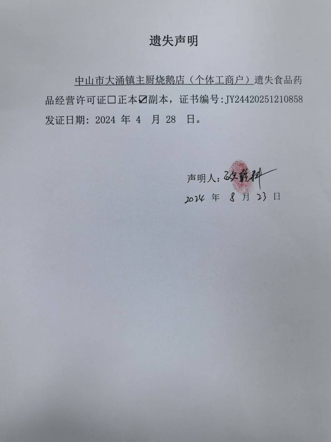 食品药品经营许可证遗失声明【中山市大涌镇主厨烧鹅店(个体工商户)】