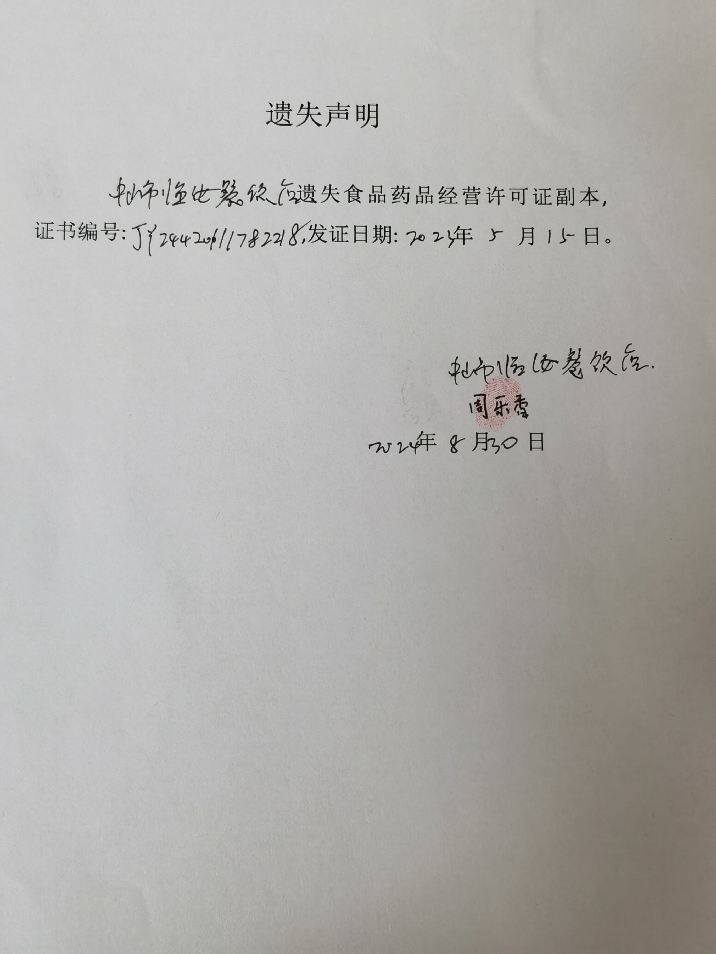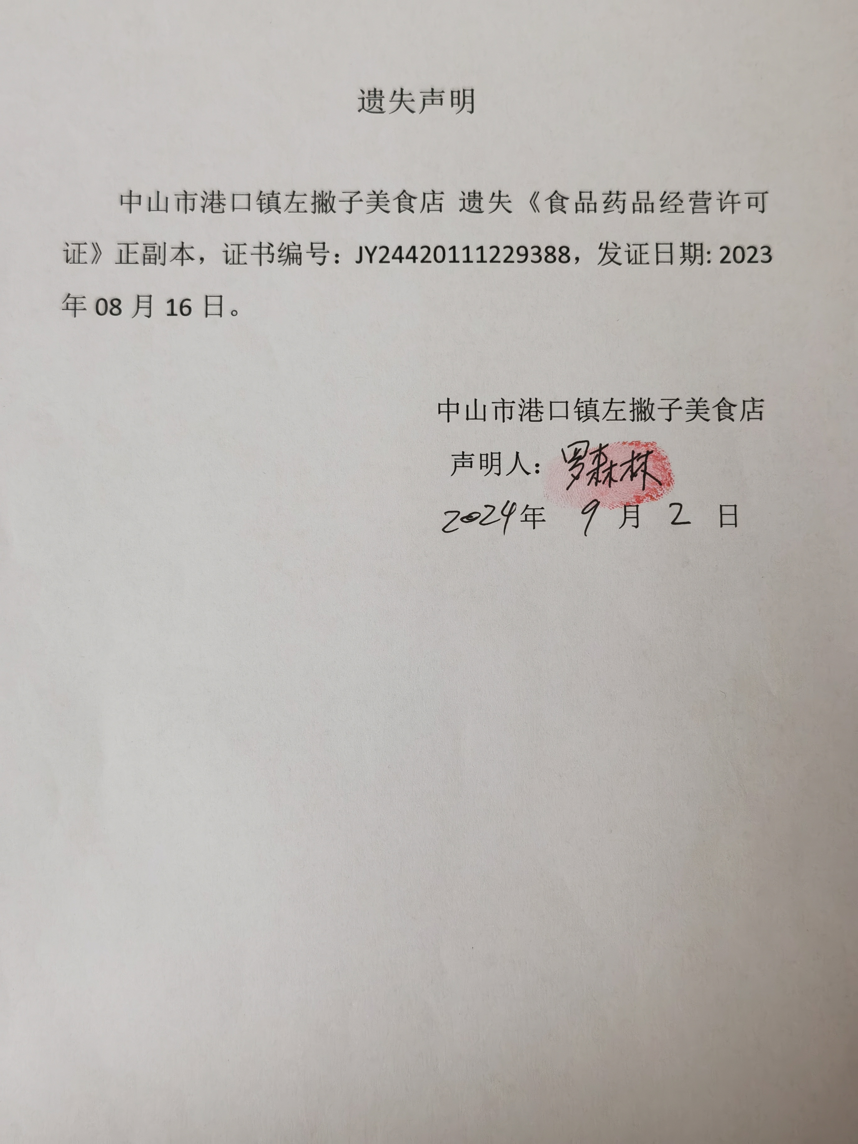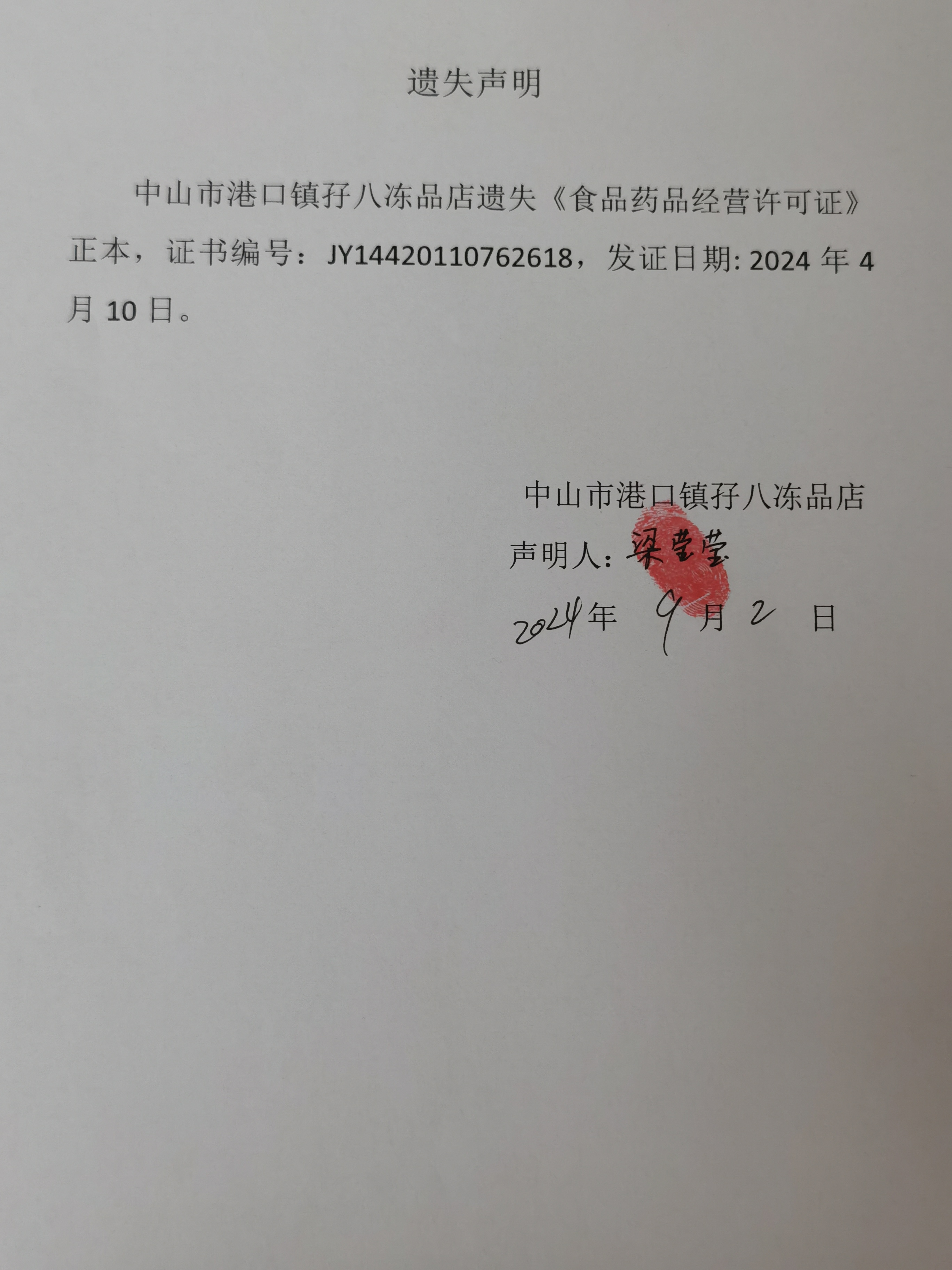 食品药品经营许可证遗失声明(中山市港口镇孖八冻品店、中山市港口镇左撇子美食店、中山市临汝餐饮店)